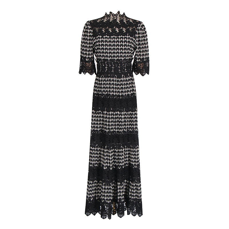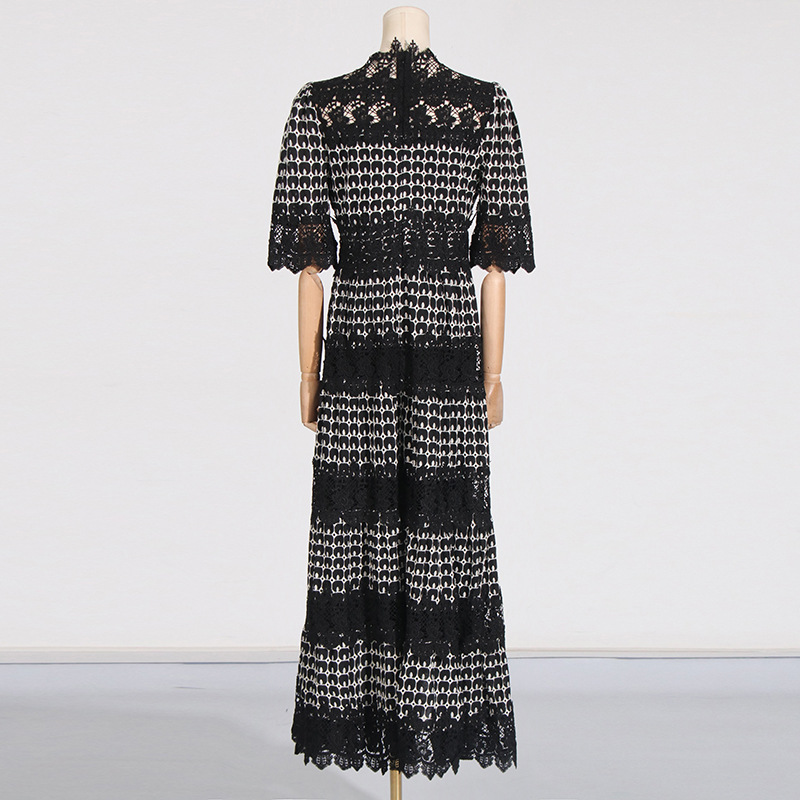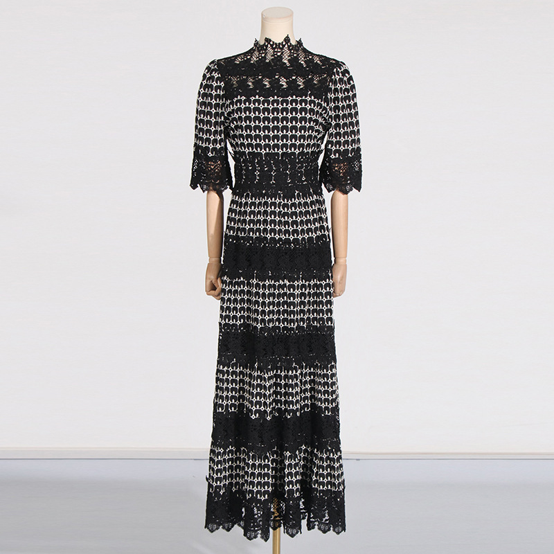 High end temperament stand up collar solid color long dress 2025 new lace embroidery design sense waist cinching long dress for women