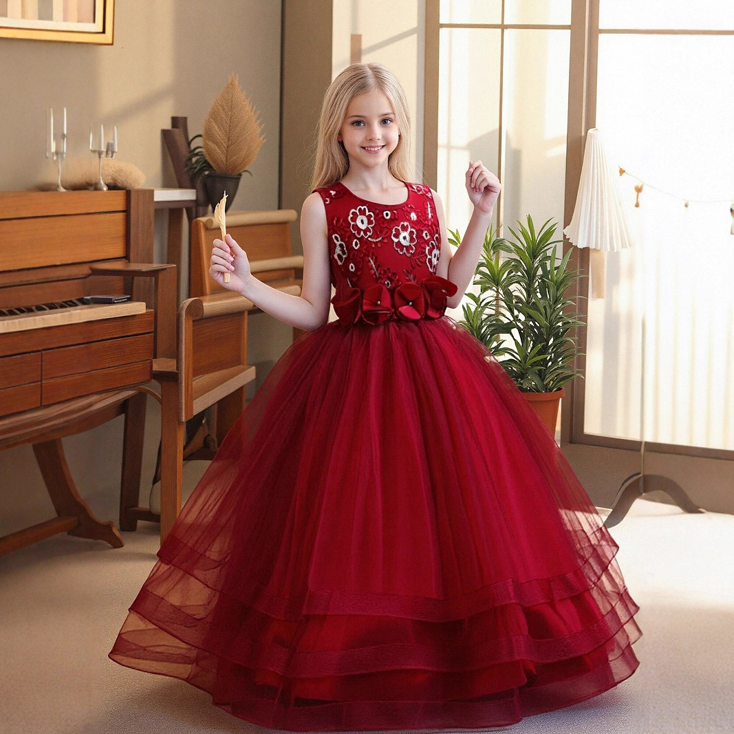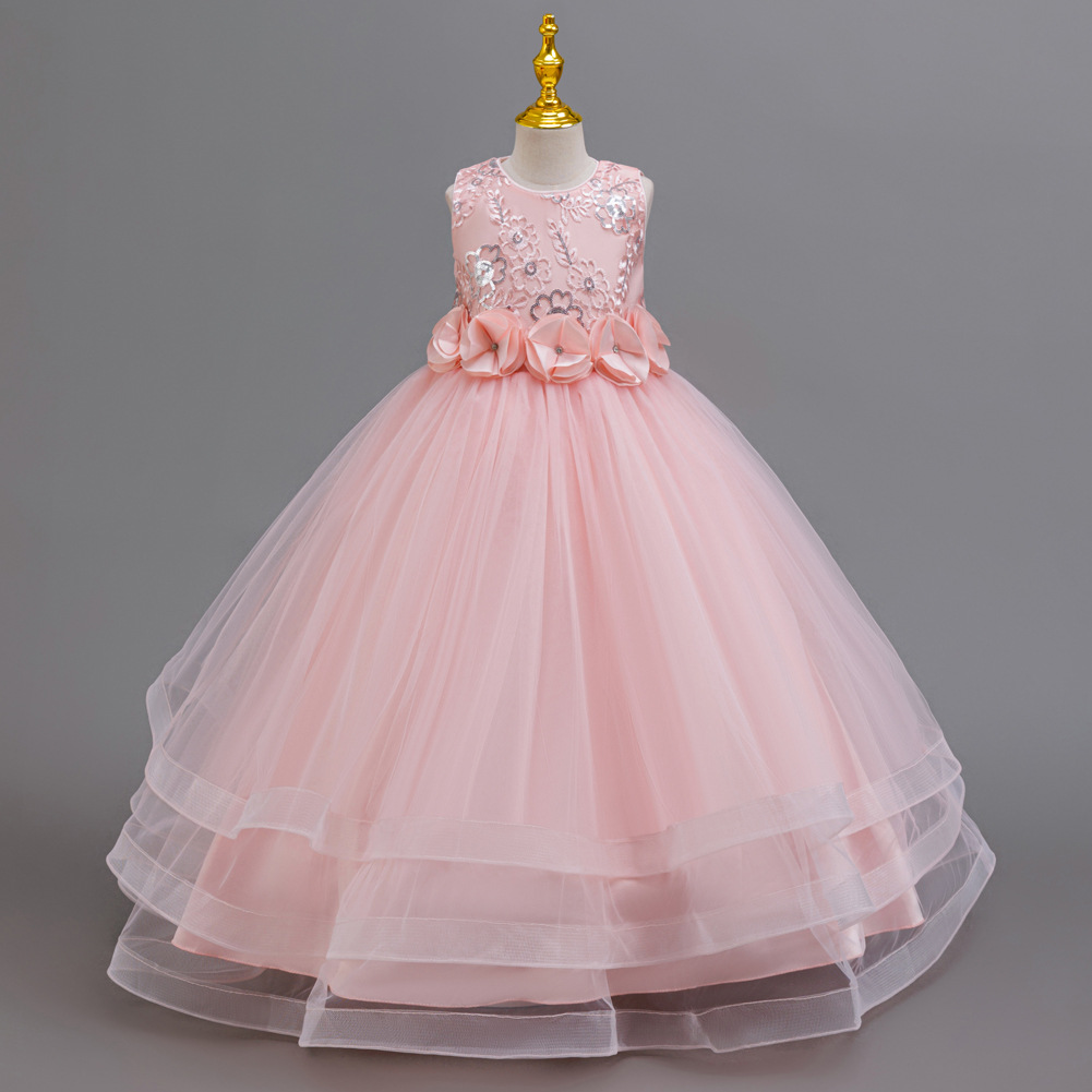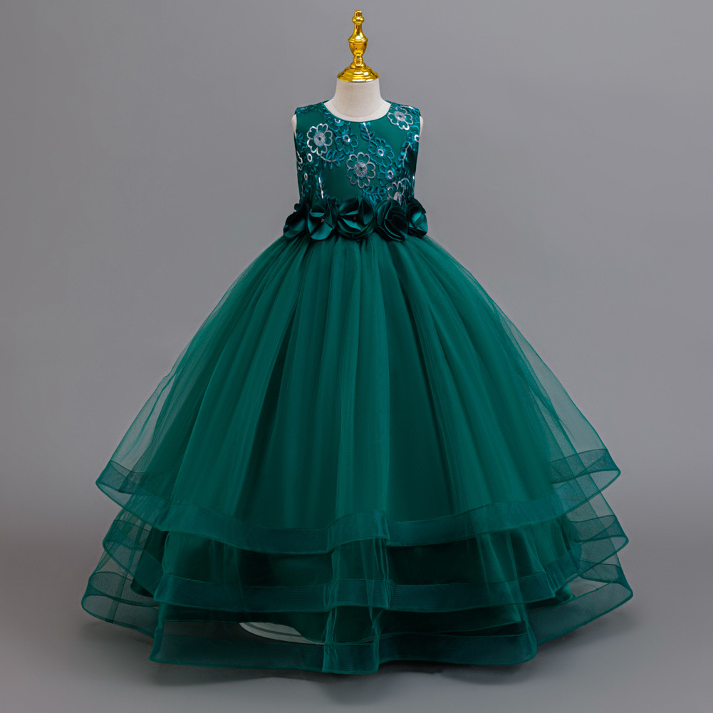 Cross border New Children's Dress Embroidered Flower Princess Dress, Large Children's Long Lace Wedding Dress, Host Performance Dress