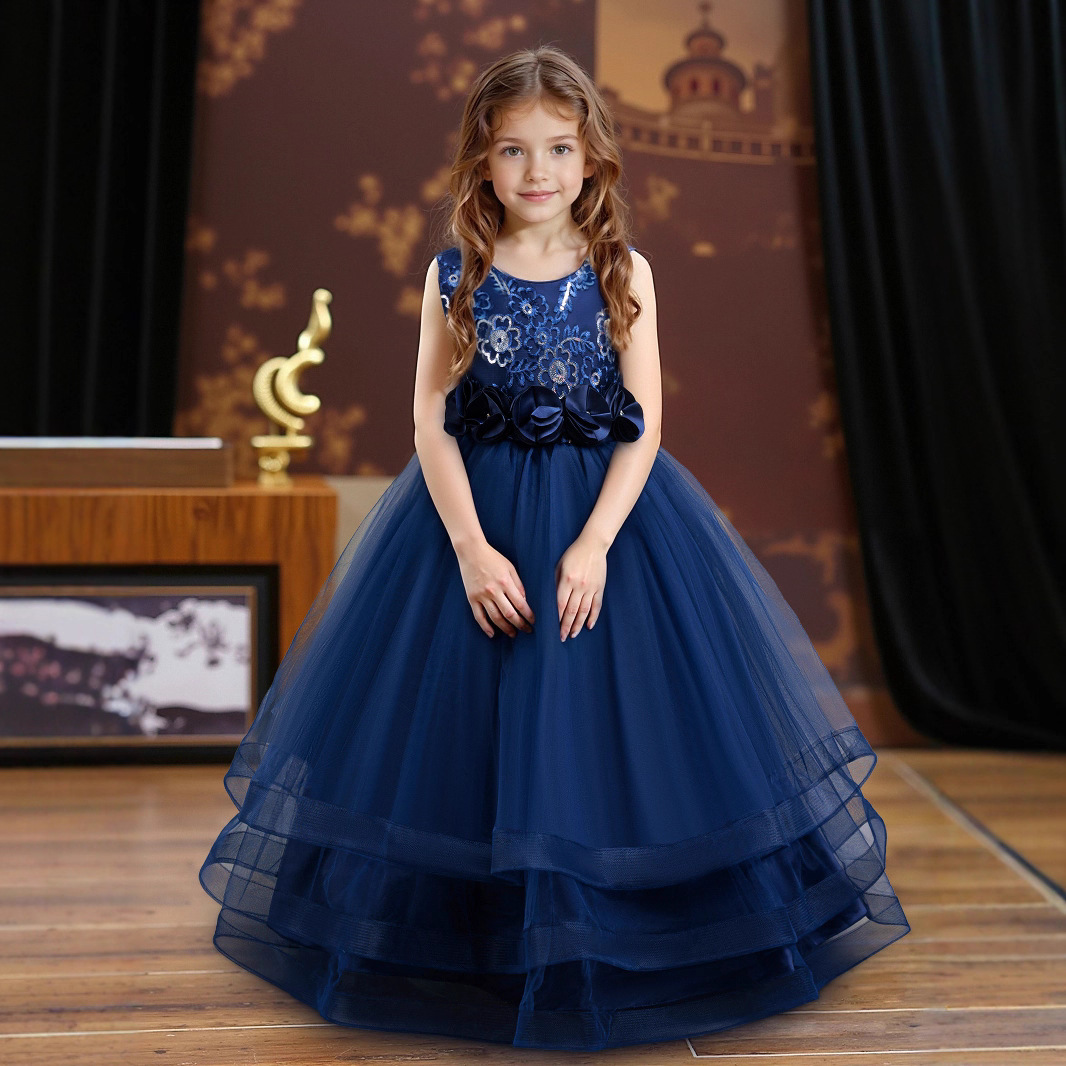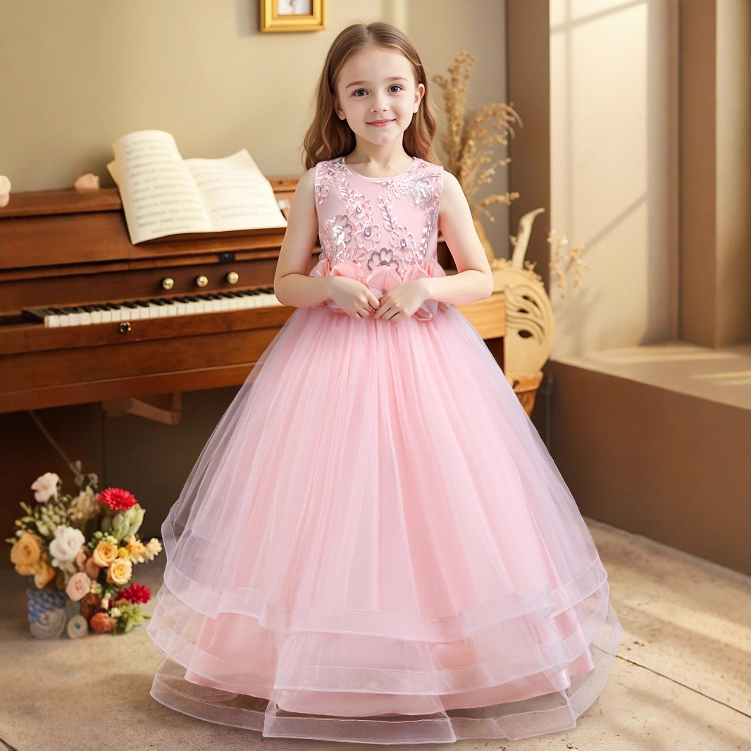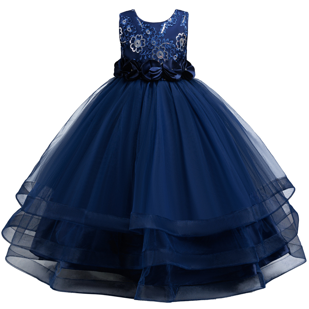 Cross border New Children's Dress Embroidered Flower Princess Dress, Large Children's Long Lace Wedding Dress, Host Performance Dress