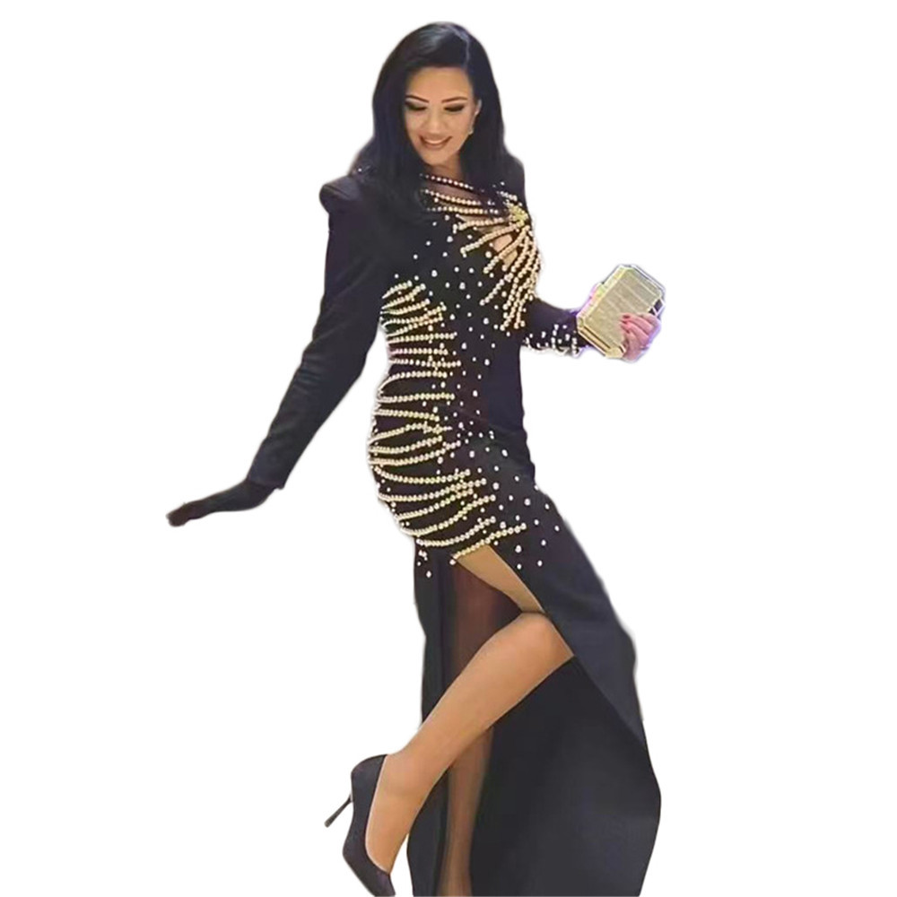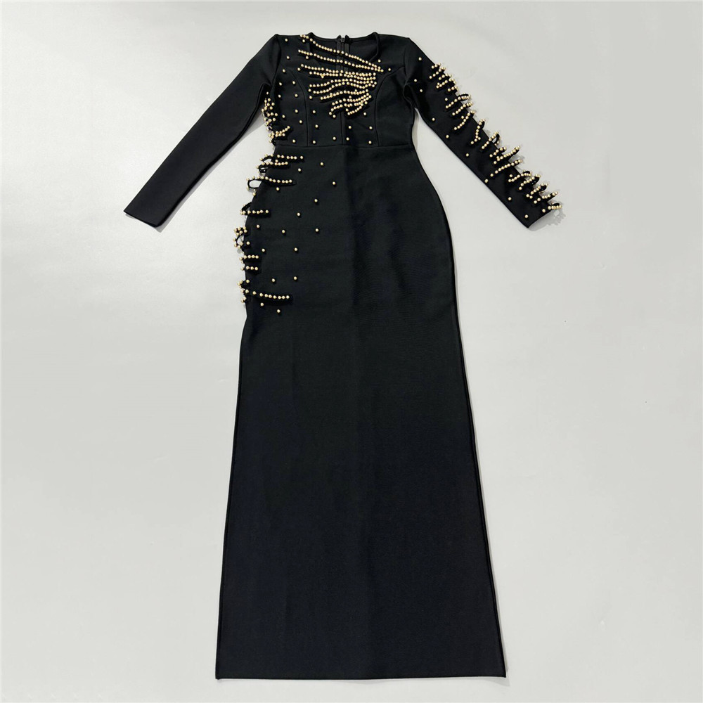European and American cross-border new sexy V-neck hollow out heavy industry nail bead long sleeved bandage skirt socialite banquet evening gown jumpsuit