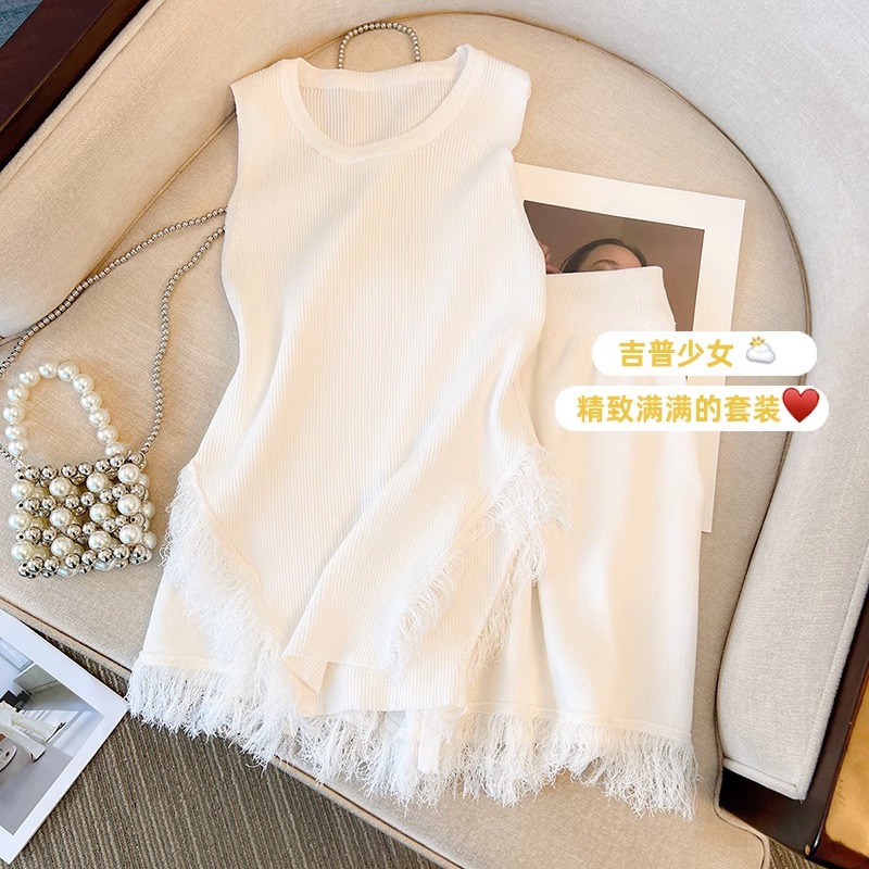 French style sweet and spicy top set for women, pink tassel knitted small camisole vest+high waist wide leg casual shorts