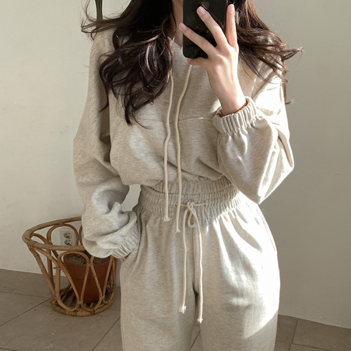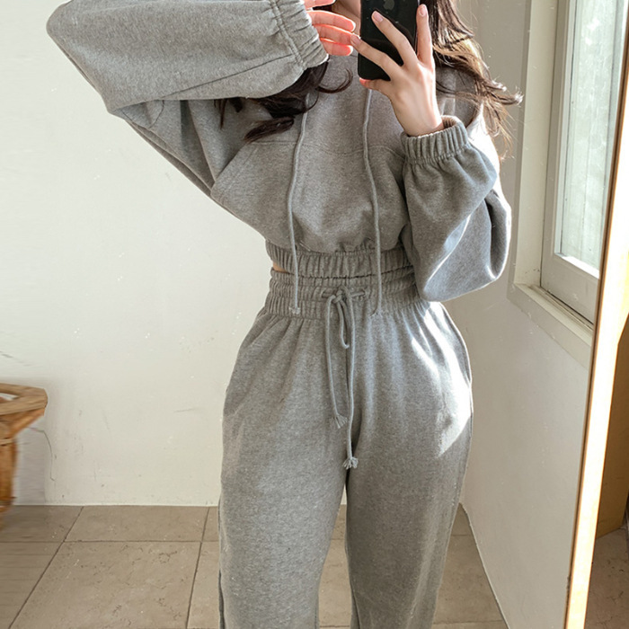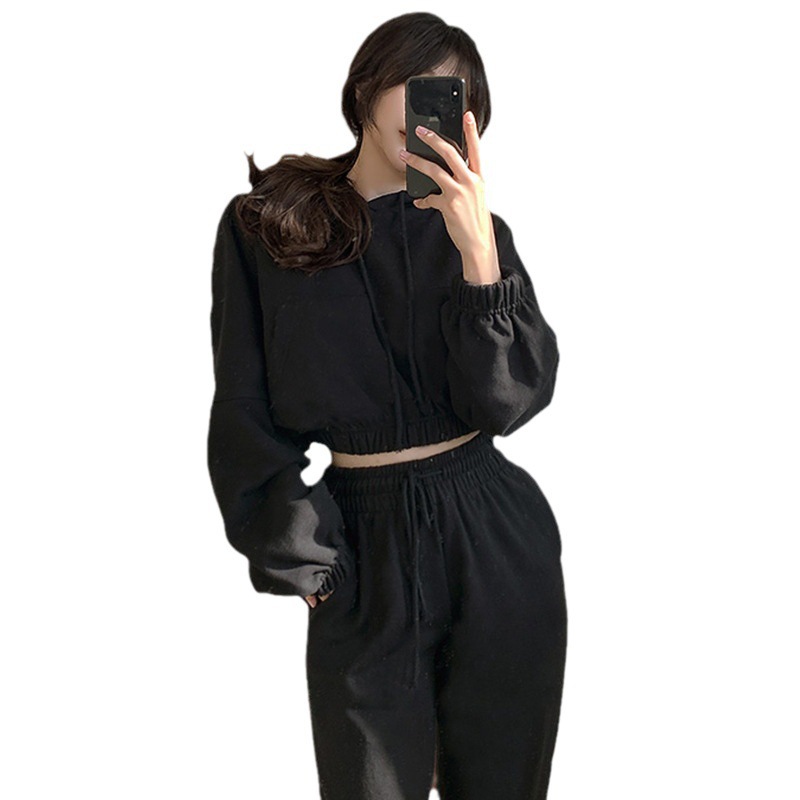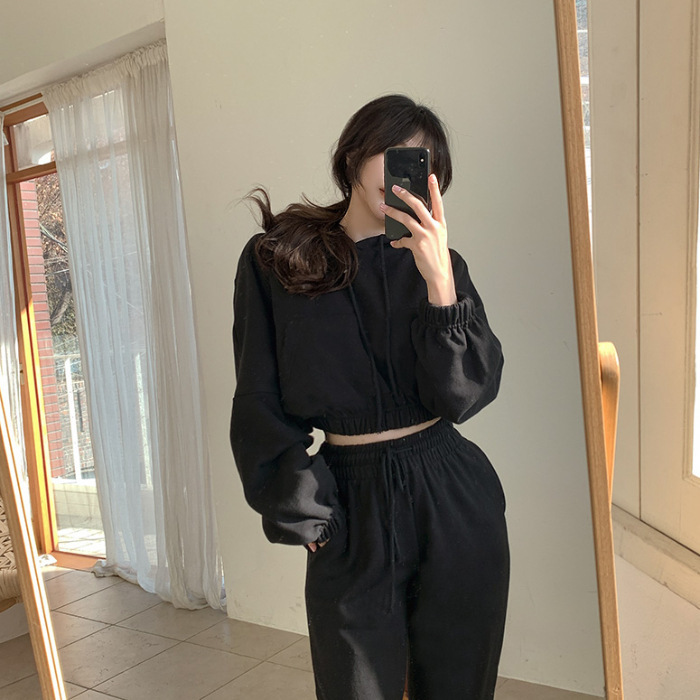 Autumn and winter new set women's sports style two-piece set women's niche short hooded sweatshirt+drawstring pants leg binding pants