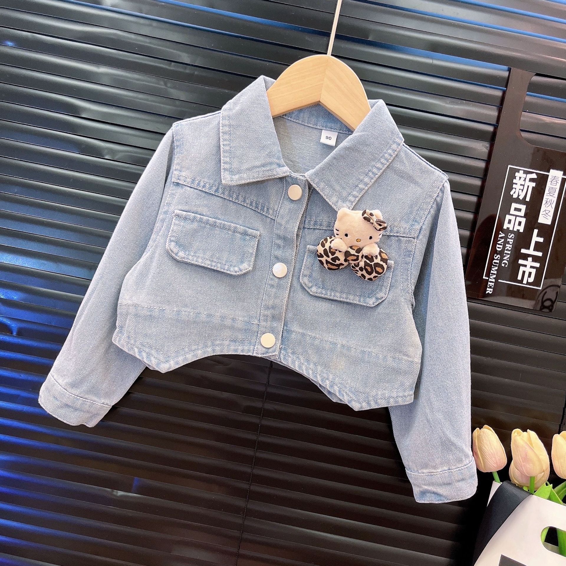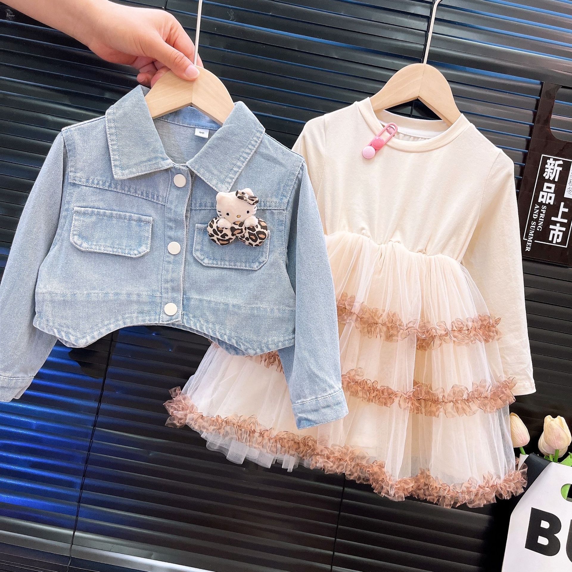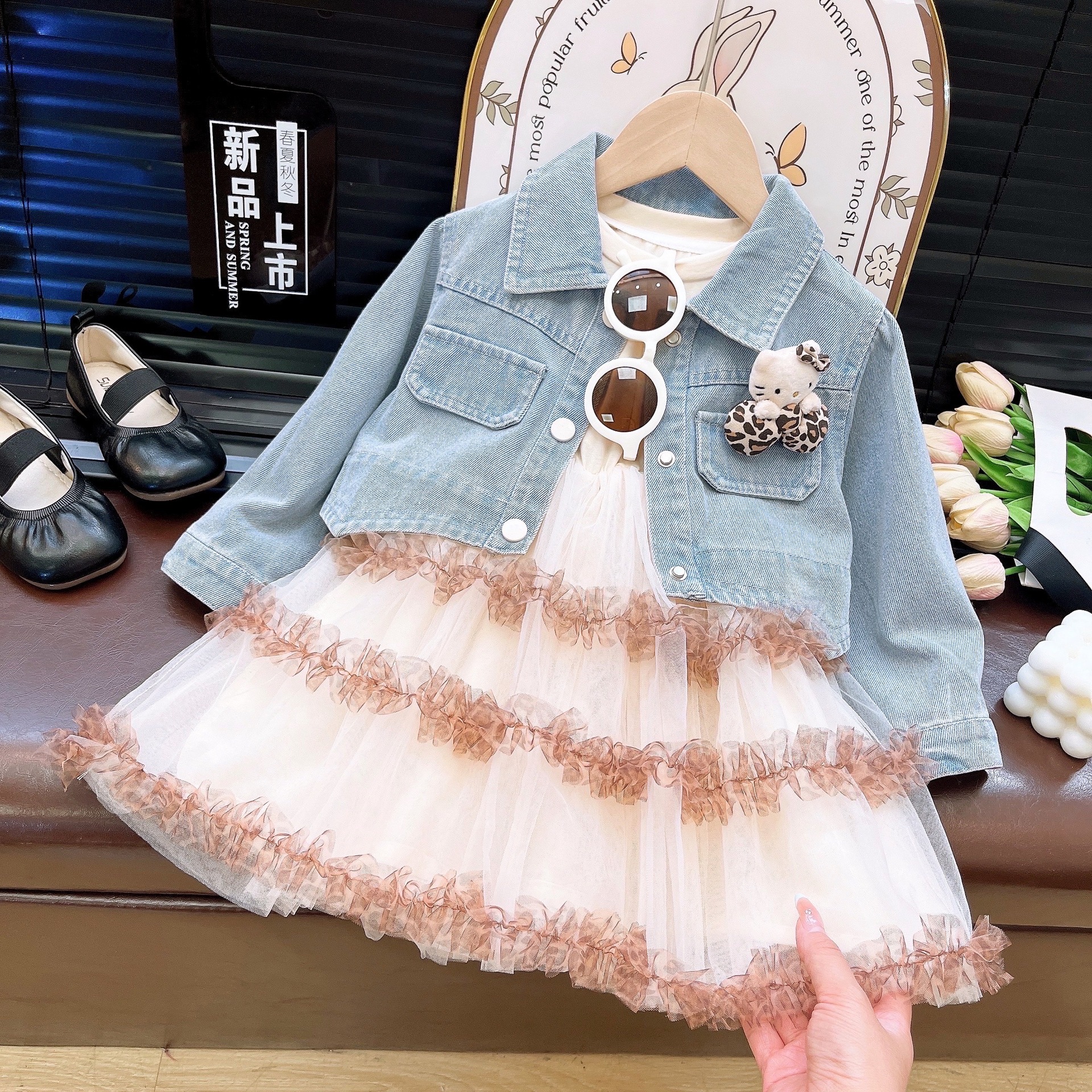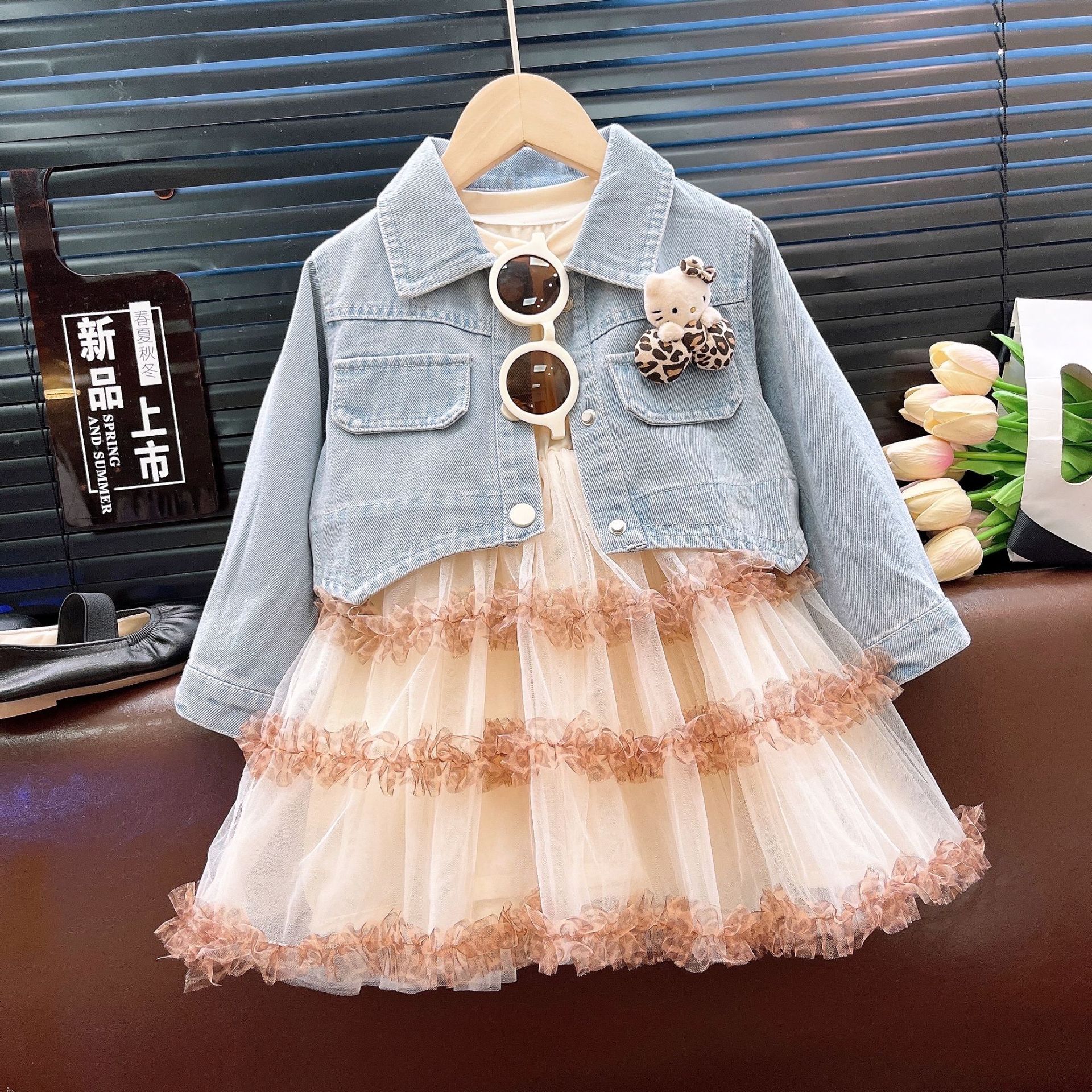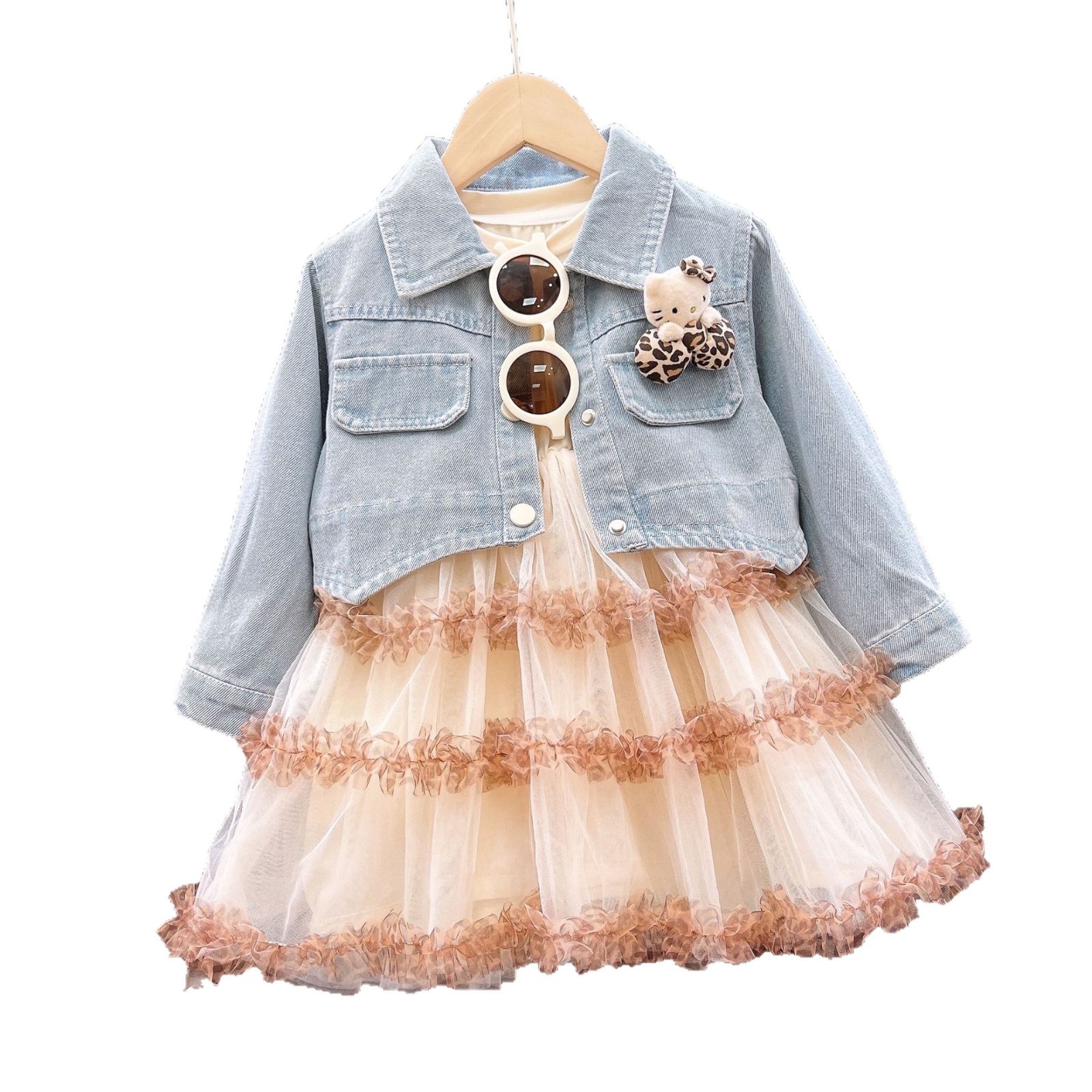 2025 autumn girls' dress set, fashionable denim jacket, fluffy mesh princess dress, gift doll brooch