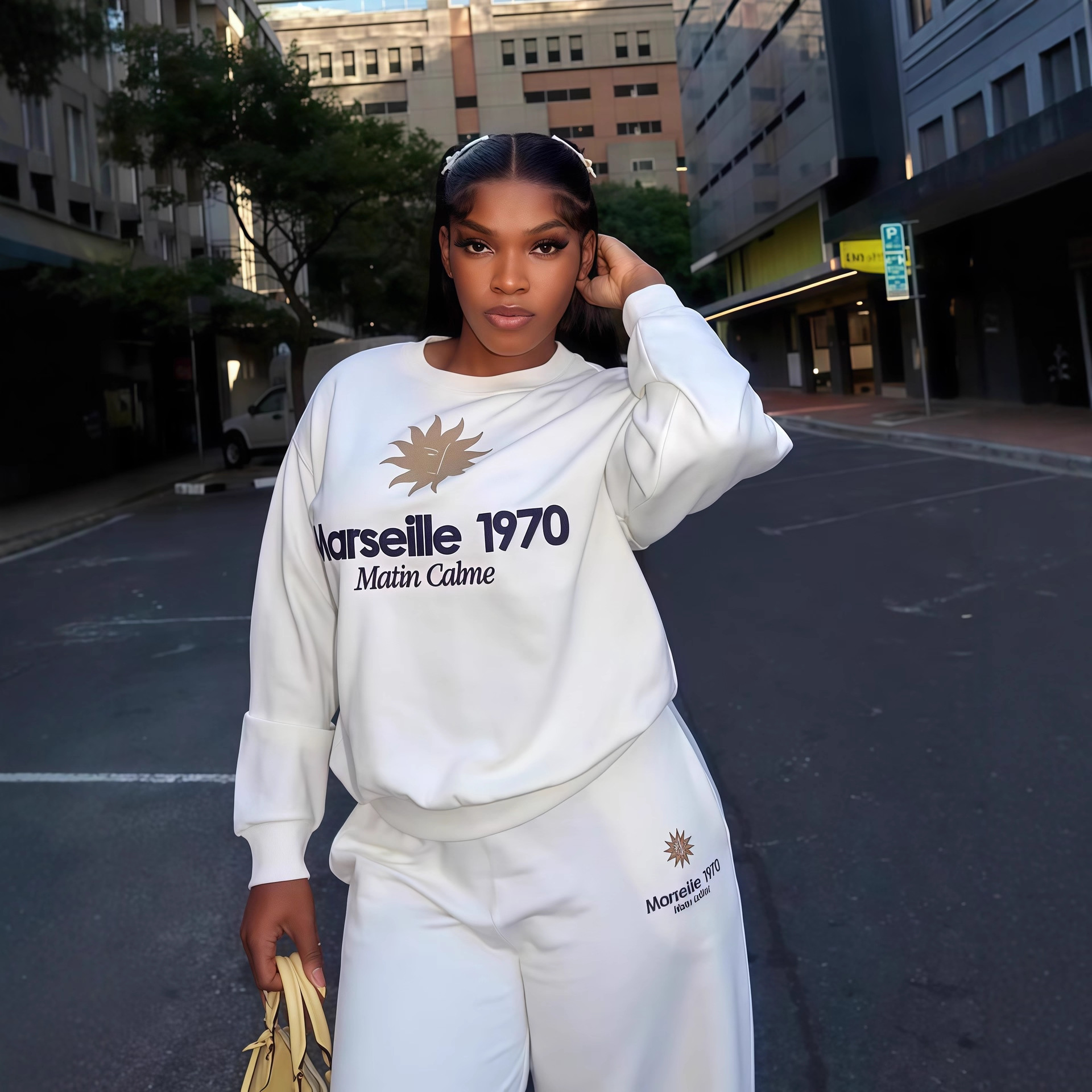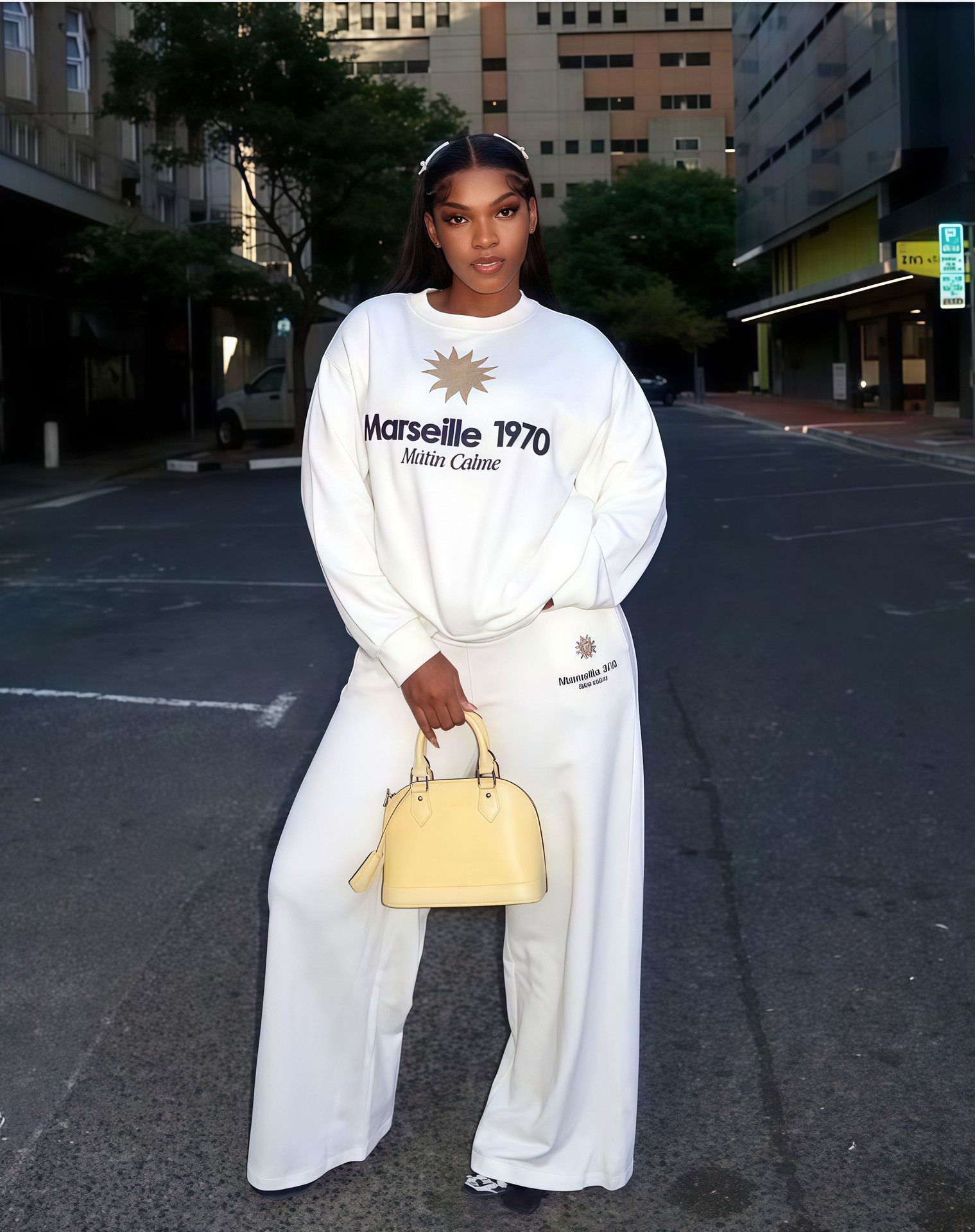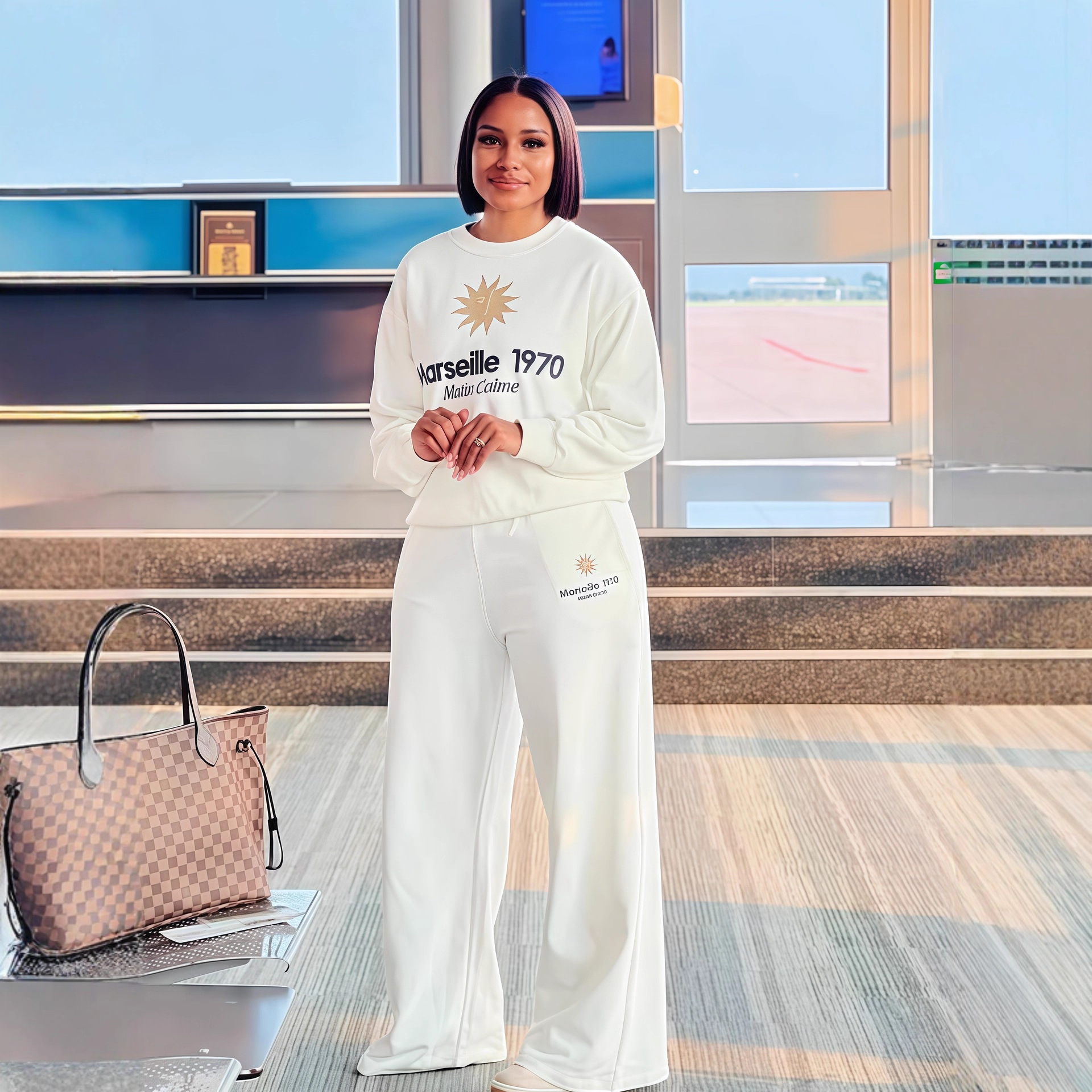 European and American cross-border women's clothing 2025 autumn new item solid color long sleeved round neck printed top loose wide leg casual suit