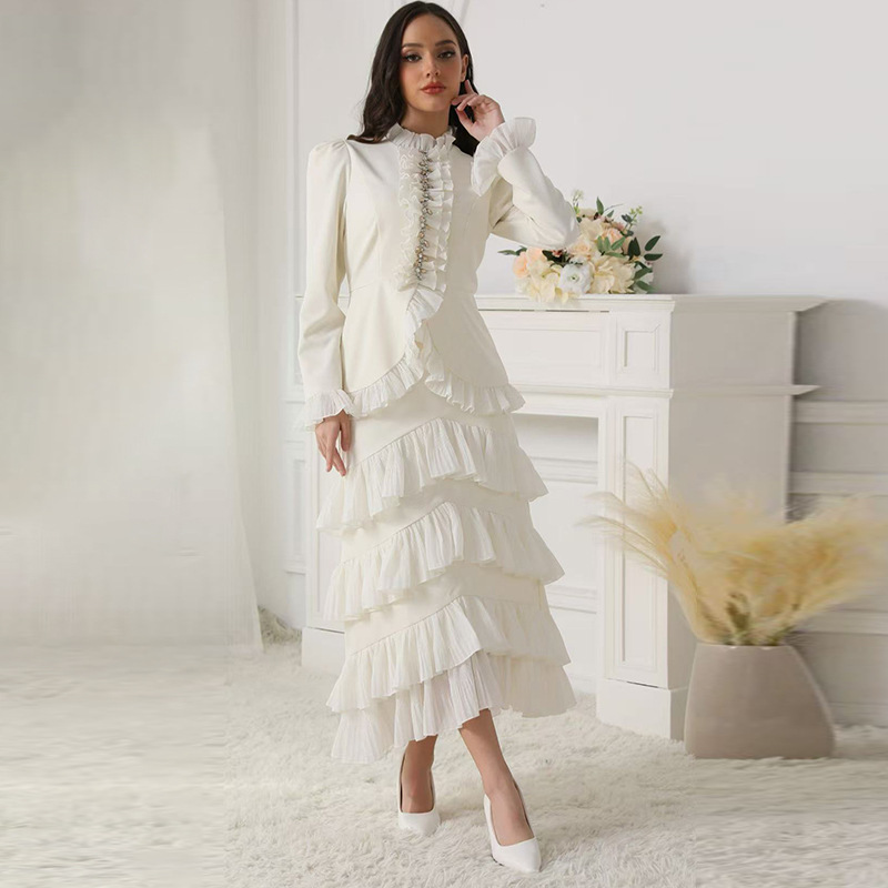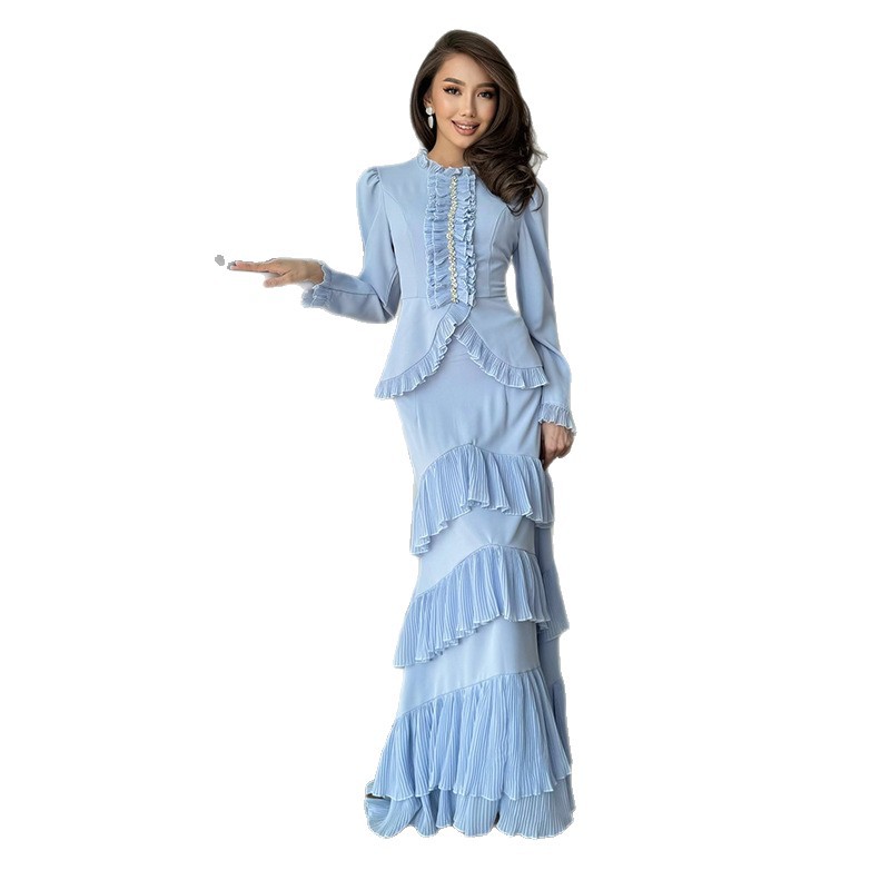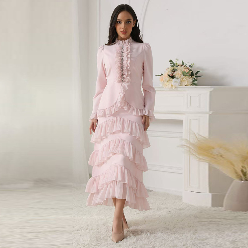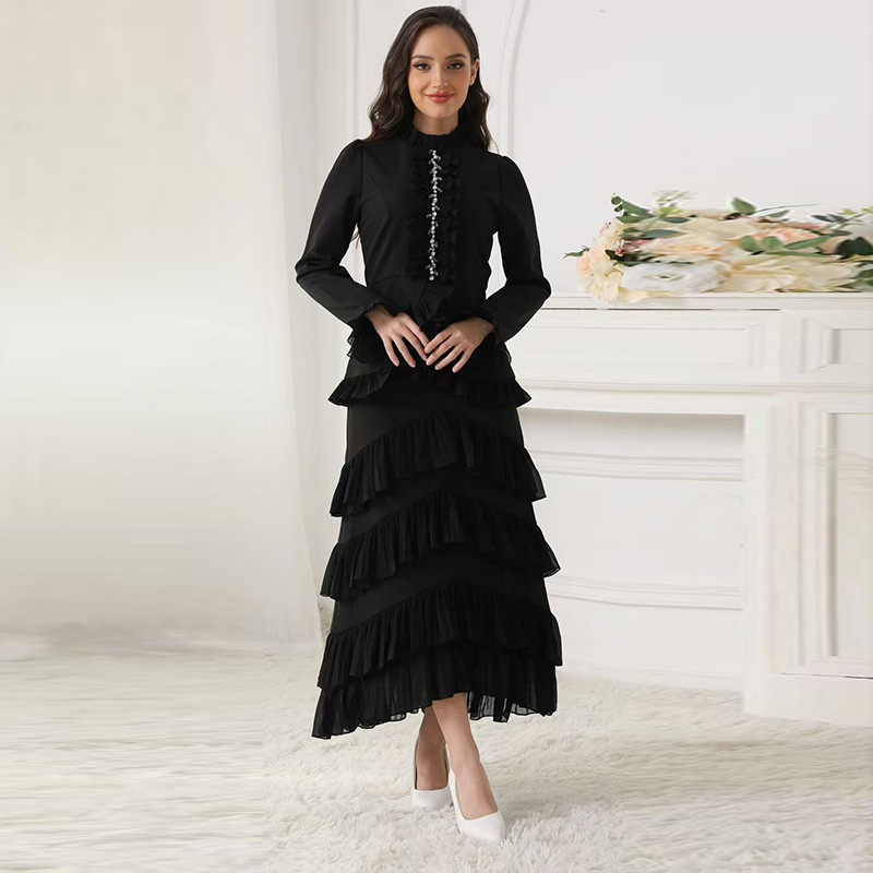 Fashionable and Sweet Style Solid Color Set 2025 New Style Black Fungal Edge Inlaid Diamond Long Sleeve Top+High Waist Folded Cake Skirt