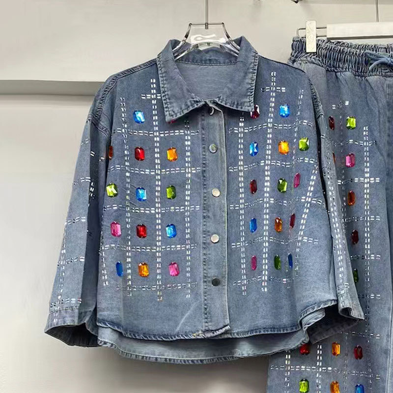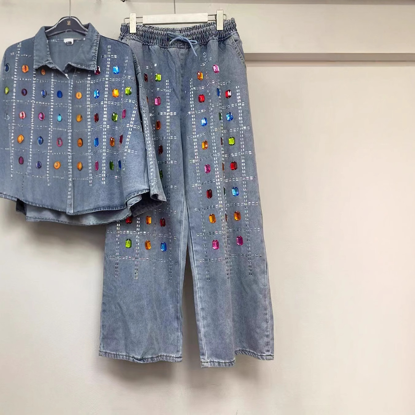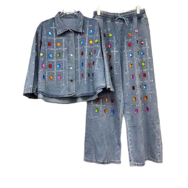 European niche design sense 2025 spring new denim suit women's heavy industry diamond inlaid jacket straight leg pants two-piece set
