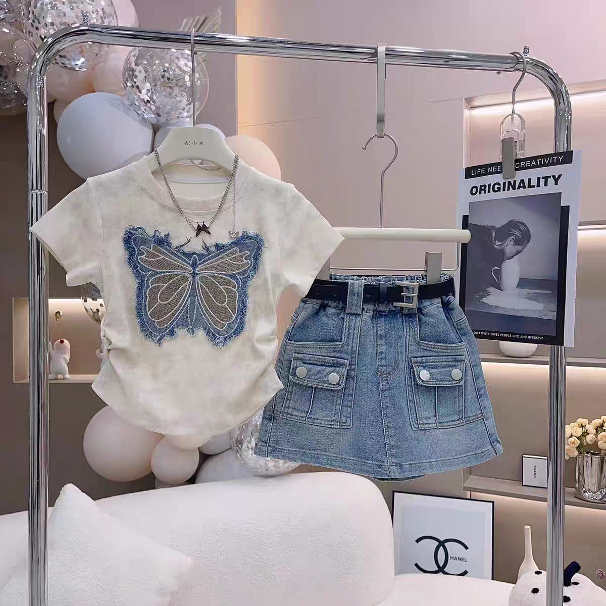 Girls' 2024 Summer New Children's Clothing Personalized Bow Embroidered Top with Cowboy Skirt Set