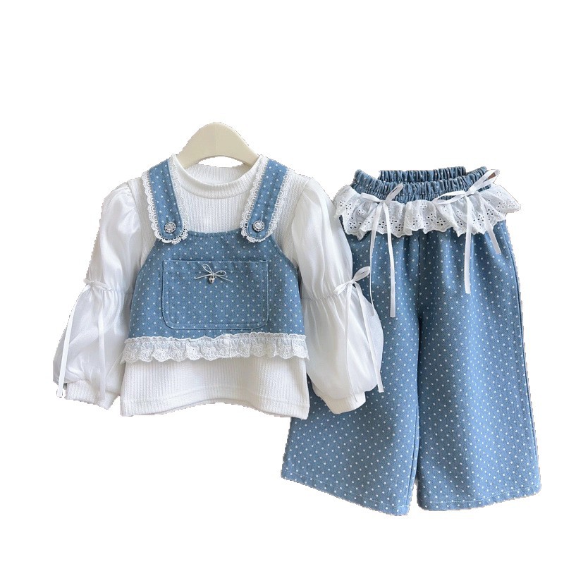 Women's clothing 2025 autumn new collection, polka dot denim three piece set, cute and fashionable women's treasure set, cross-border children's clothing
