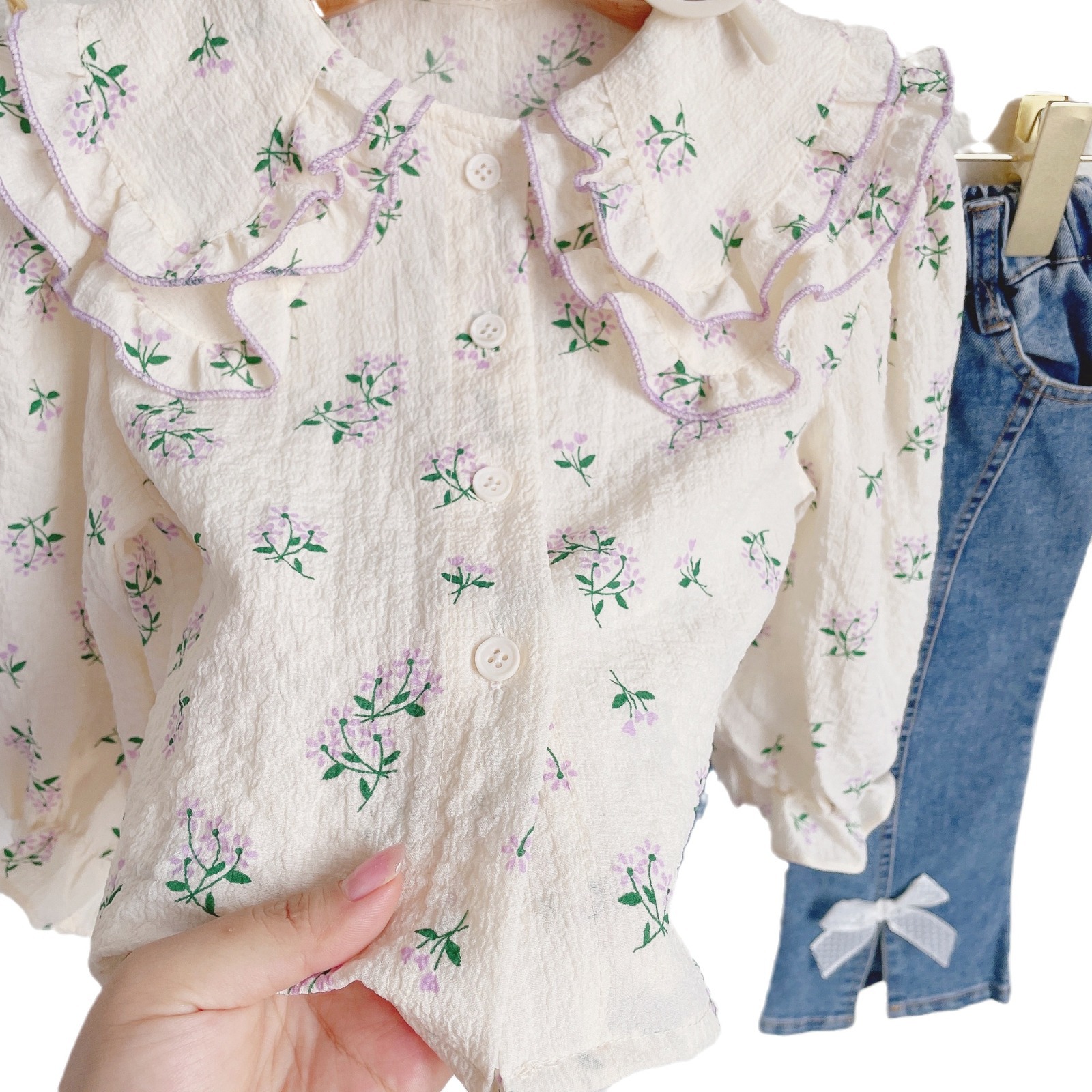 Ancorelala Autumn New Women's Clothing Cute Floral Shirt with Bow Jeans Two Piece Set