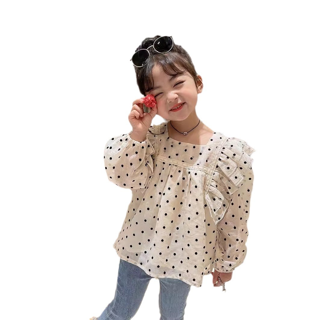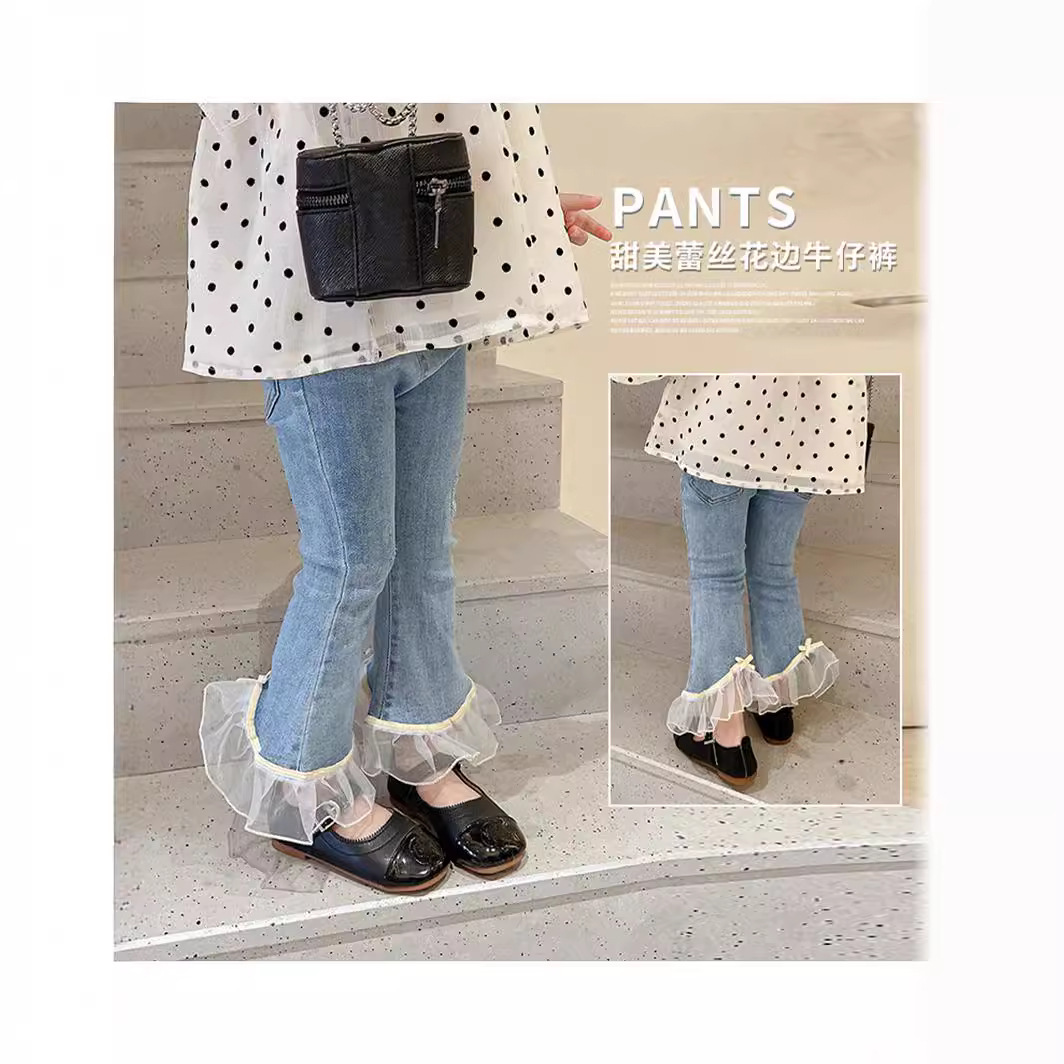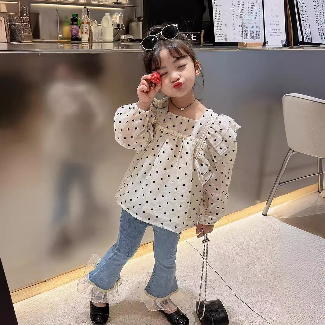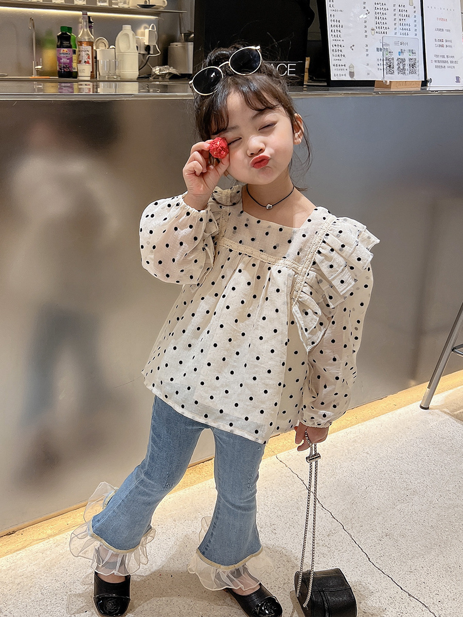Ancorelala autumn new children's clothing, girls' polka dot doll, top with lace denim jeans set