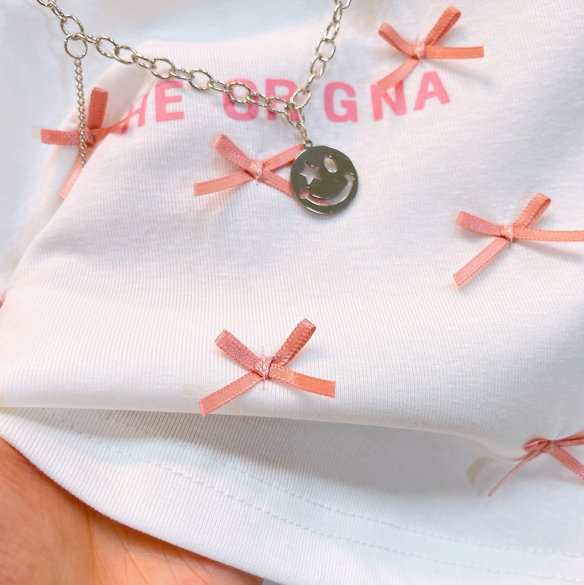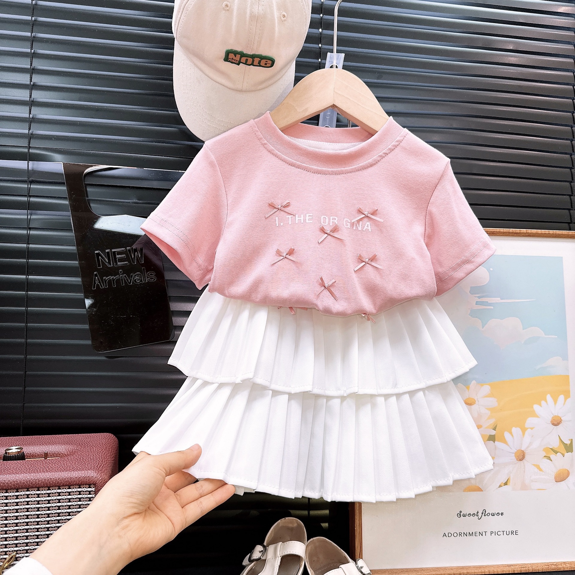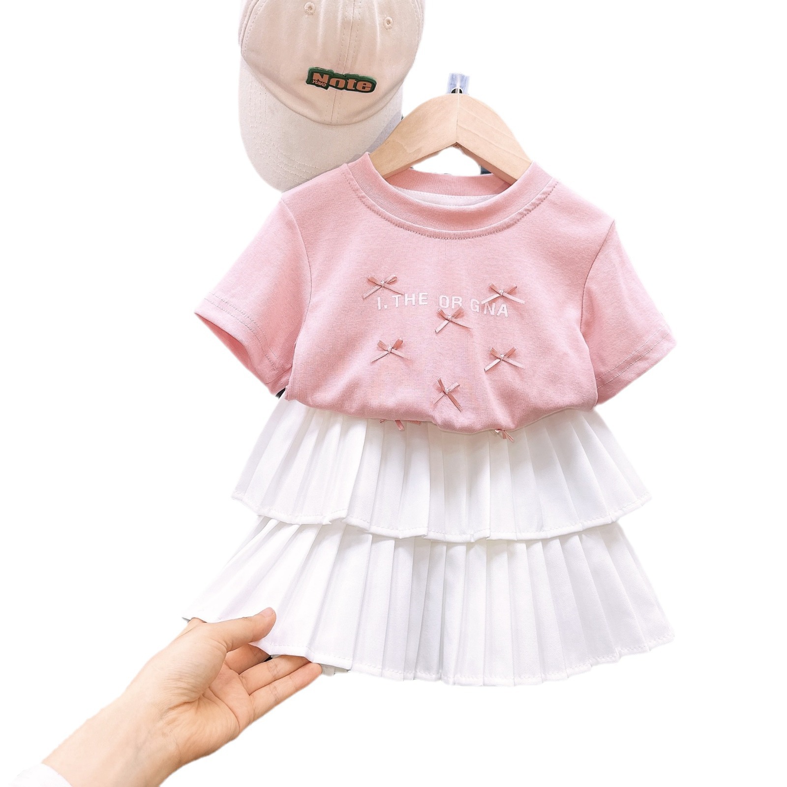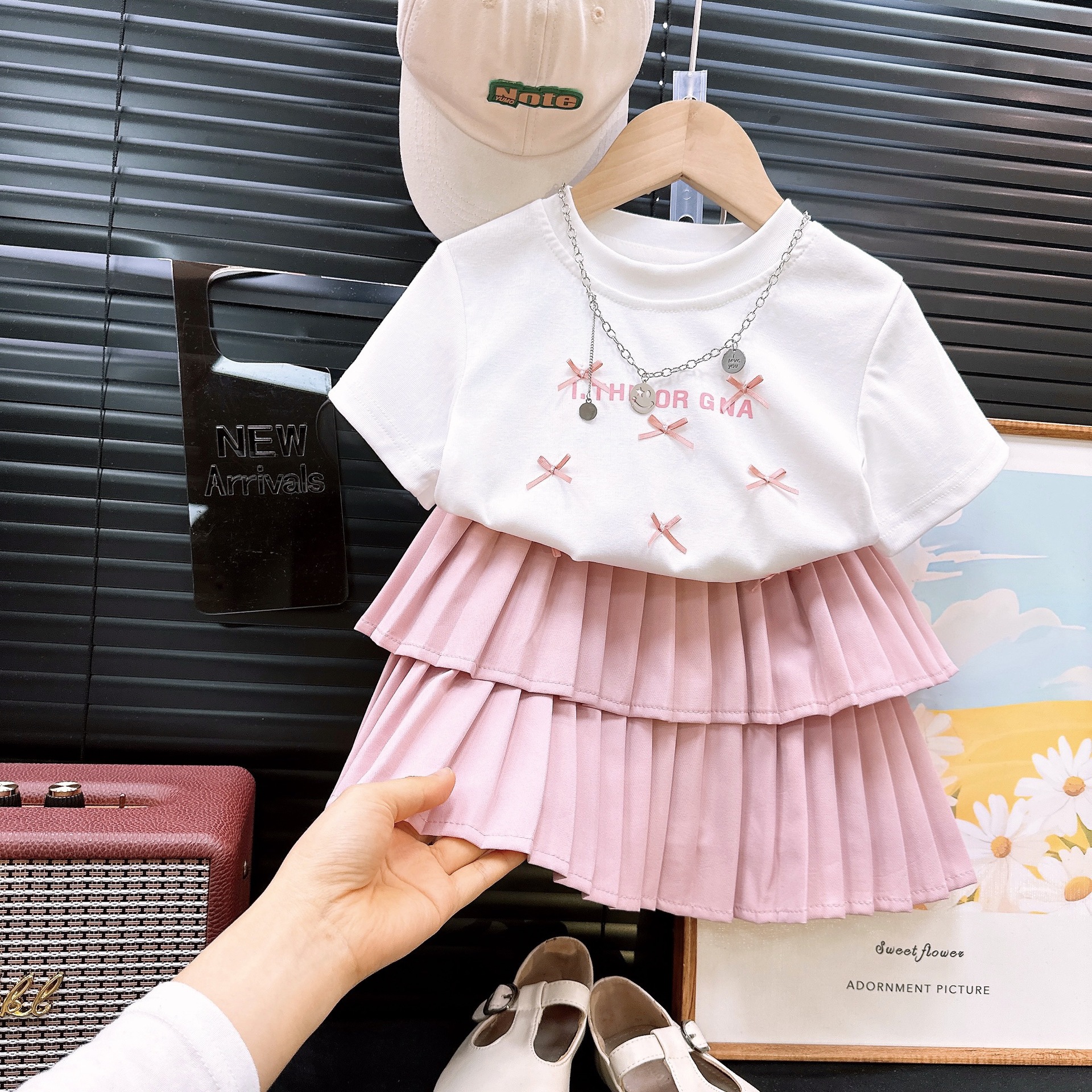 2418X Girls' Clothing 2024 New Cute Bow Short sleeved Top with Hundred Fold Skirt Two Piece Set for Girls
