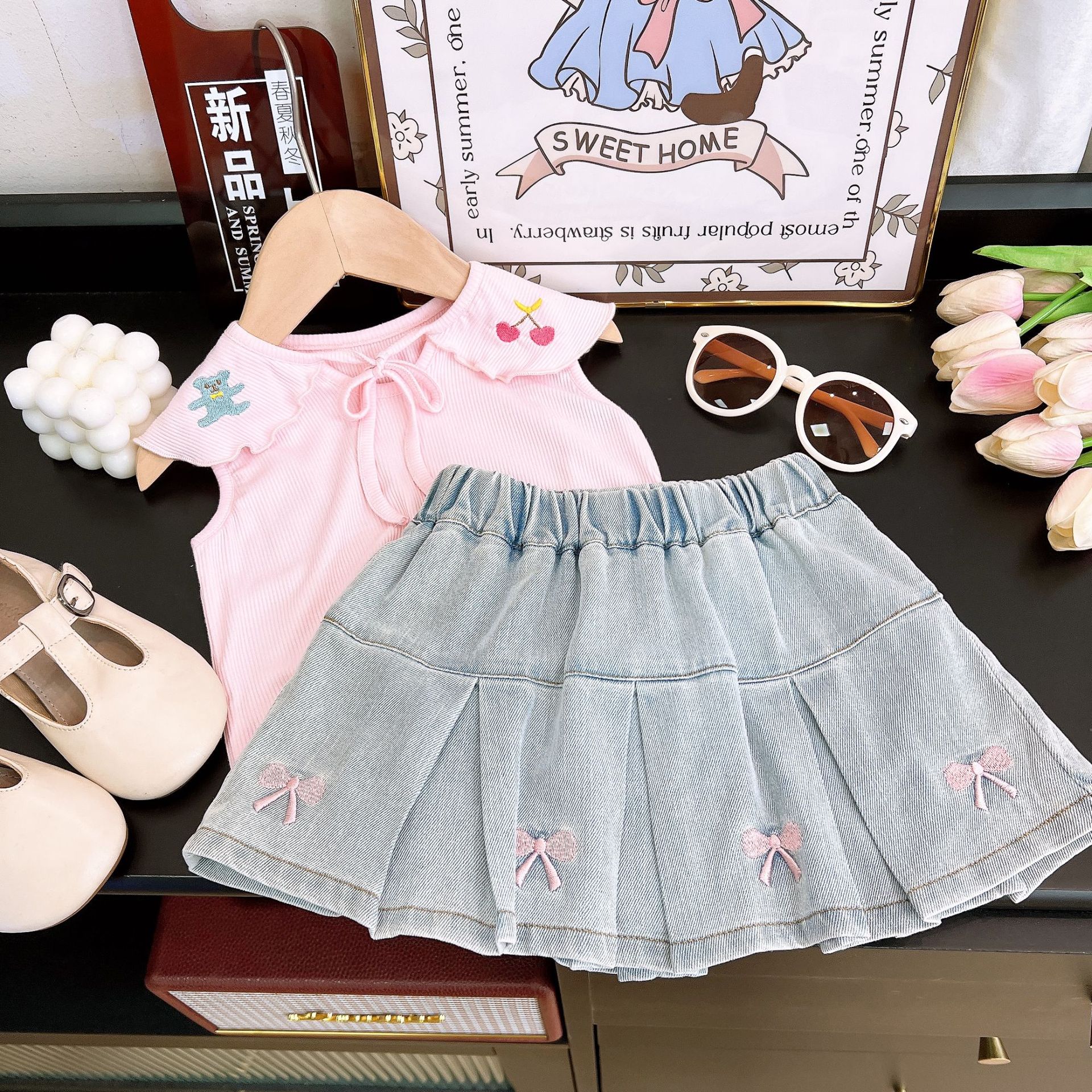 Girl's 2025 Summer New Children's Clothing Cute Collar Embroidered Sleeveless Top with Bow Denim Skirt Set