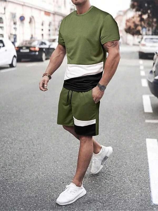 European and American foreign trade summer new trendy men's simple 3D printed color blocked short sleeved T-shirt set men's 2-piece set wholesale