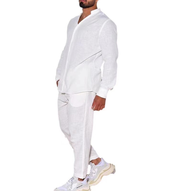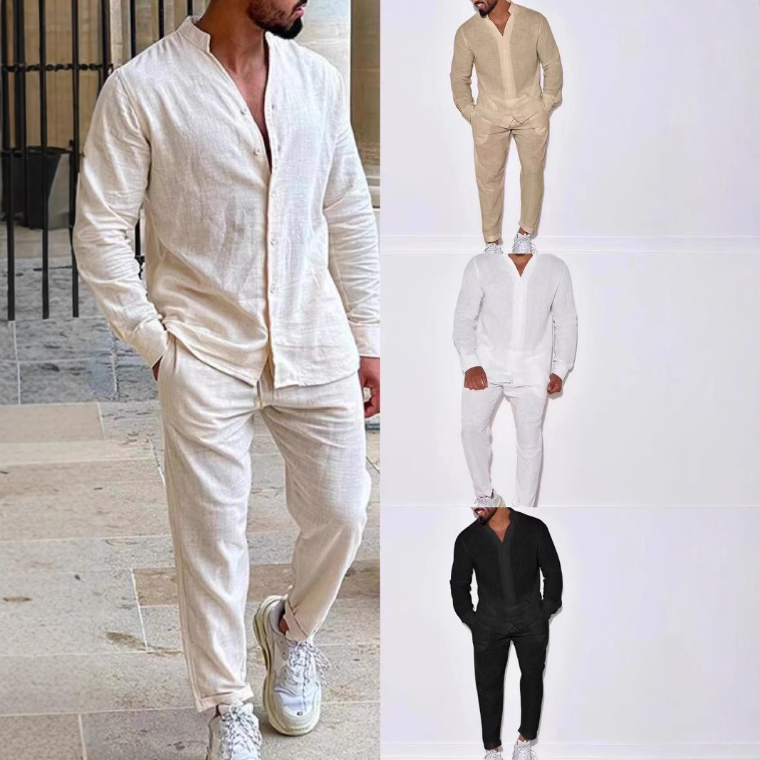 Cross border AliExpress Europe and America Men's Linen Autumn Casual Long Sleeve Set Fashion workwear Long pants Sports two-piece set