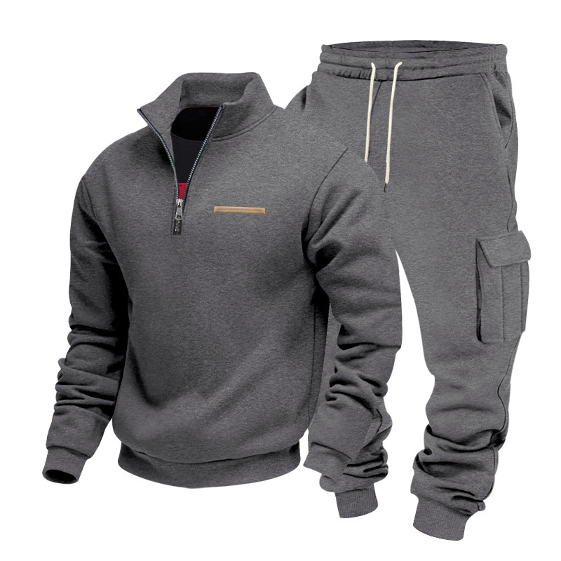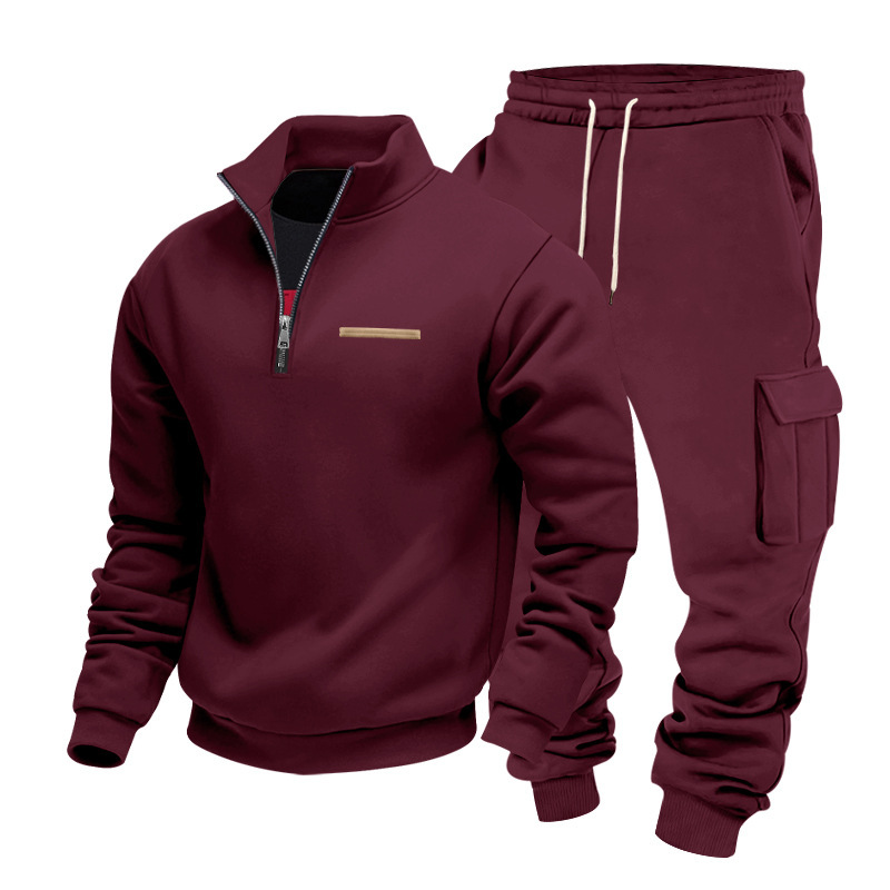 Independent Station Large Size Winter Plush Half Cut Zipper Stand up Collar Set Solid Color Casual Hoodie Work Pants Set for Men