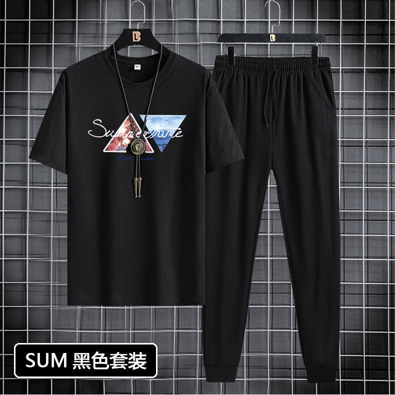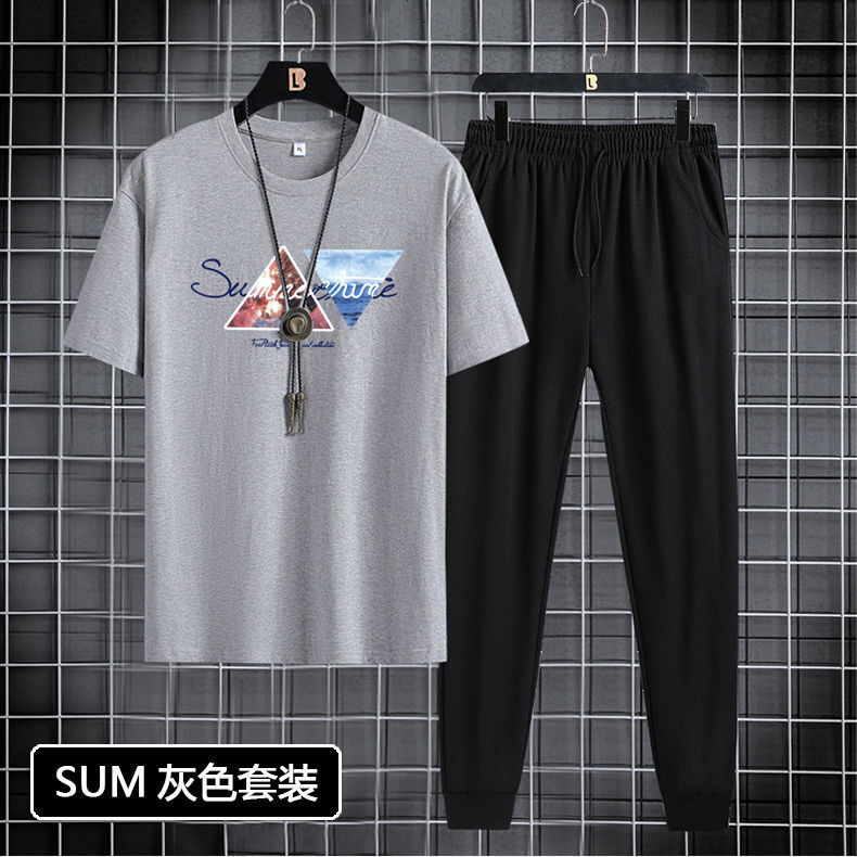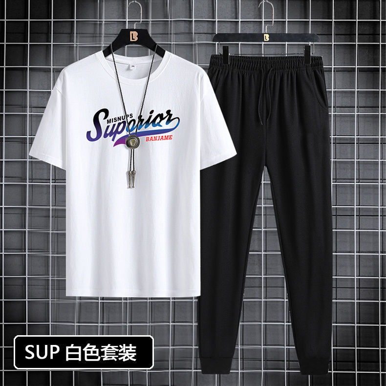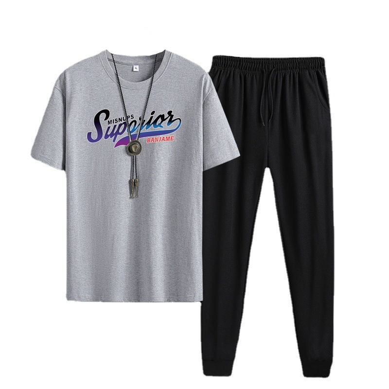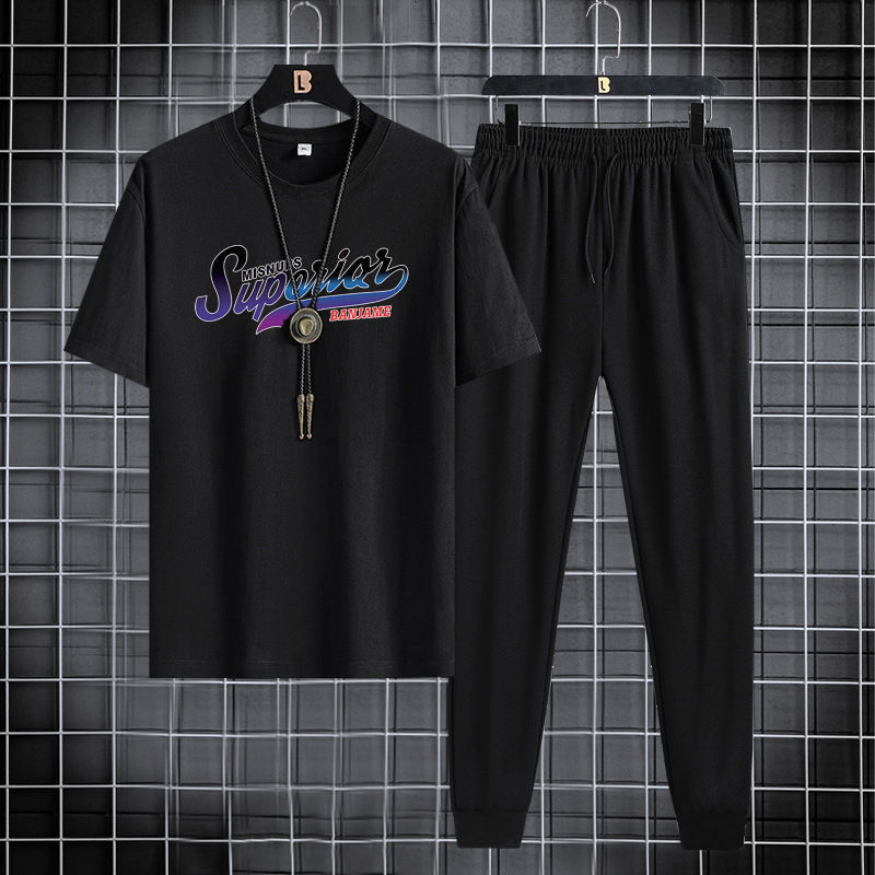 Short sleeved and long pants set for men in 2024, suitable for youth and men's sports and leisure. Round neck printed two-piece set, Korean version, casual