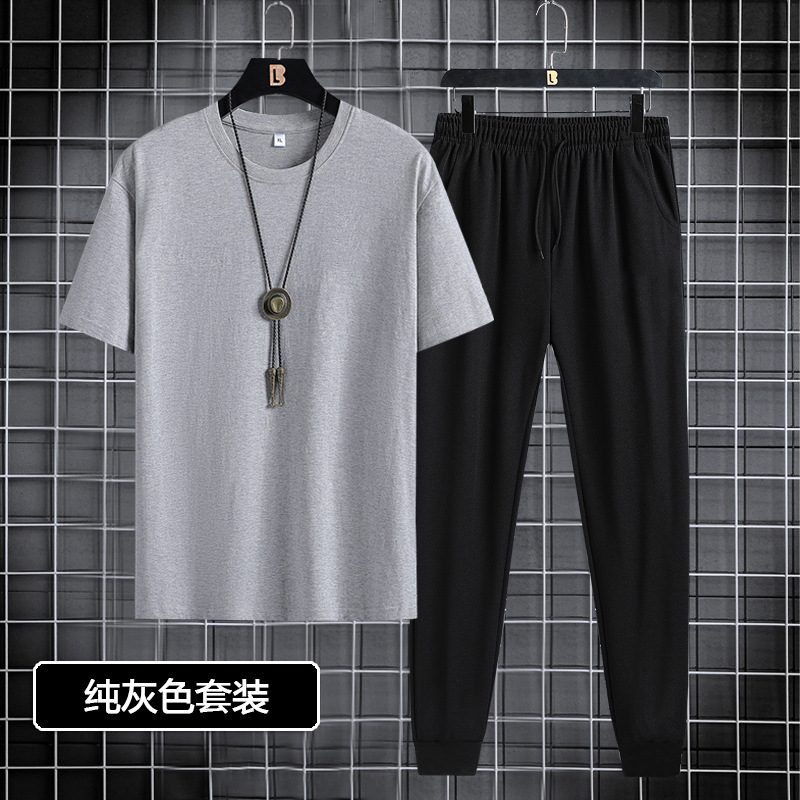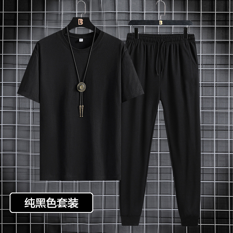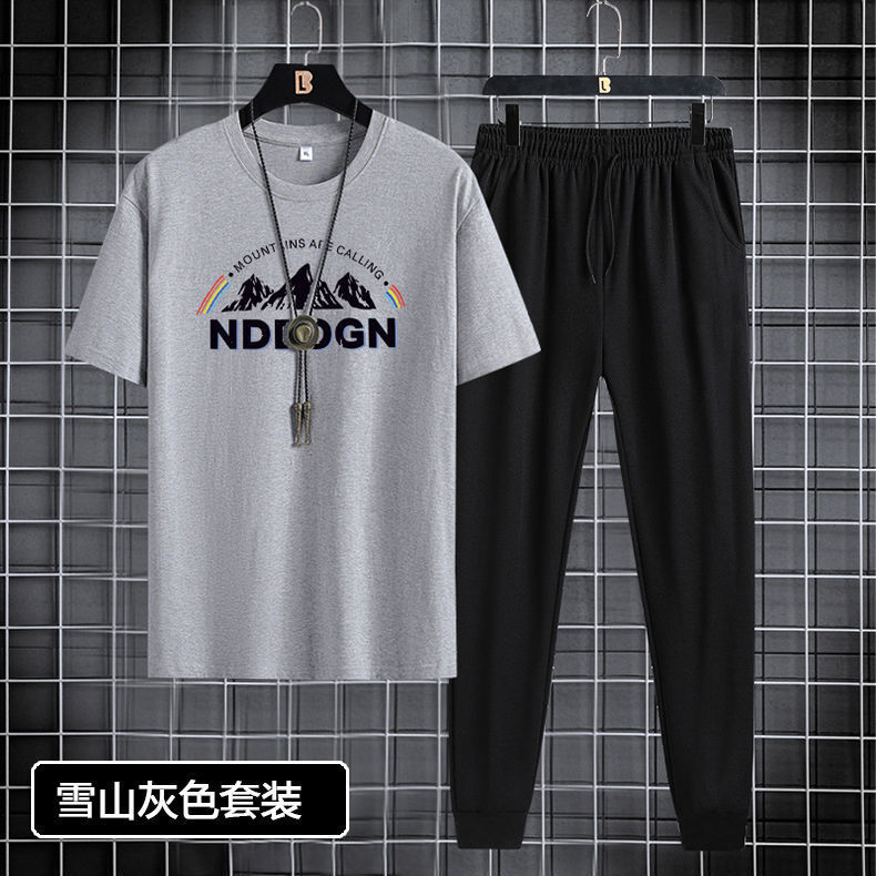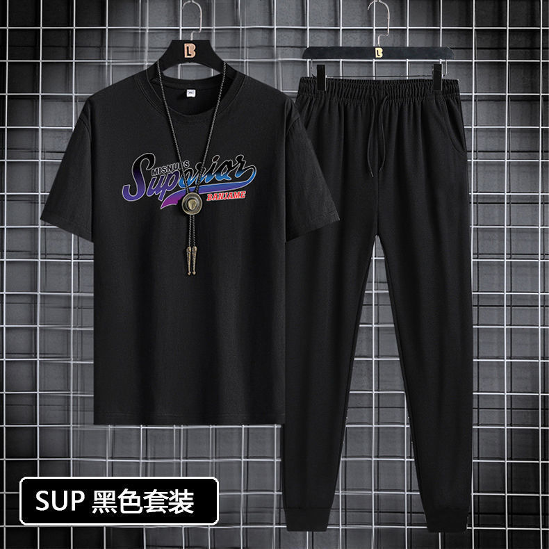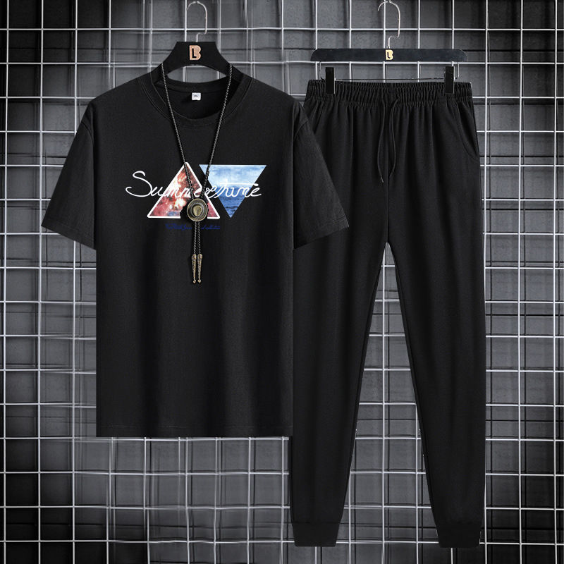 Short sleeved and long pants set for men in 2024, suitable for youth and men's sports and leisure. Round neck printed two-piece set, Korean version, casual