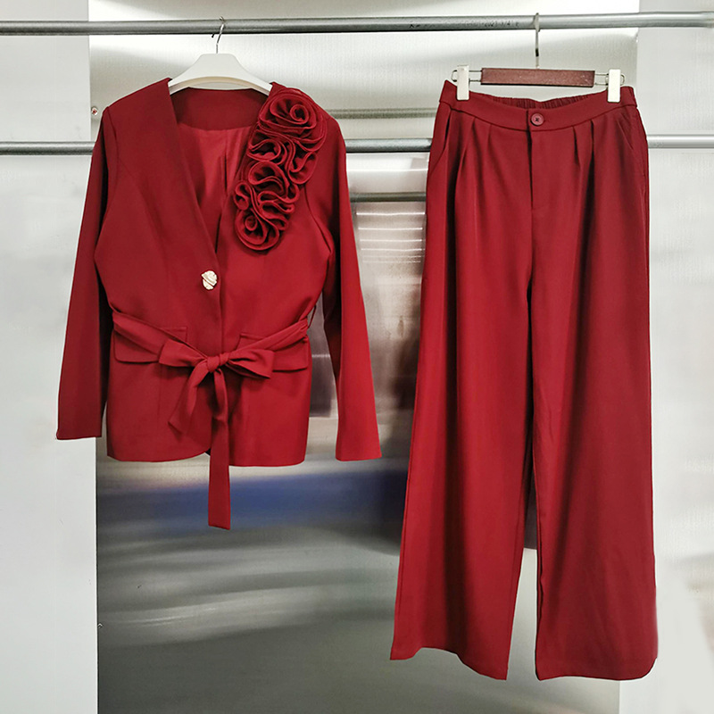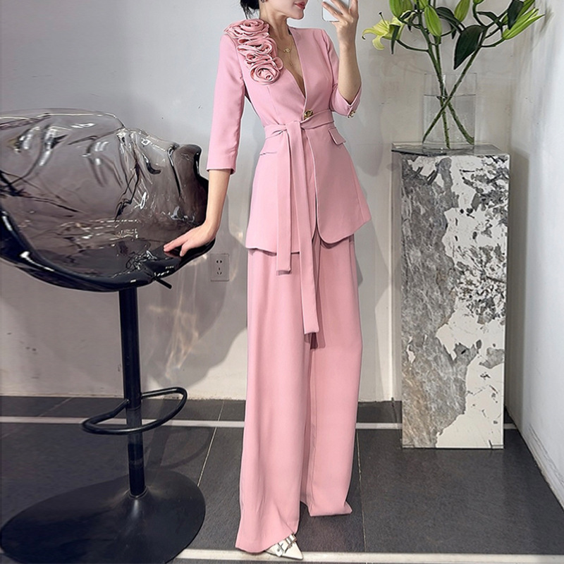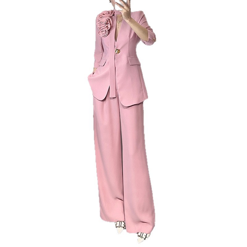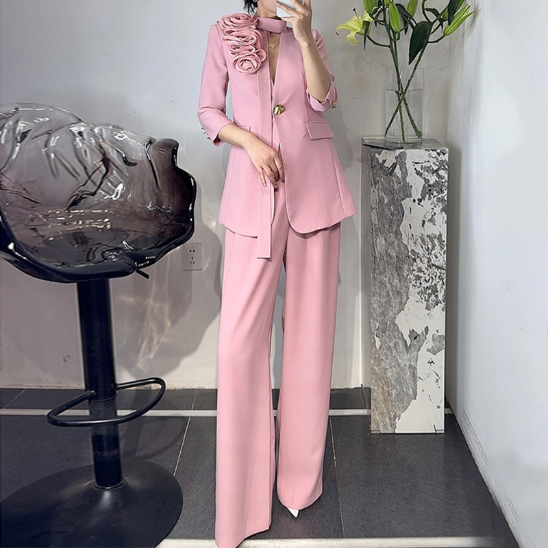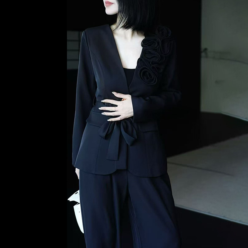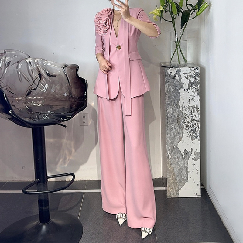 Temperament professional suit set 2025 new design sense three-dimensional flower V-neck one button suit two-piece set