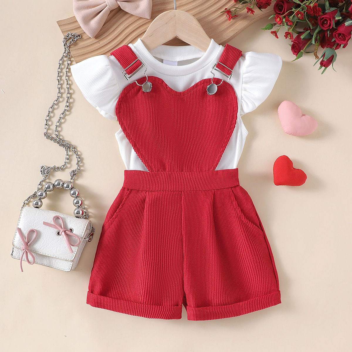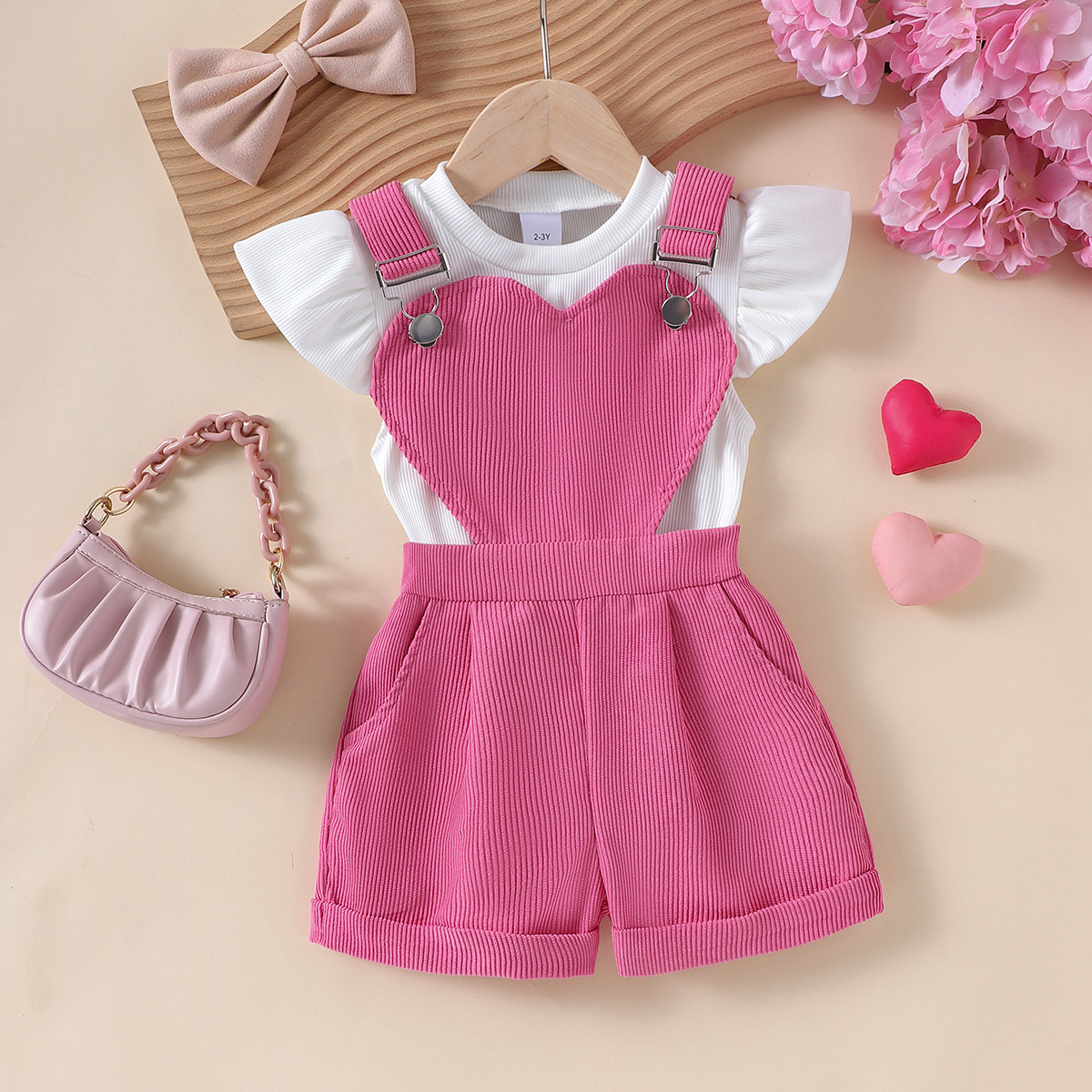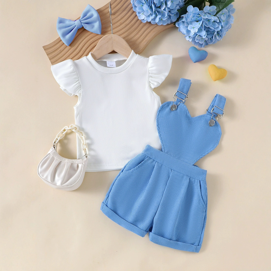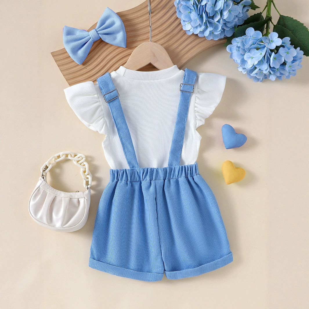 2025 New Instagram Cross border E-commerce Female Baby Knitted Flying Sleeve Top with Blue Strap Shorts Two Piece Set
