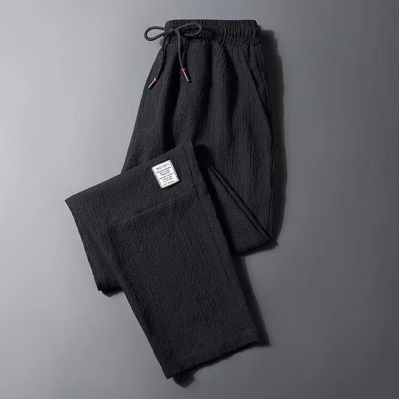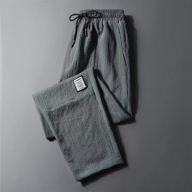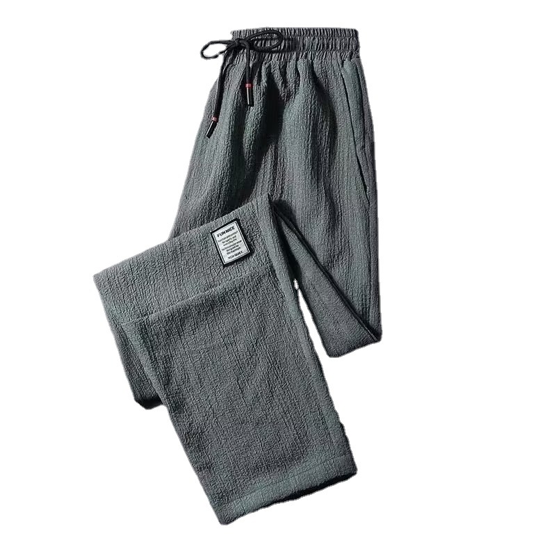 Casual pants for men in spring, autumn, and summer, new ice silk thin design, straight tube label, Korean version, loose oversized sports cropped pants