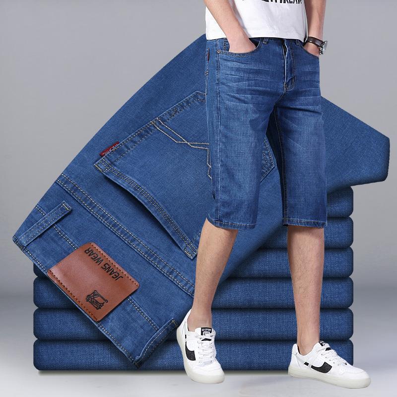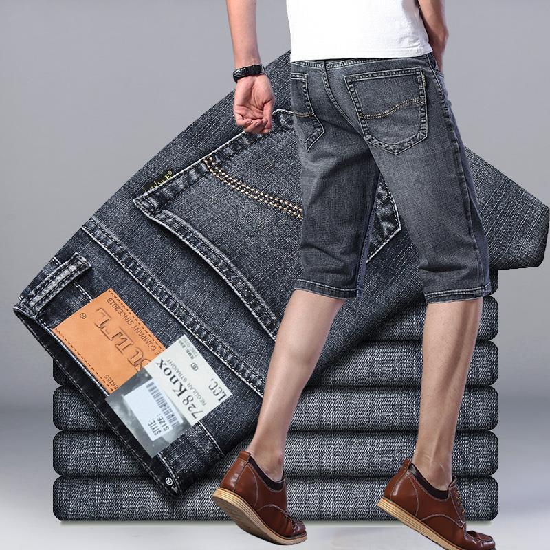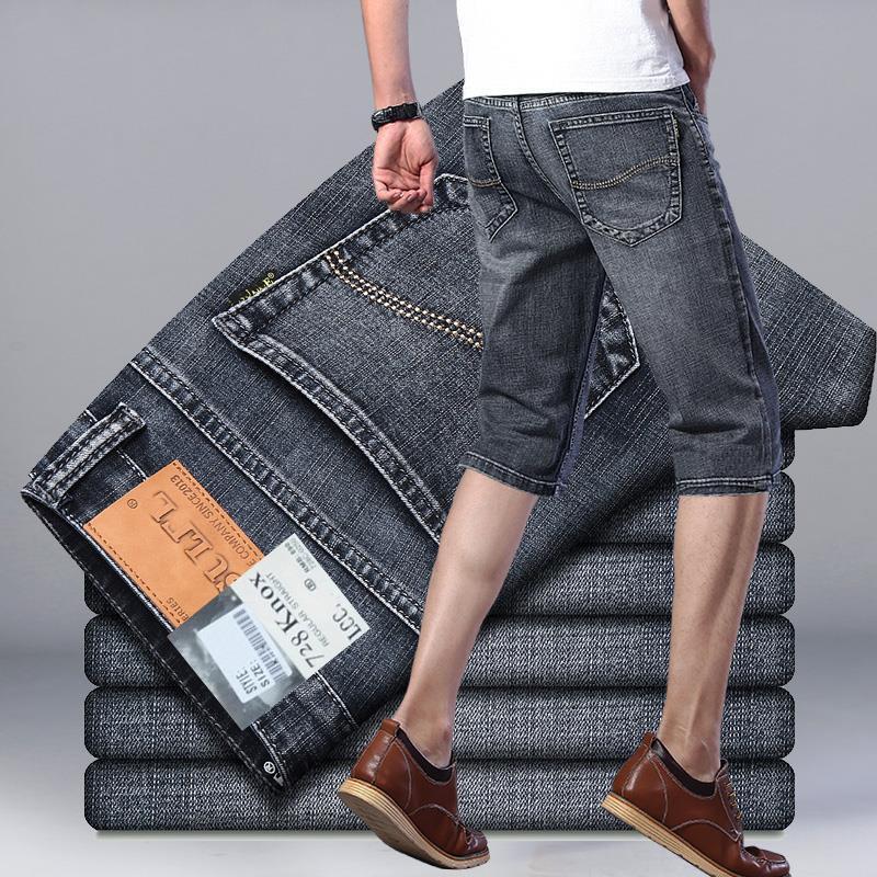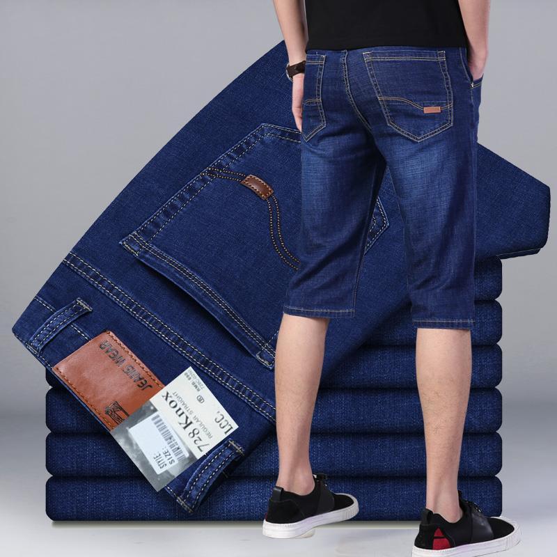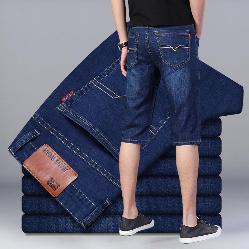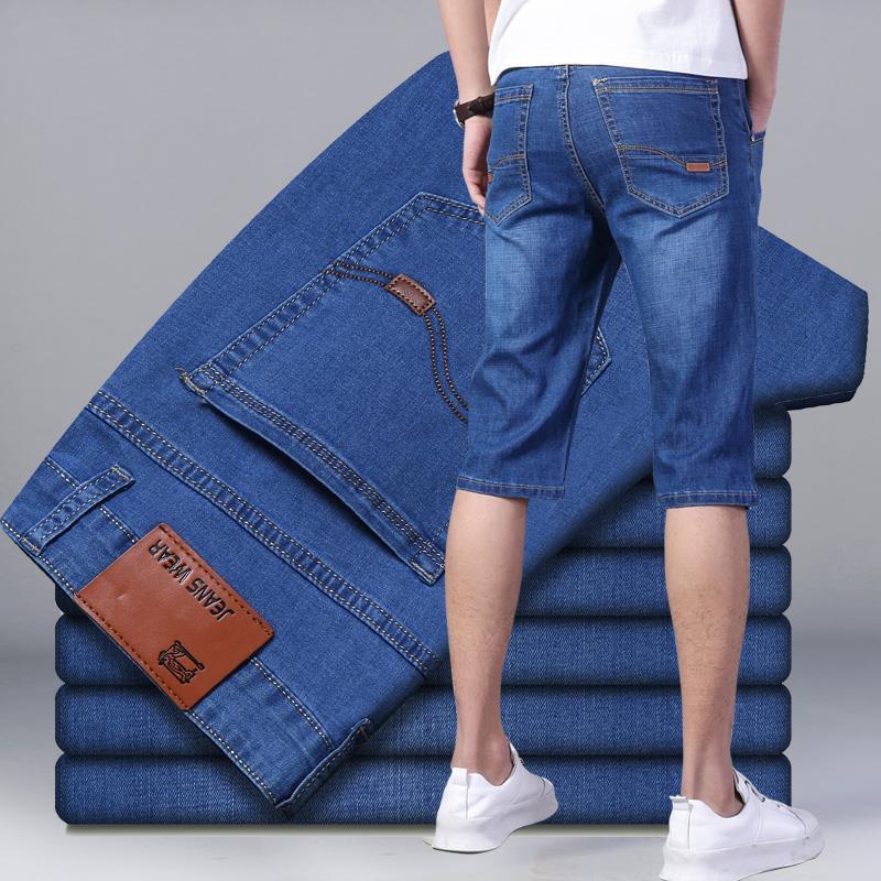 Summer new men's denim mid length loose straight leg casual versatile men's elastic thin five quarter pants half length horse pants