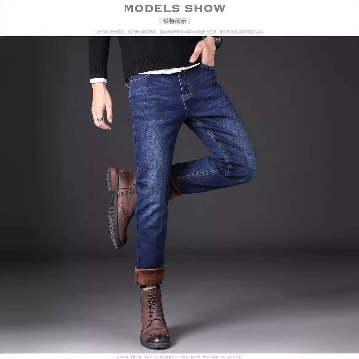 Autumn and winter new fleece jeans men's loose straight leg thick warm pants casual versatile work elastic pants