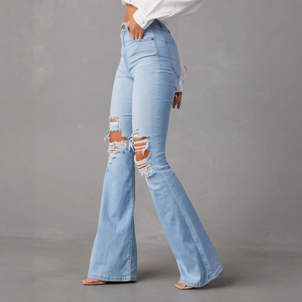 Factory direct sales of 2025 new cross-border European and American high waisted ripped jeans, women's street spicy girl bell bottom pants, long pants