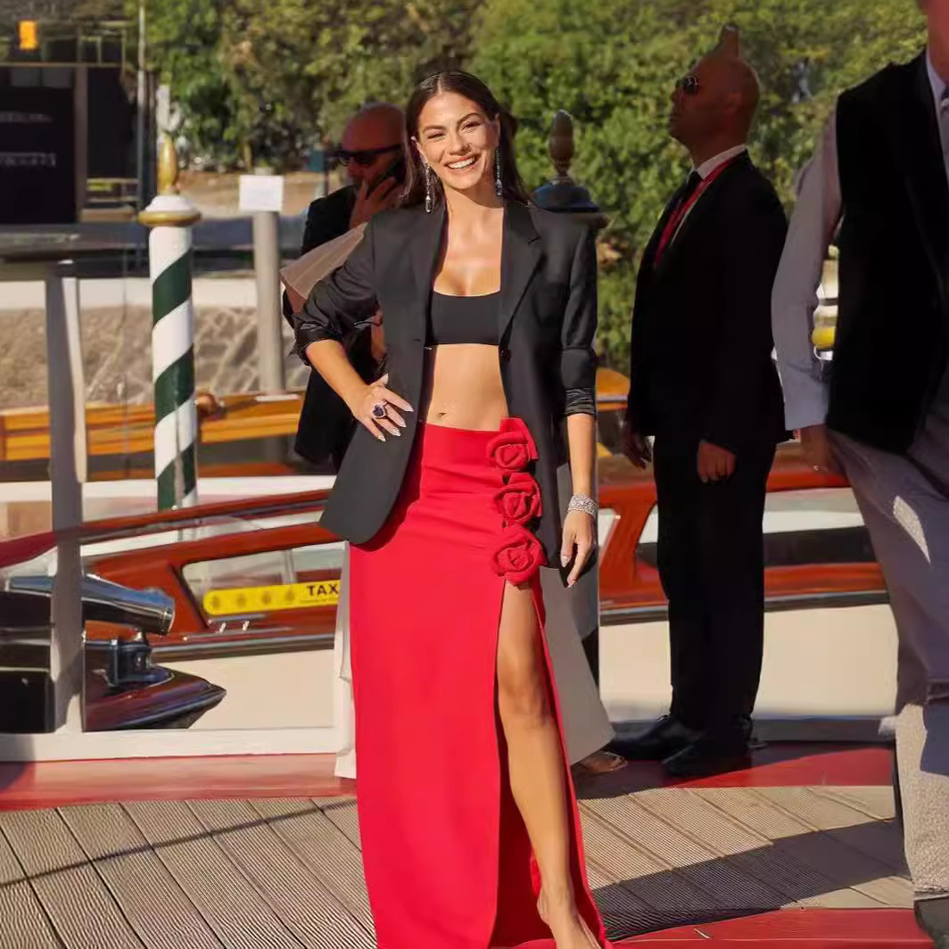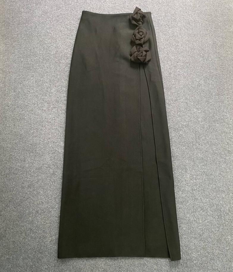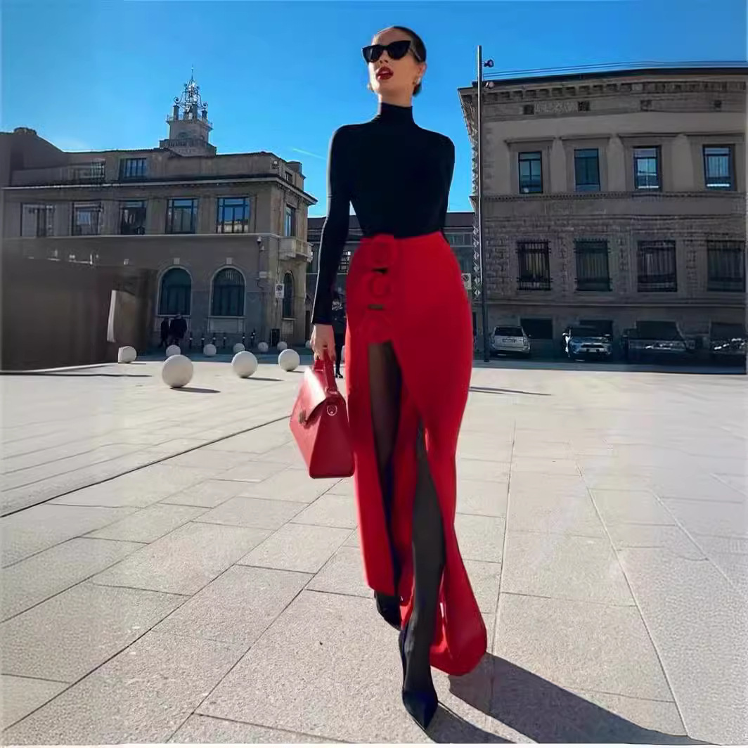 2024 new red three-dimensional flower high slit long skirt, half body skirt, European and American foreign trade bandage skirt, sexy women's clothing