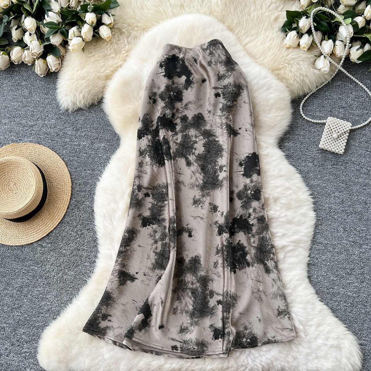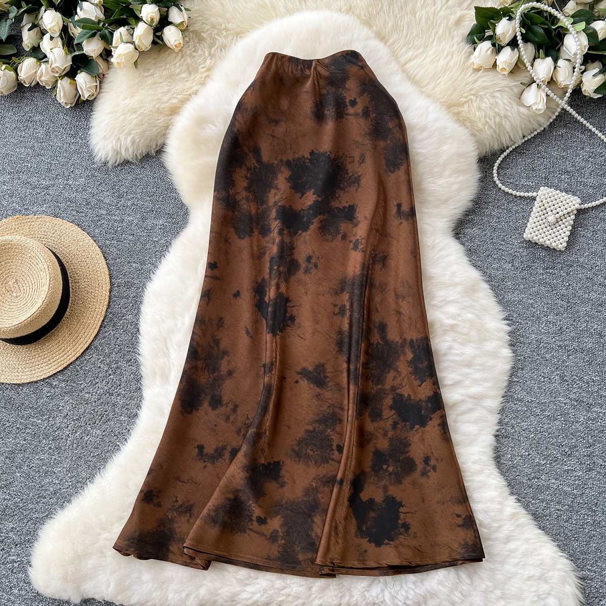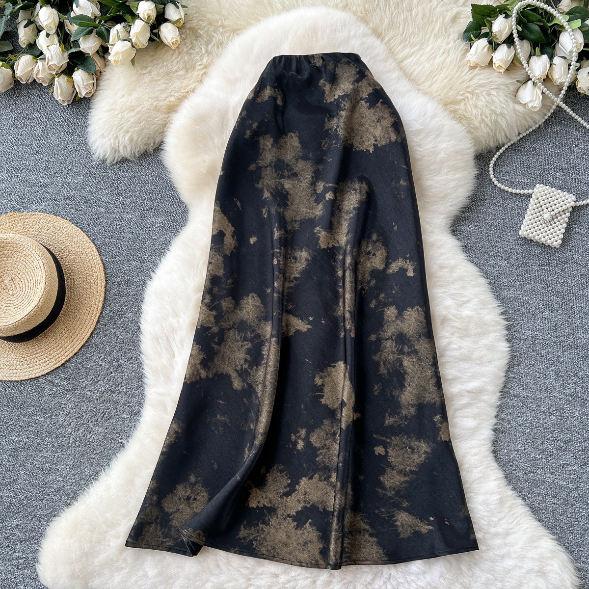 French high-end satin skirt for women in summer 2025, light luxury retro ink print high waist slimming fishtail skirt