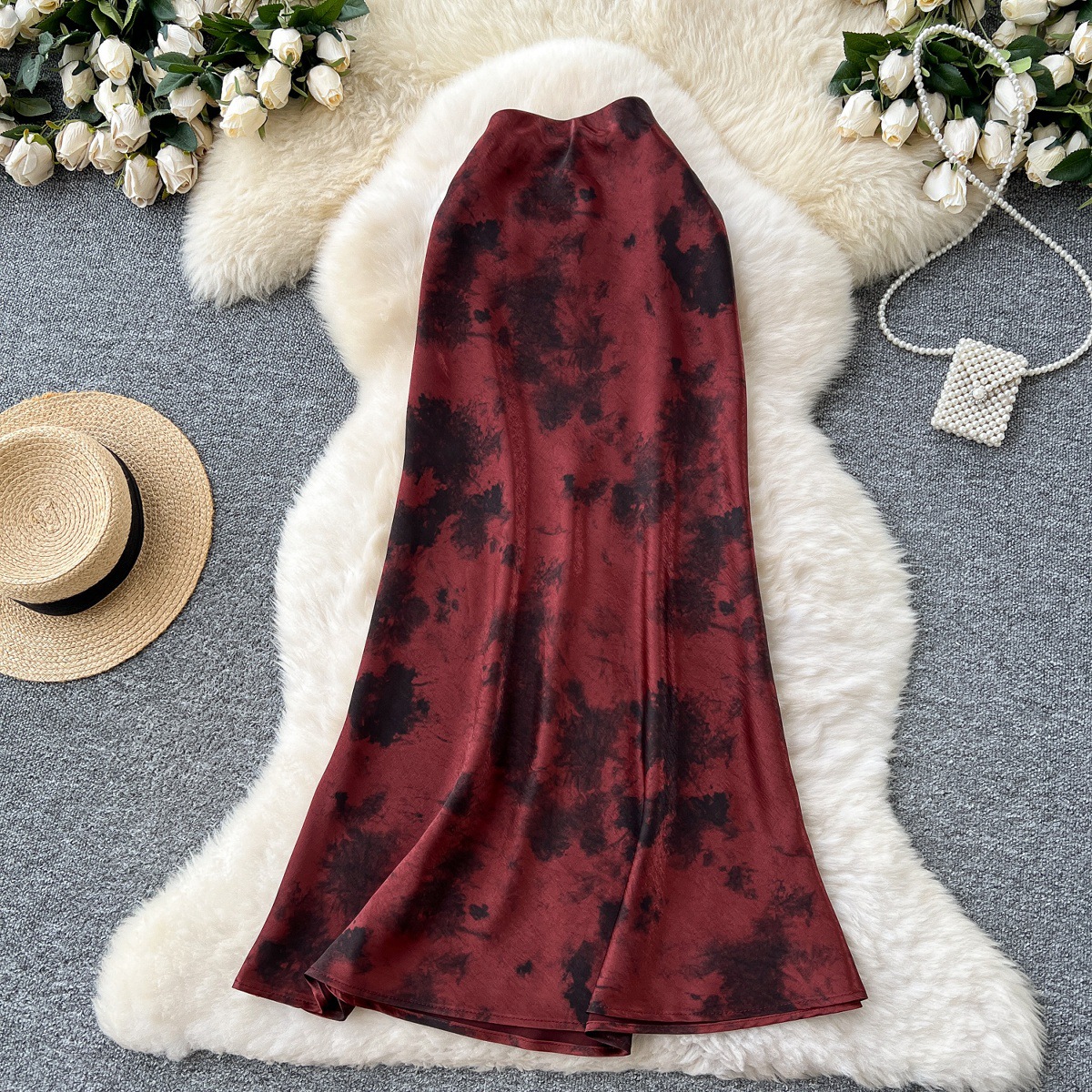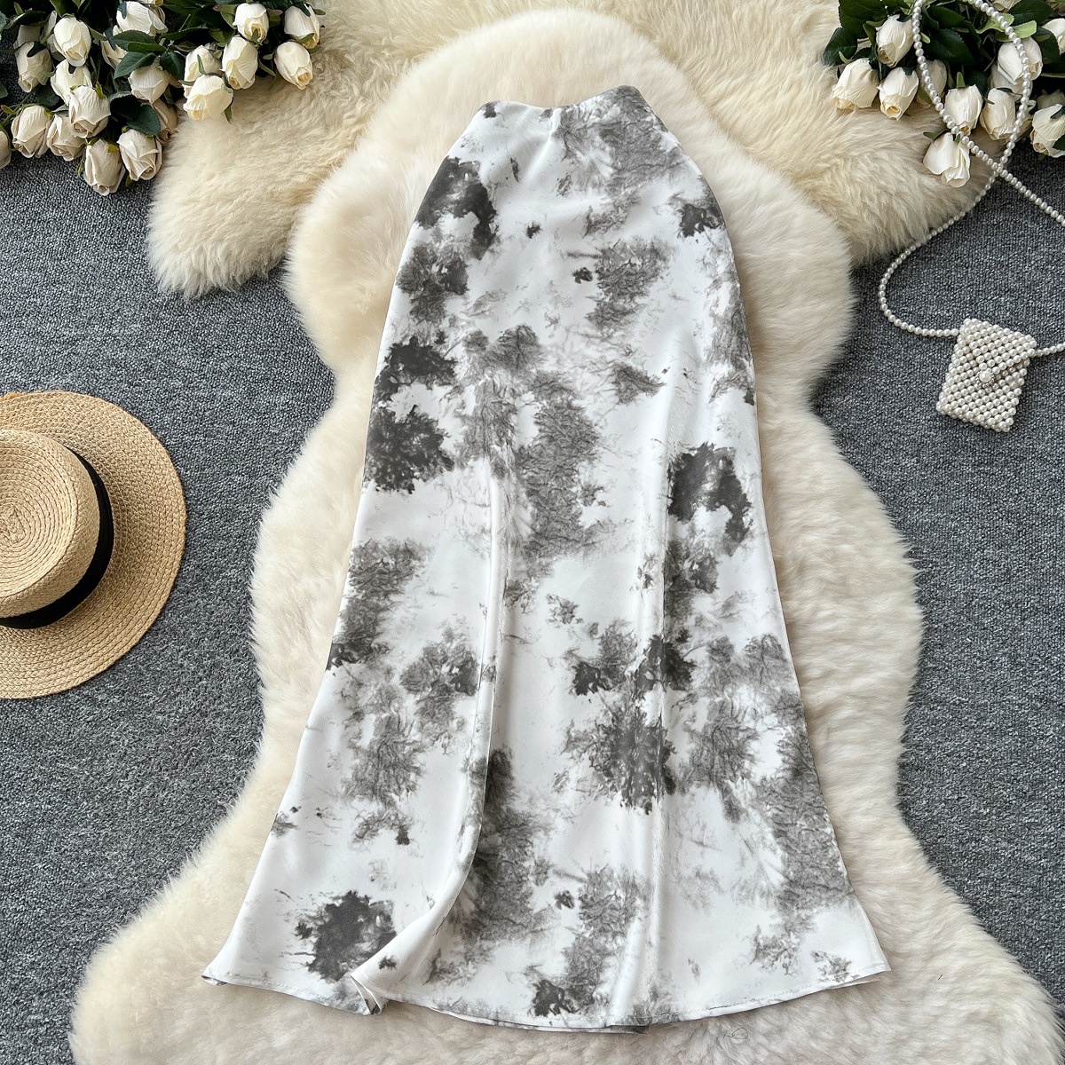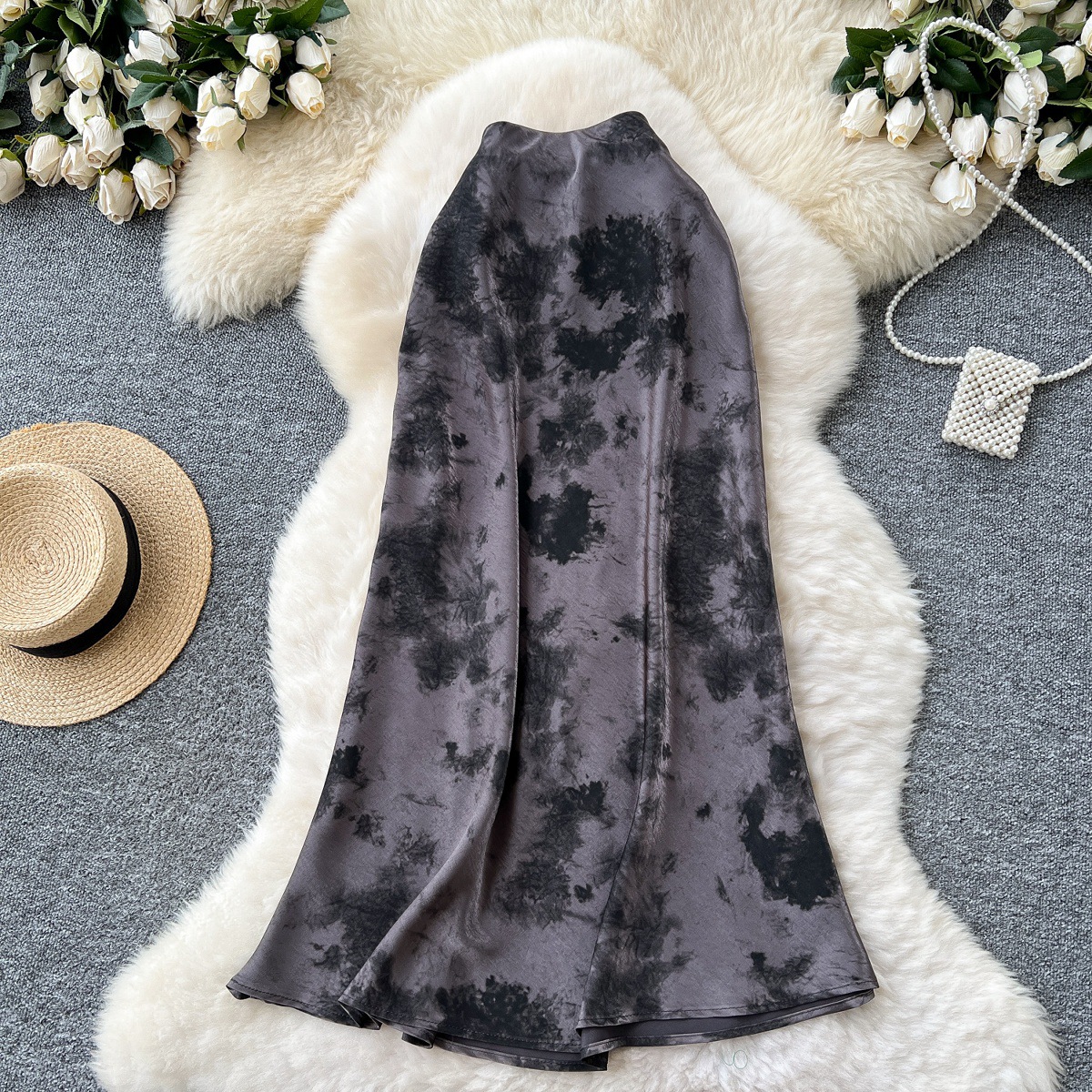 French high-end satin skirt for women in summer 2025, light luxury retro ink print high waist slimming fishtail skirt