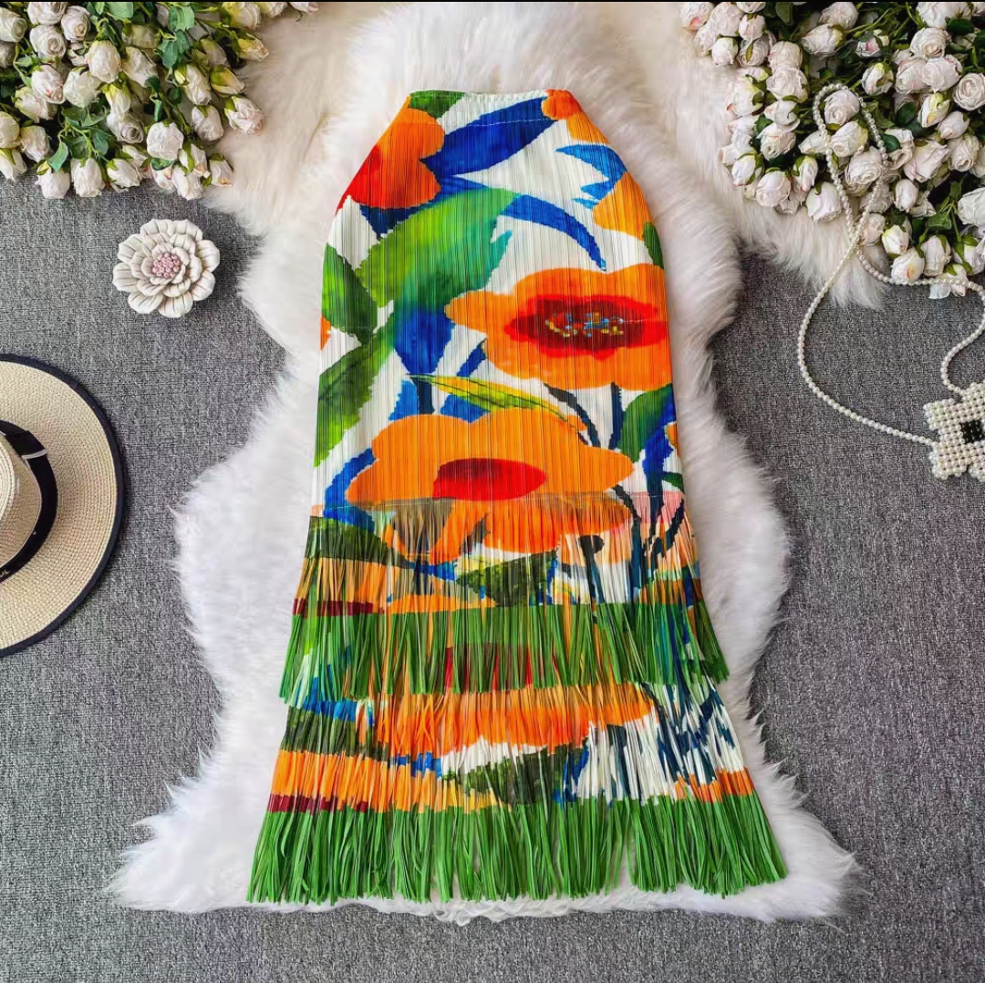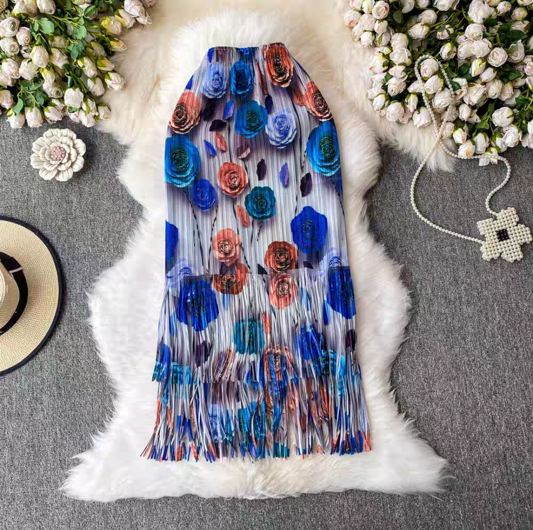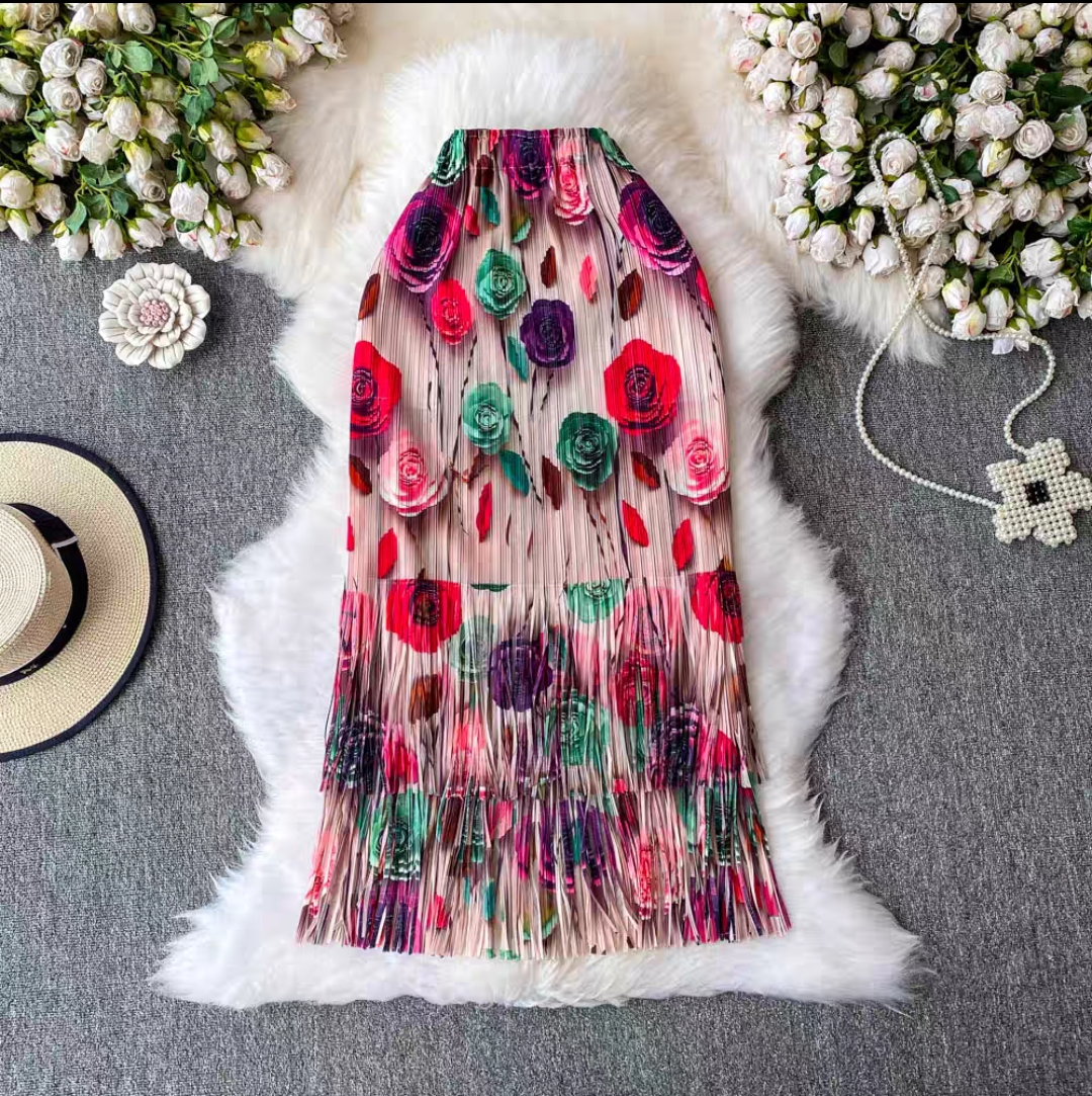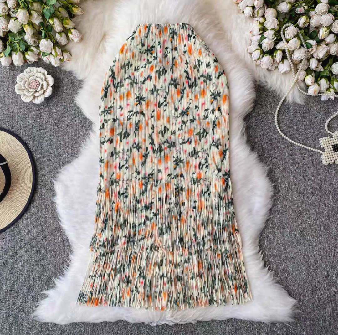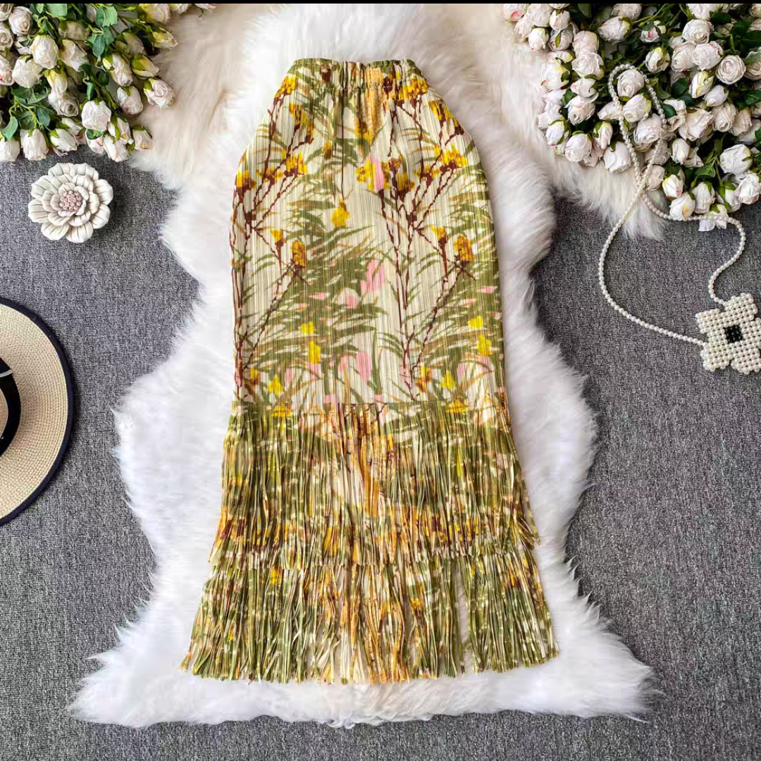 Miyake 2025 foreign trade summer pleated fringe skirt loose women's clothing design sense printed pleated long skirt