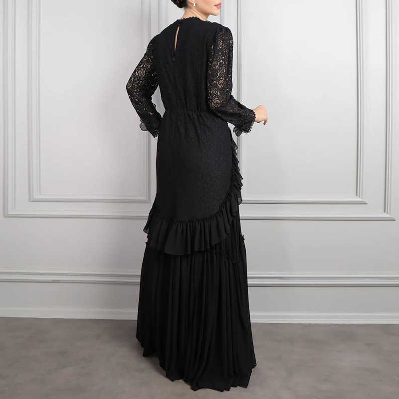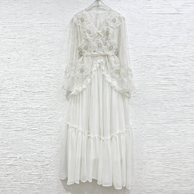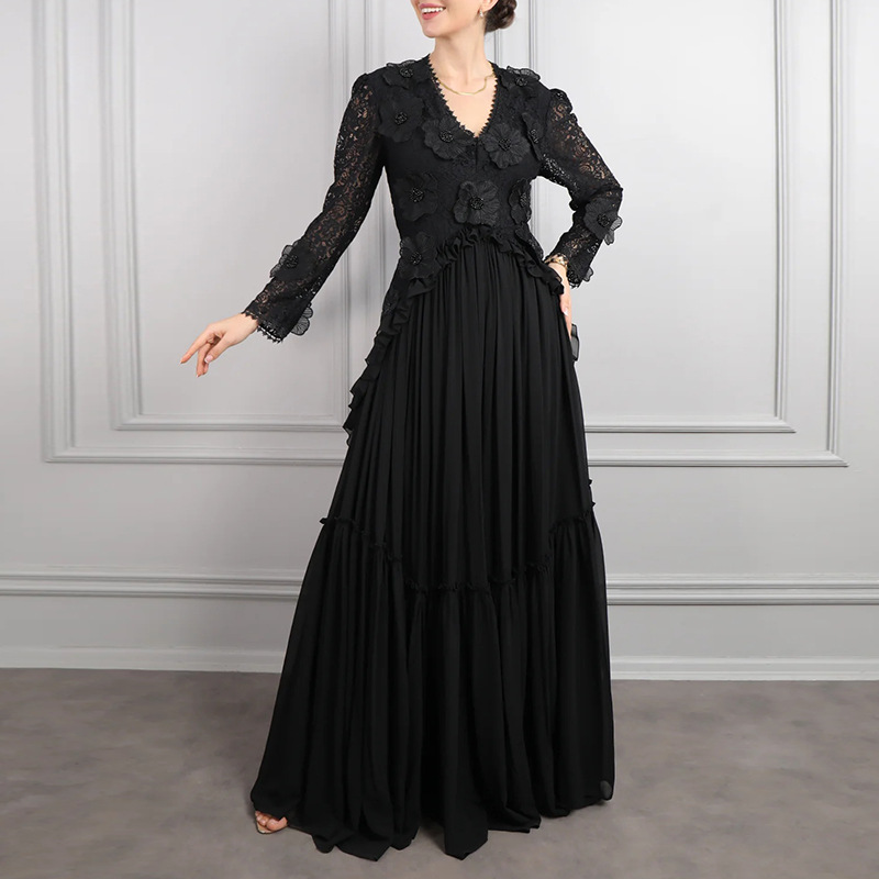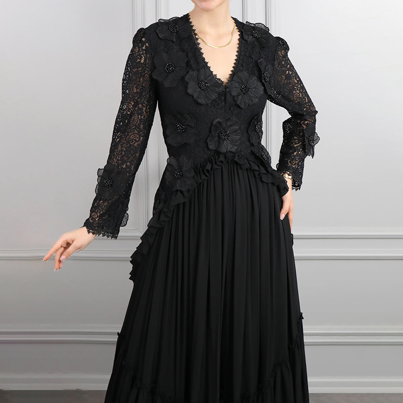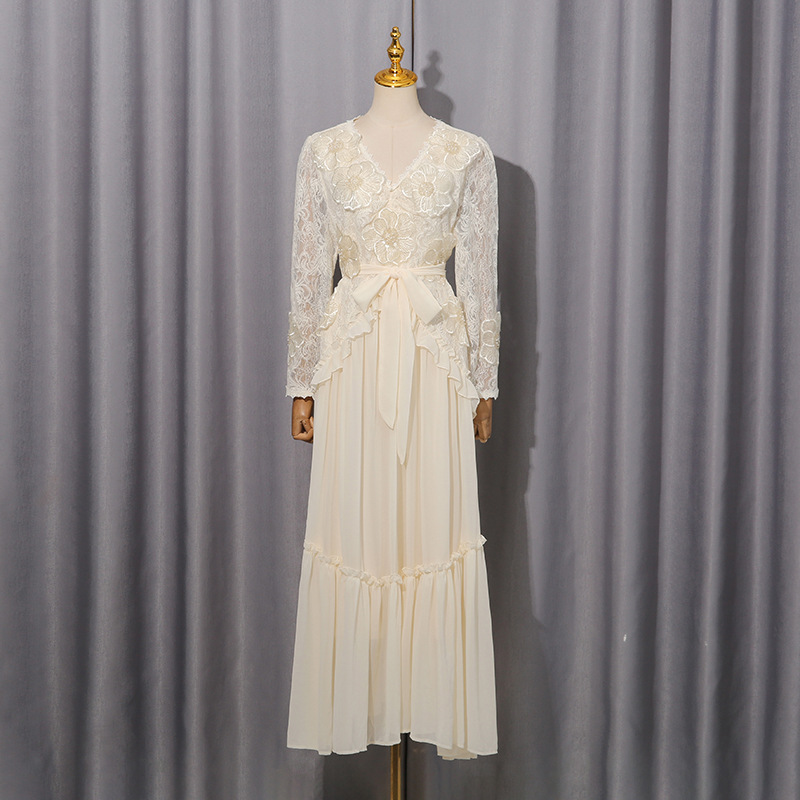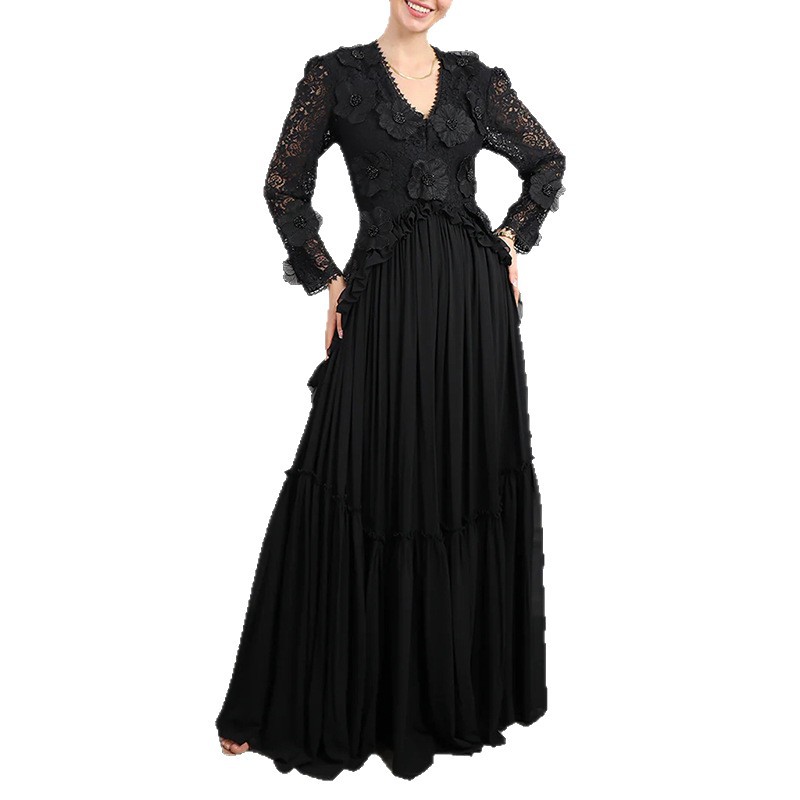 Light luxury high-end three-dimensional flower dress 2025 new heavy embroidery lace splicing V-neck long women's skirt