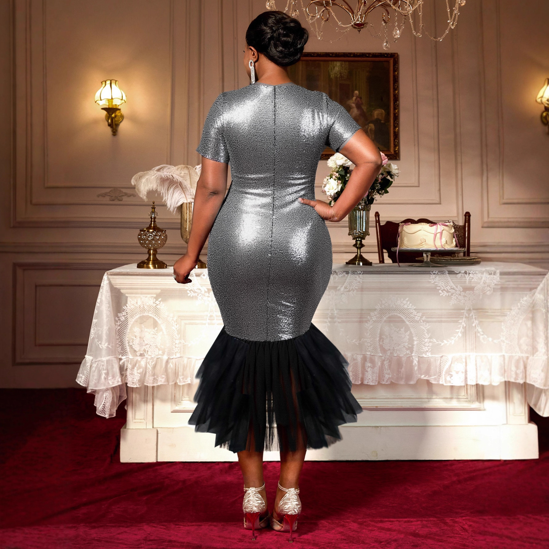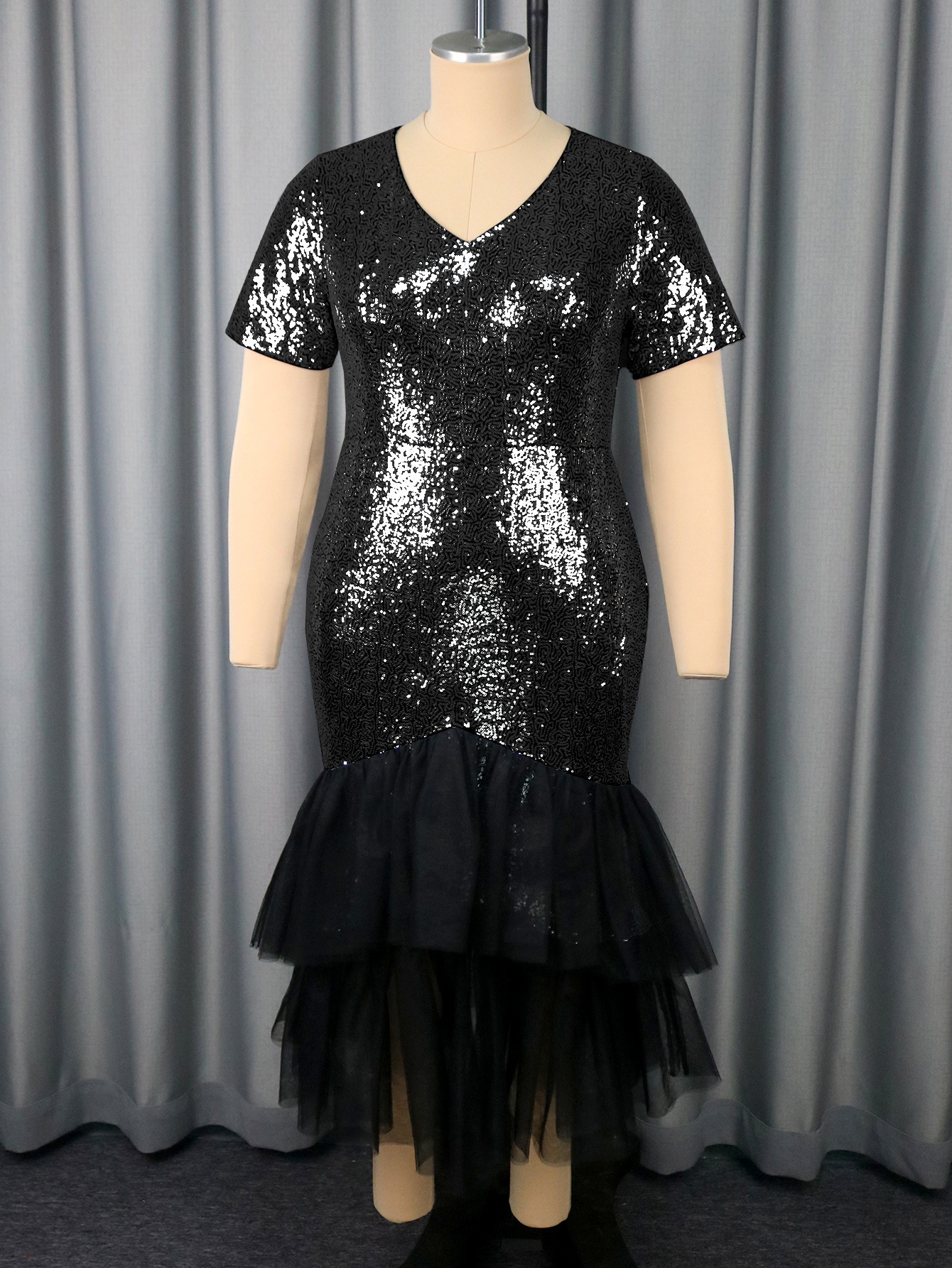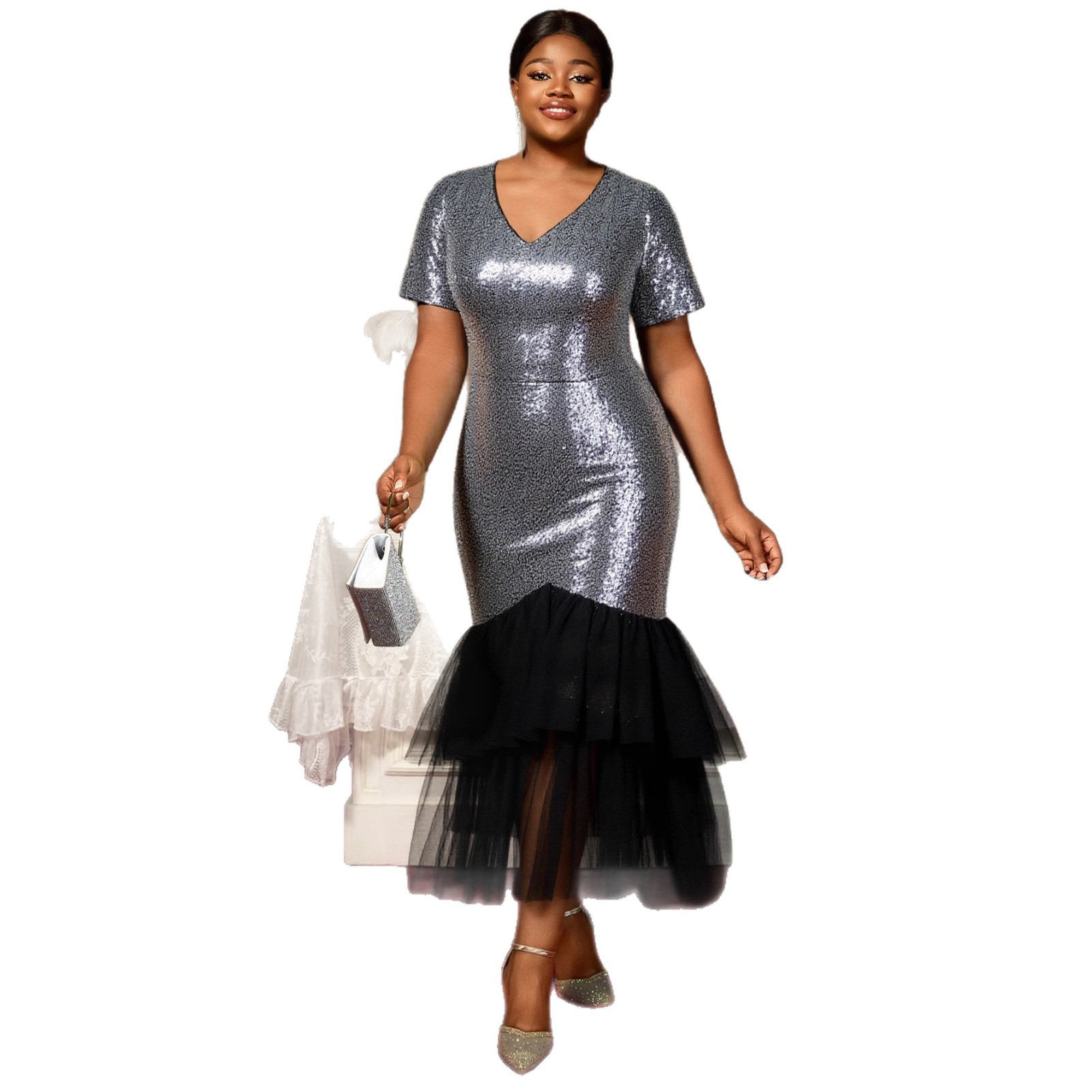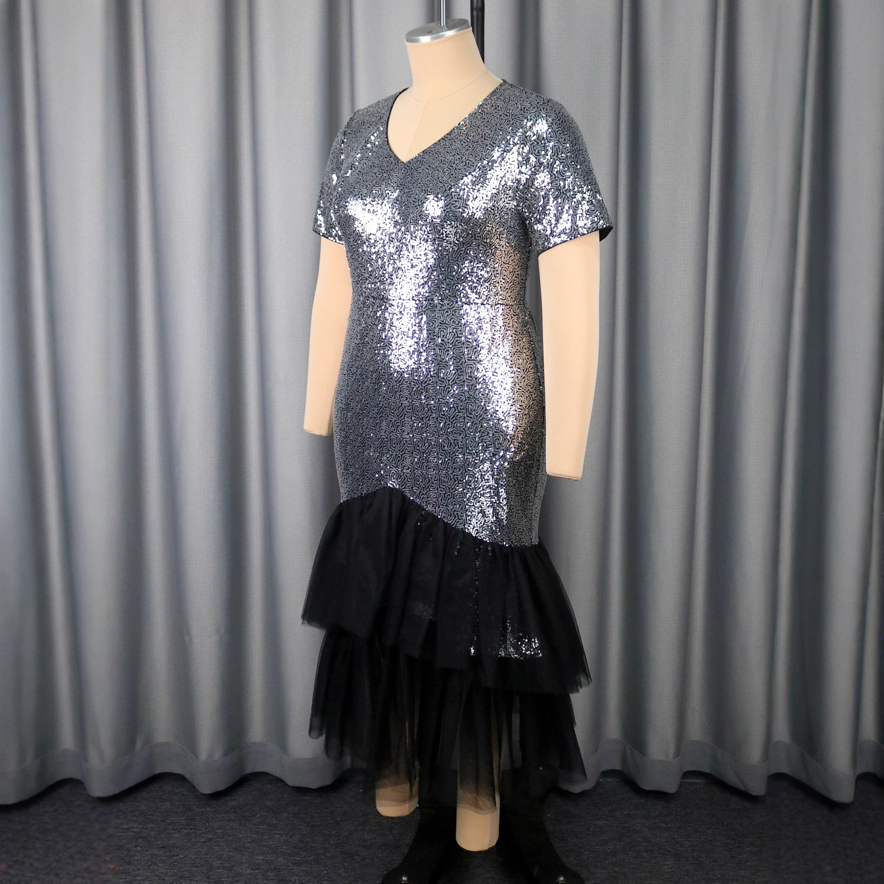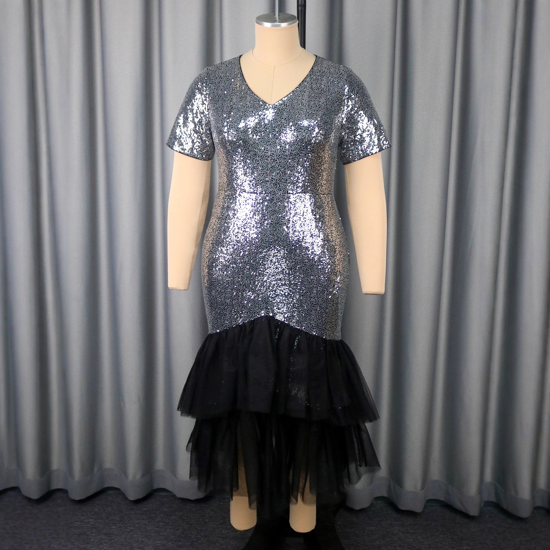 Large women's sequined patchwork dress V-neck short sleeved layered design with mesh fishtail skirt and evening gown