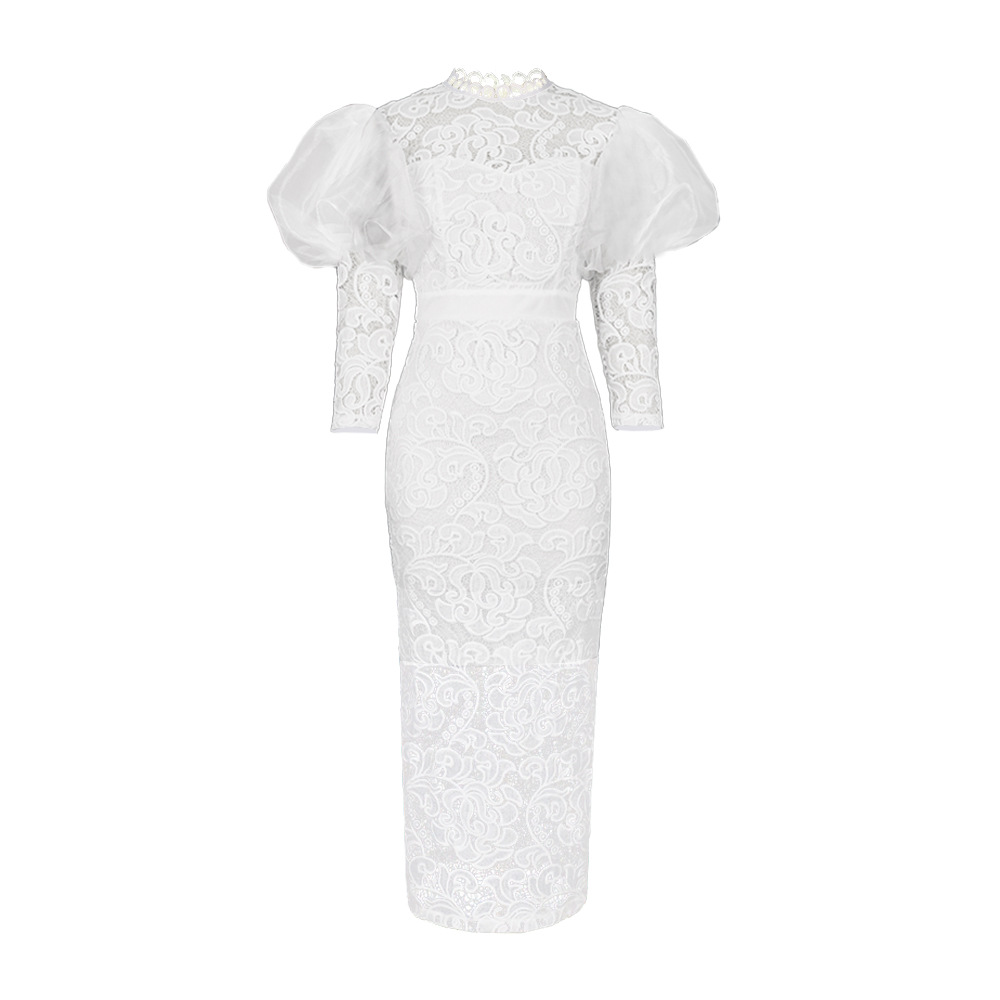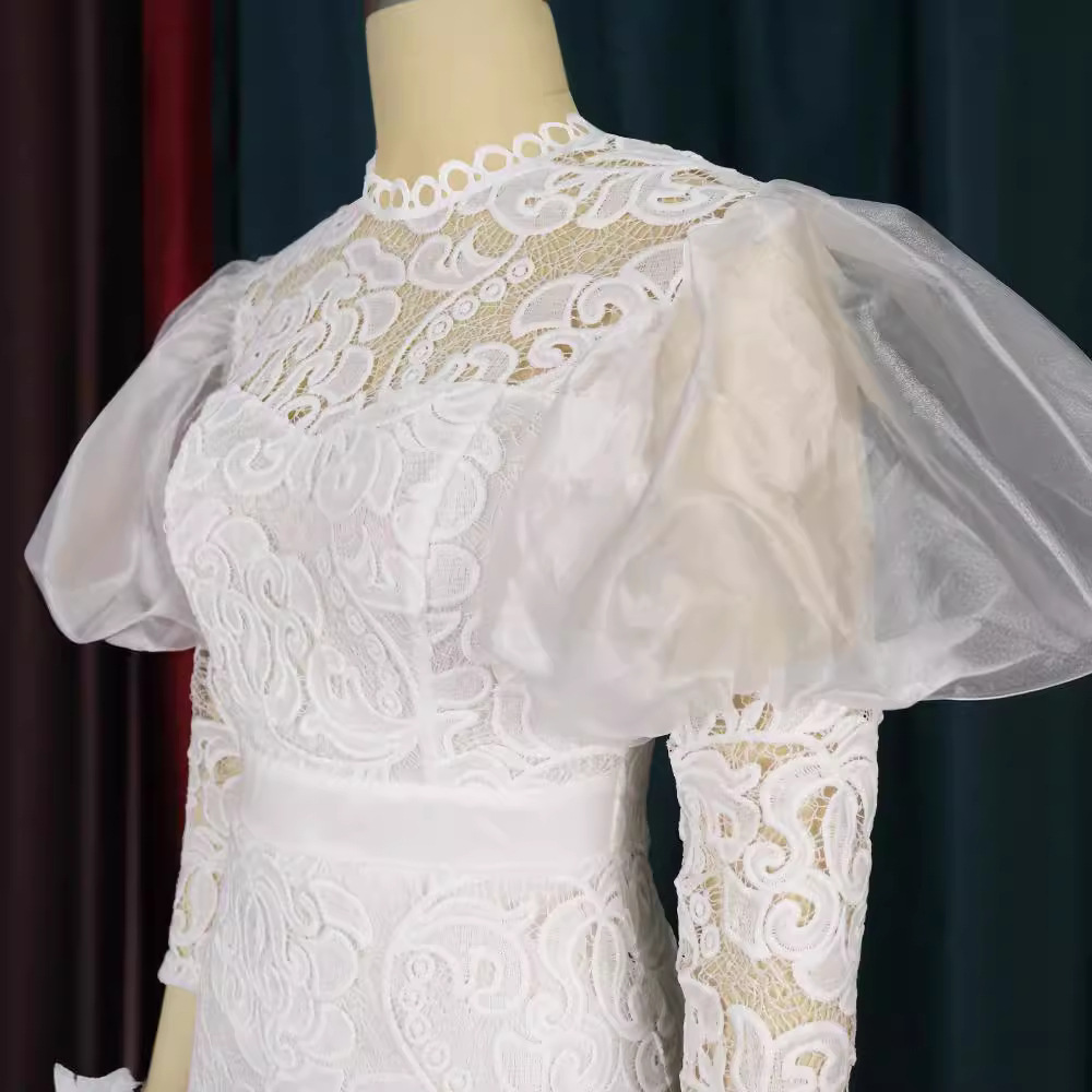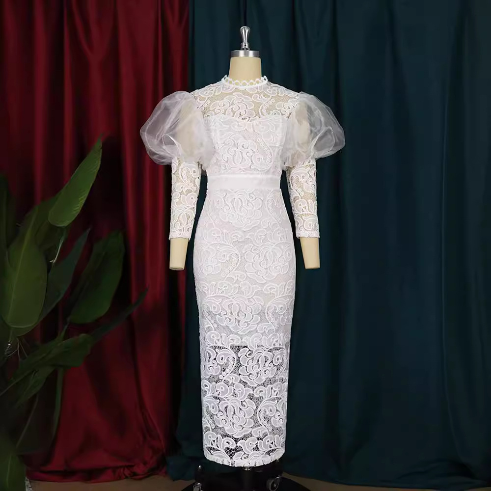 Large size women's round neck lace skirt with see through splicing and bubble sleeves, waist cinched mid length dress lace dress