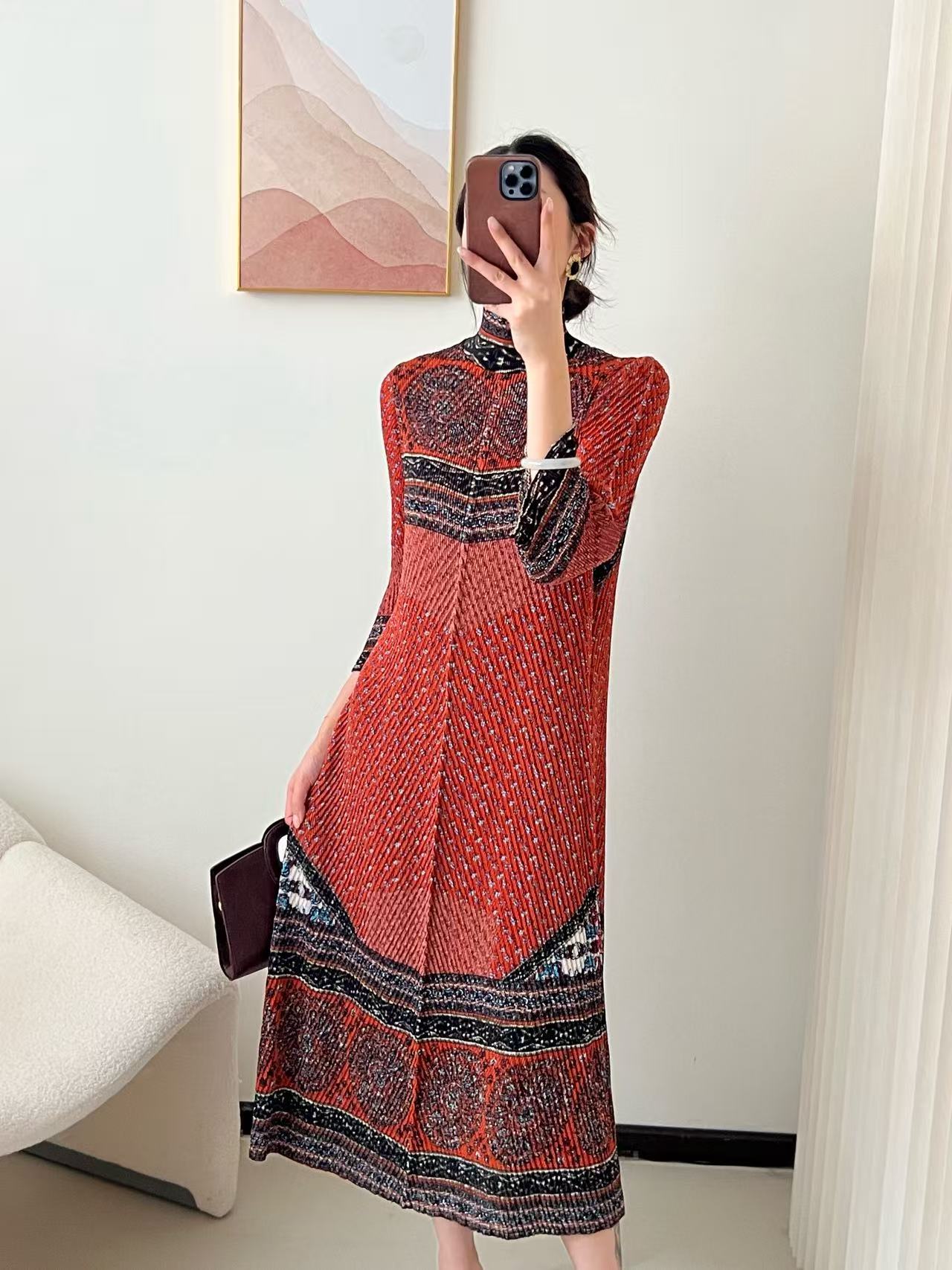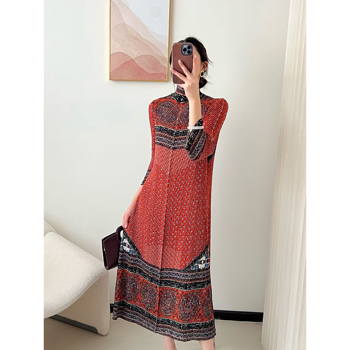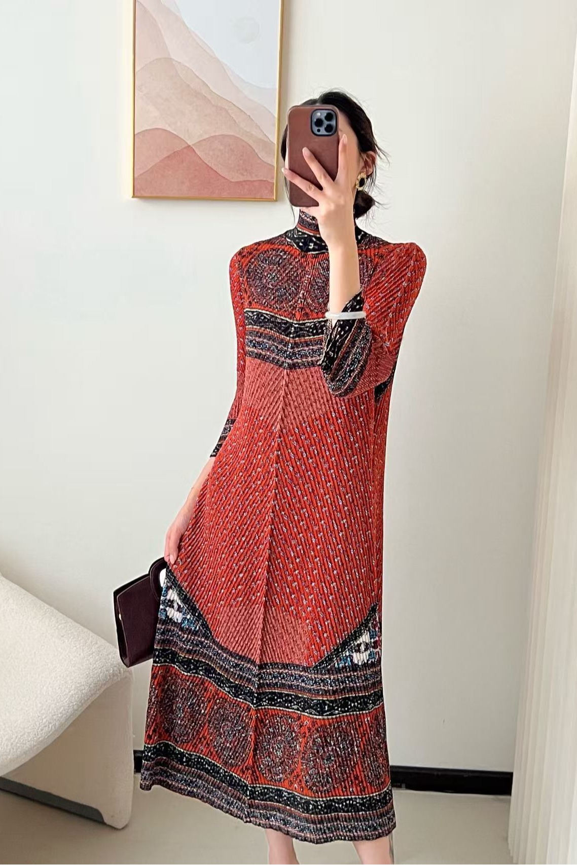 Miyake cross-border retro dragon scale pleated long skirt with high neck and seven quarter sleeves, loose printed pleated dress, European and American slimming women