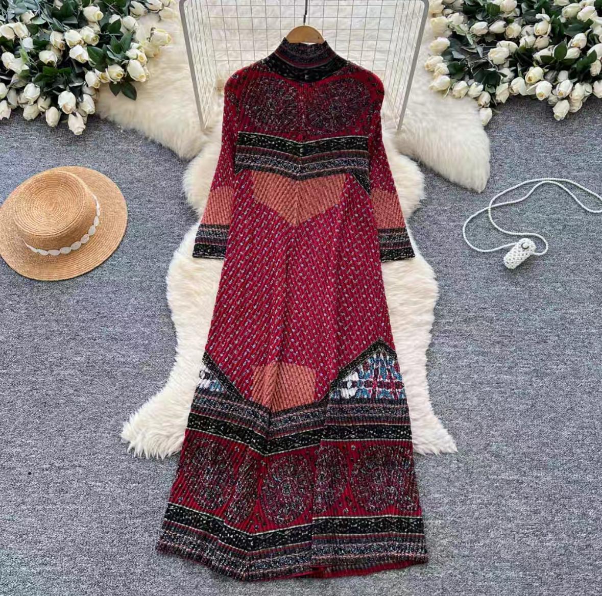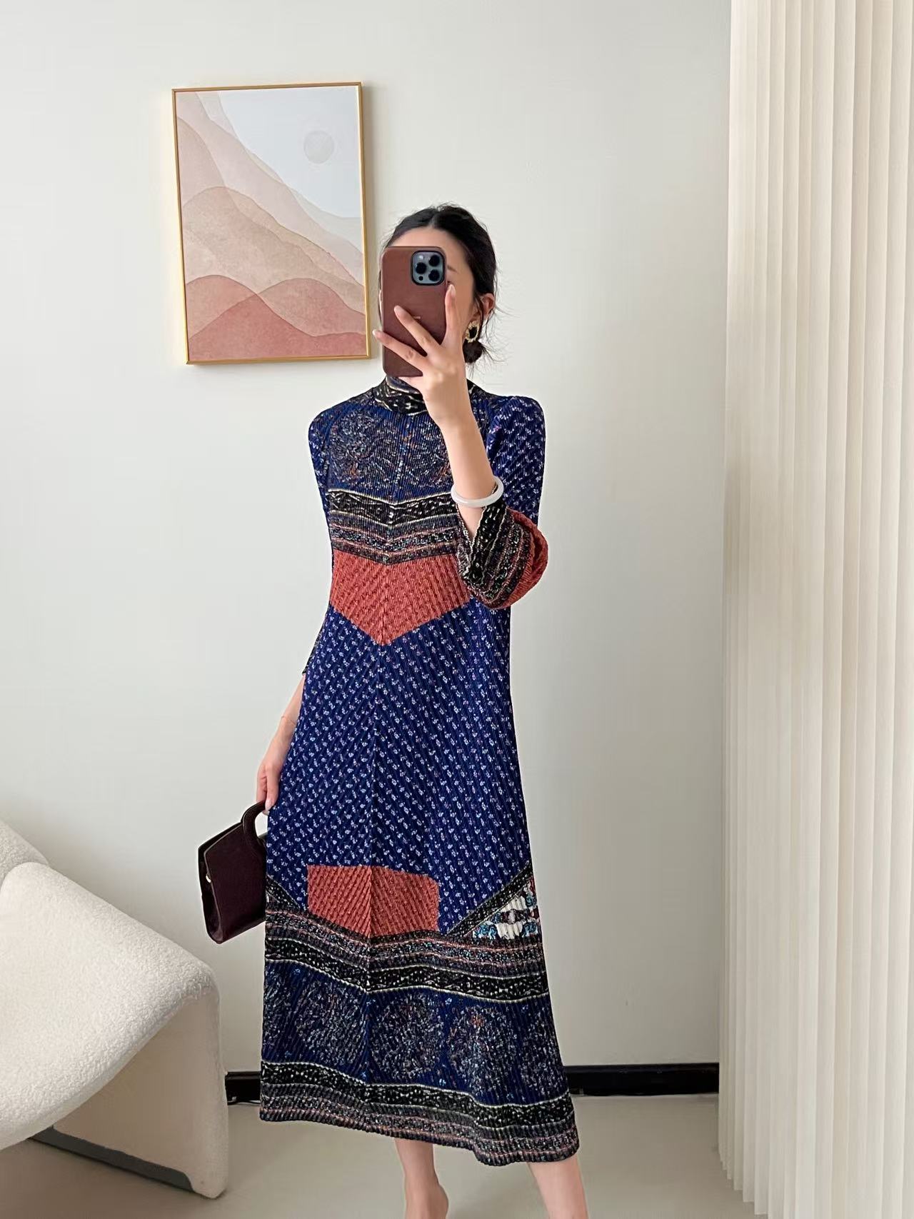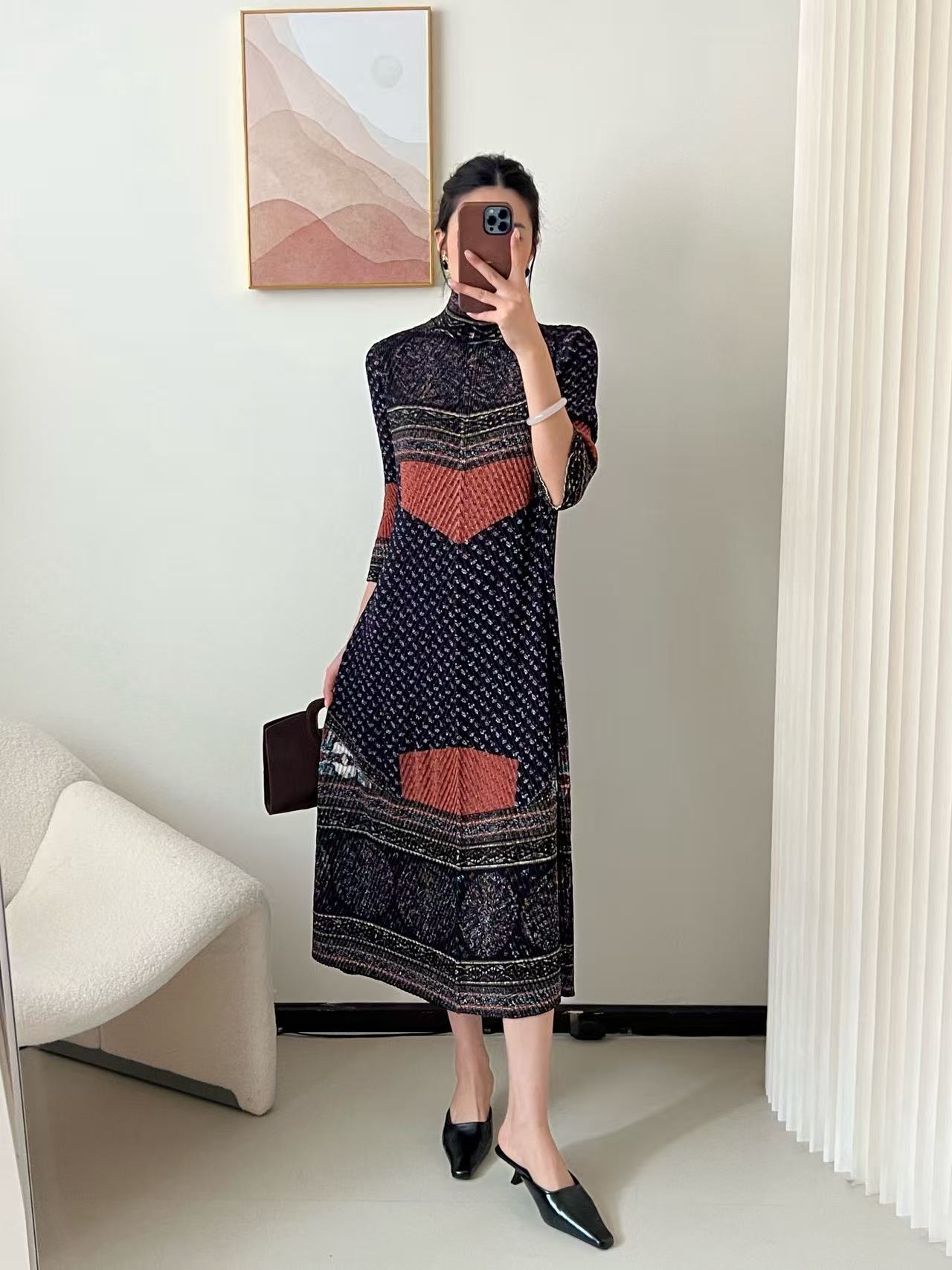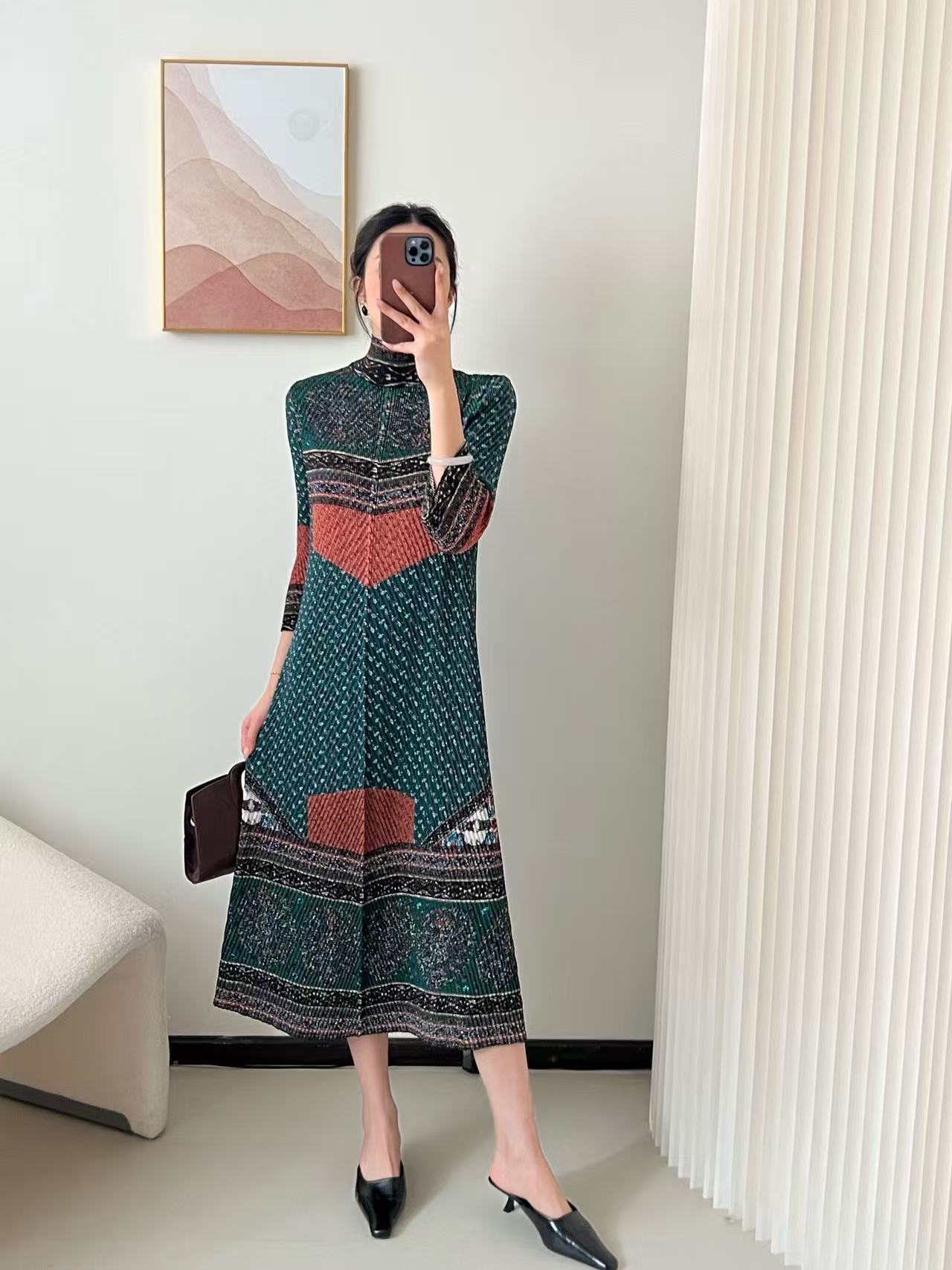 Miyake cross-border retro dragon scale pleated long skirt with high neck and seven quarter sleeves, loose printed pleated dress, European and American slimming women