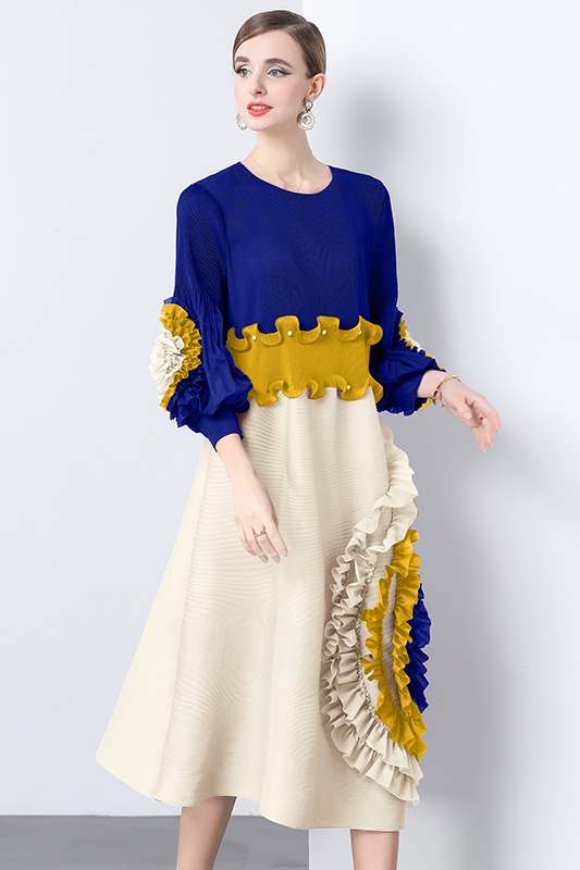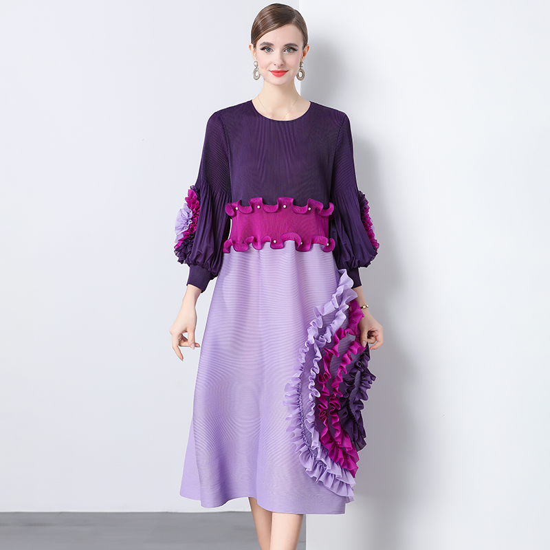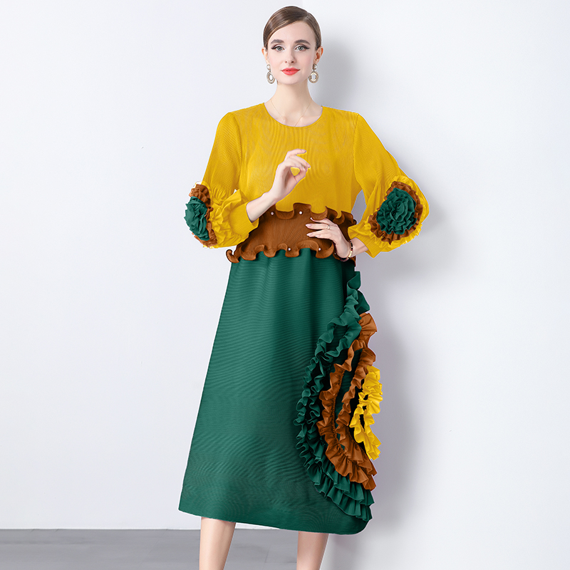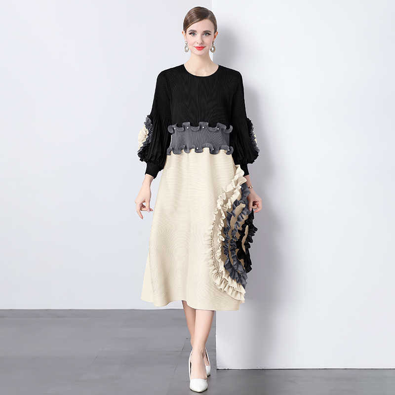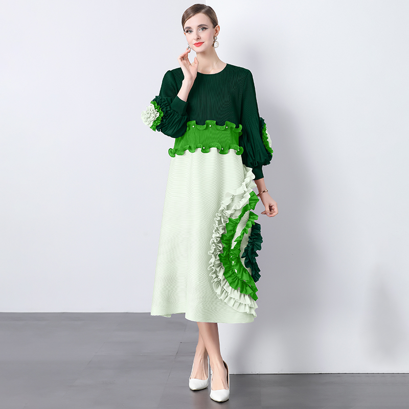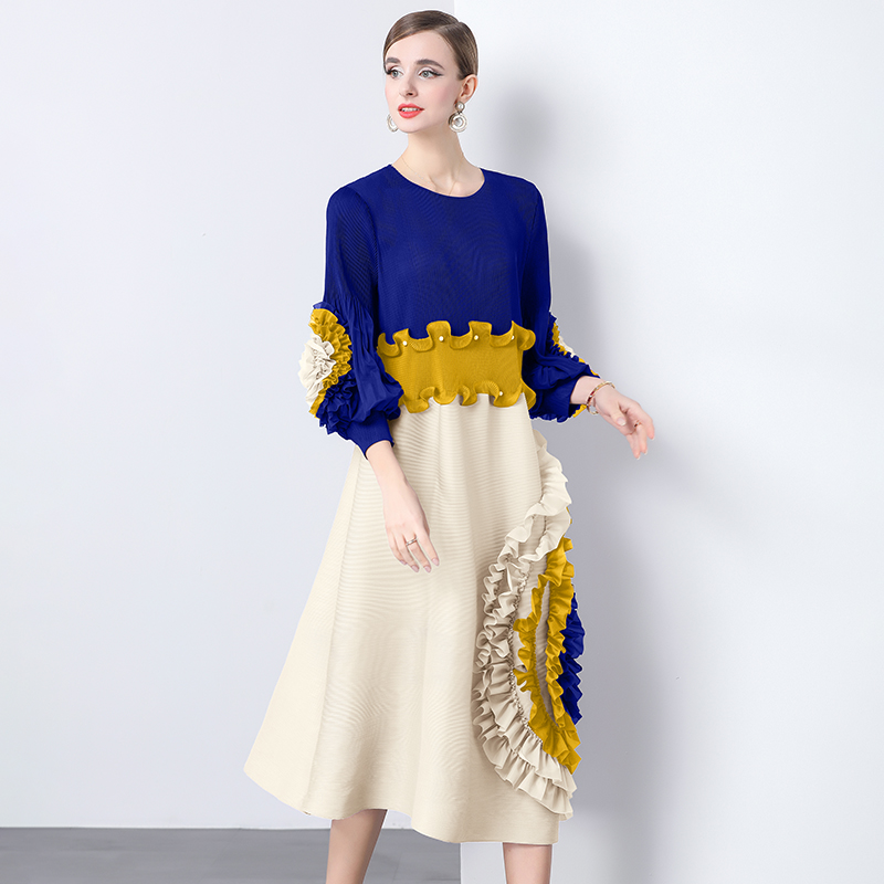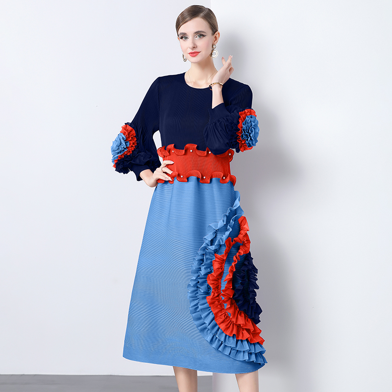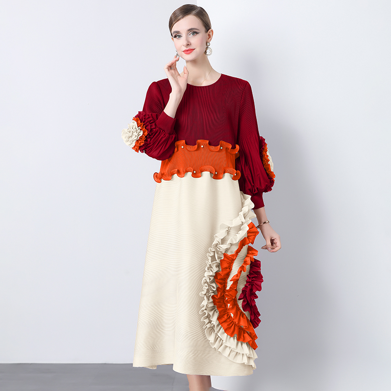 Miyake Europe and America Cross border Heavy Industry Nail Bead 3D Flower Plate Flower Loose and Skinny Folding Dress with Mushroom Edge Long Dress