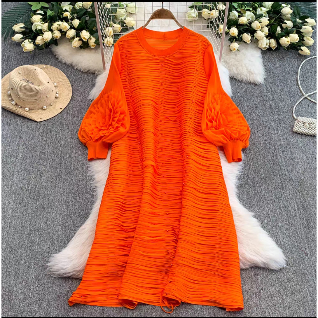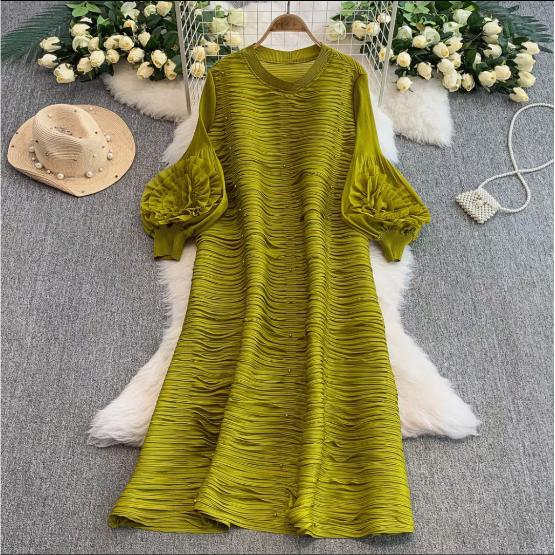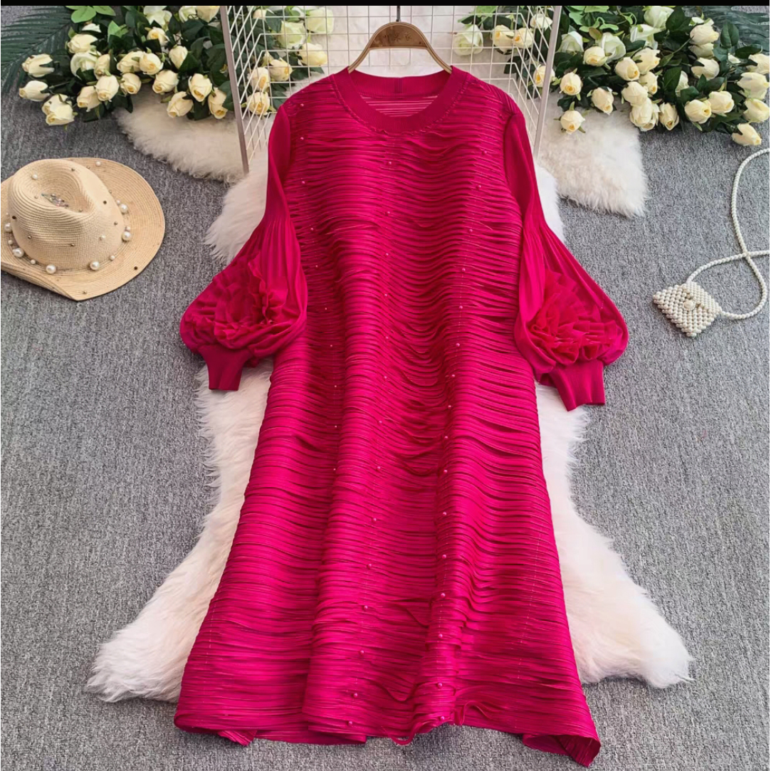 Miyake cross-border nail bead hollow tassel plate flower pleated high-end European and American plus size round neck heavy industry lantern sleeve long skirt for women