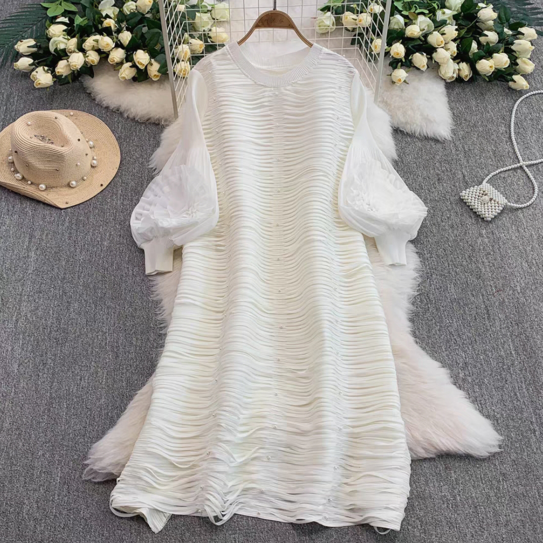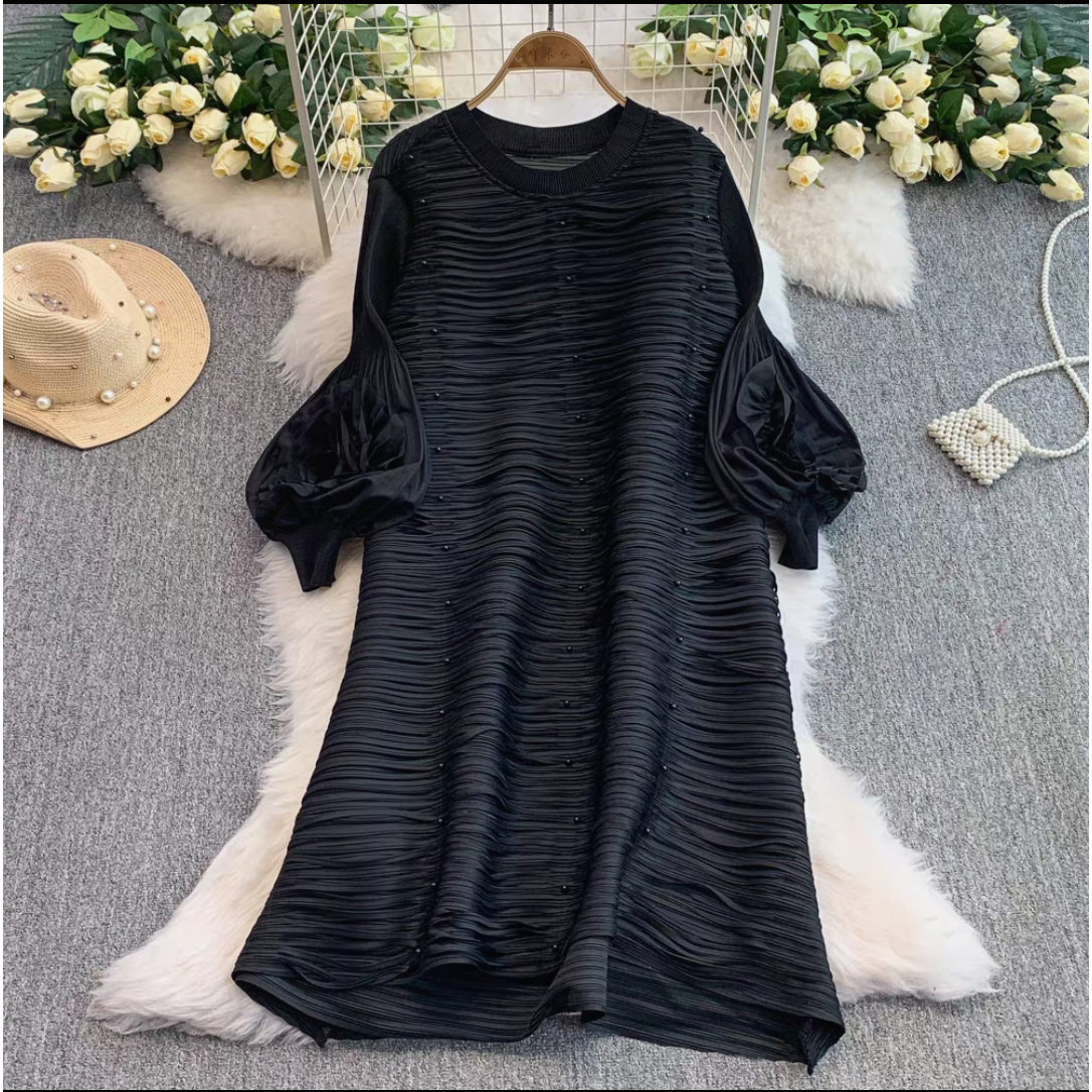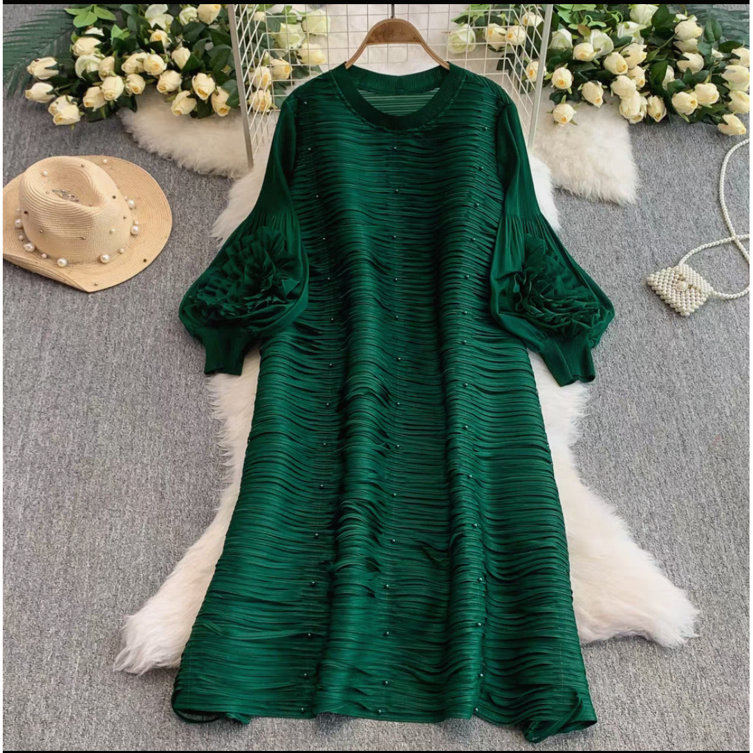 Miyake cross-border nail bead hollow tassel plate flower pleated high-end European and American plus size round neck heavy industry lantern sleeve long skirt for women