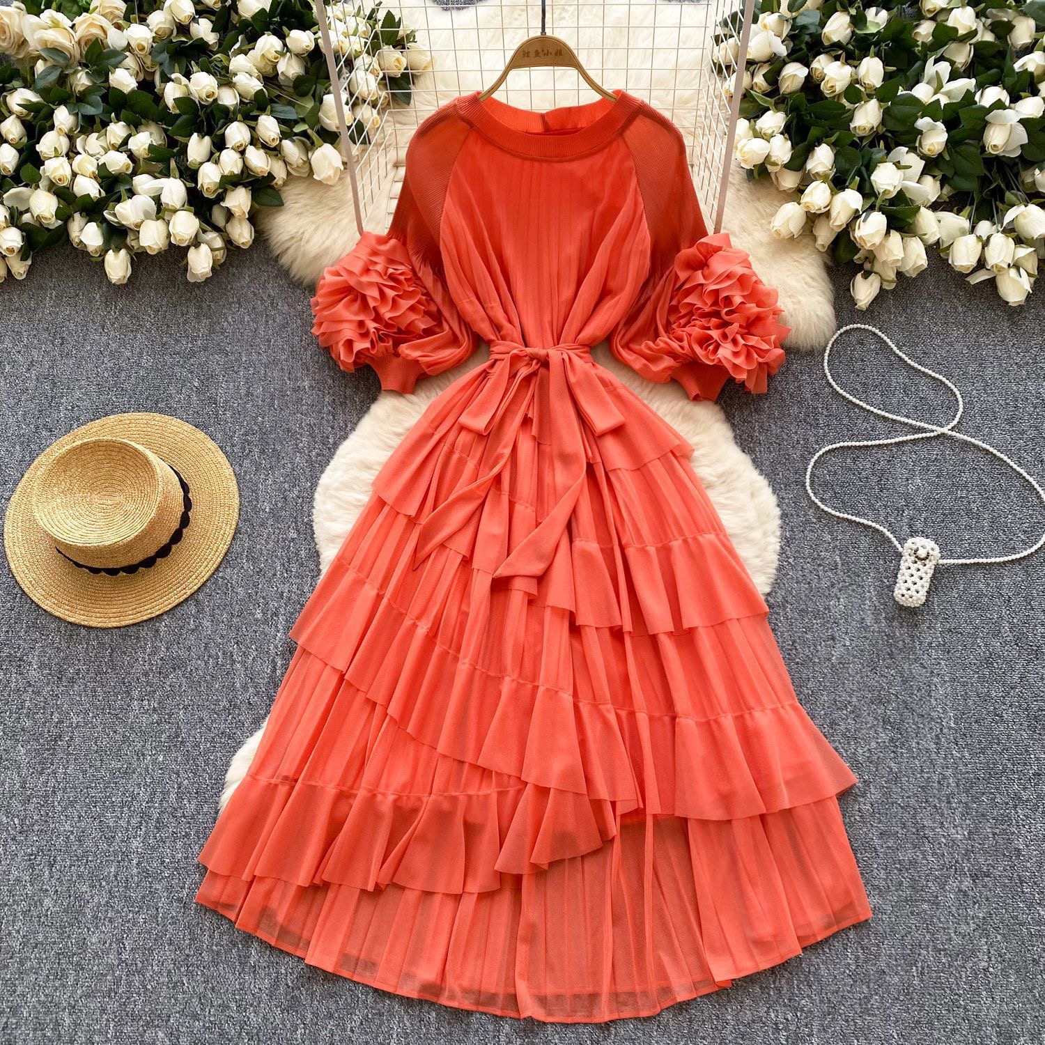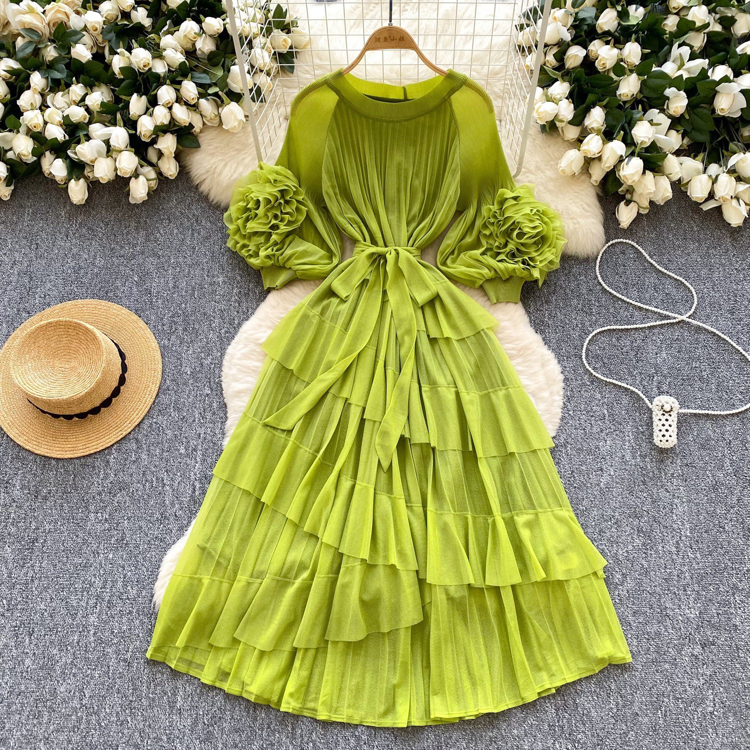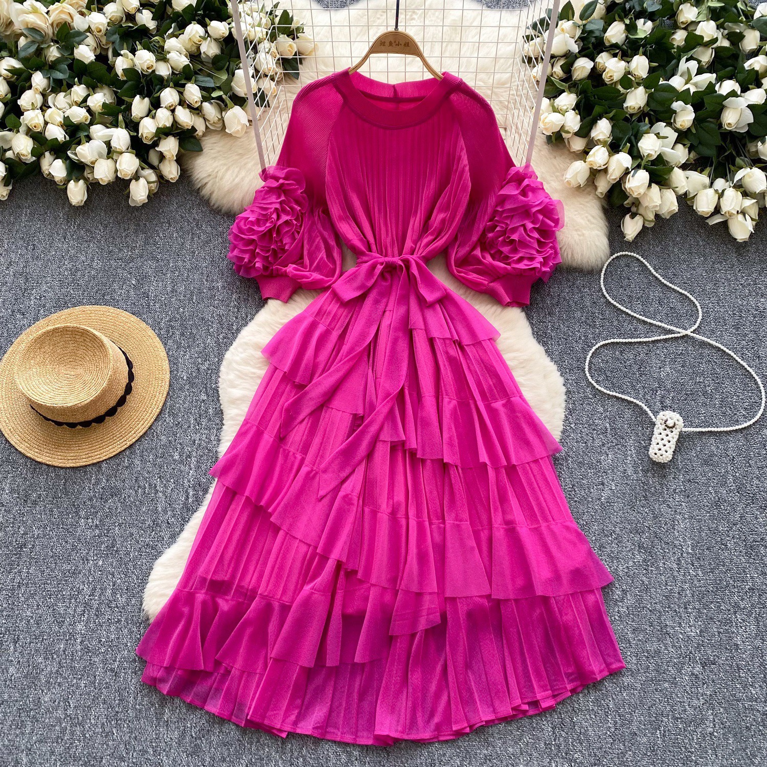 Miyake European and American retro palace style design with bubble sleeves, hand waving flower round neck, large size pleated, foreign trade cross-border women's clothing