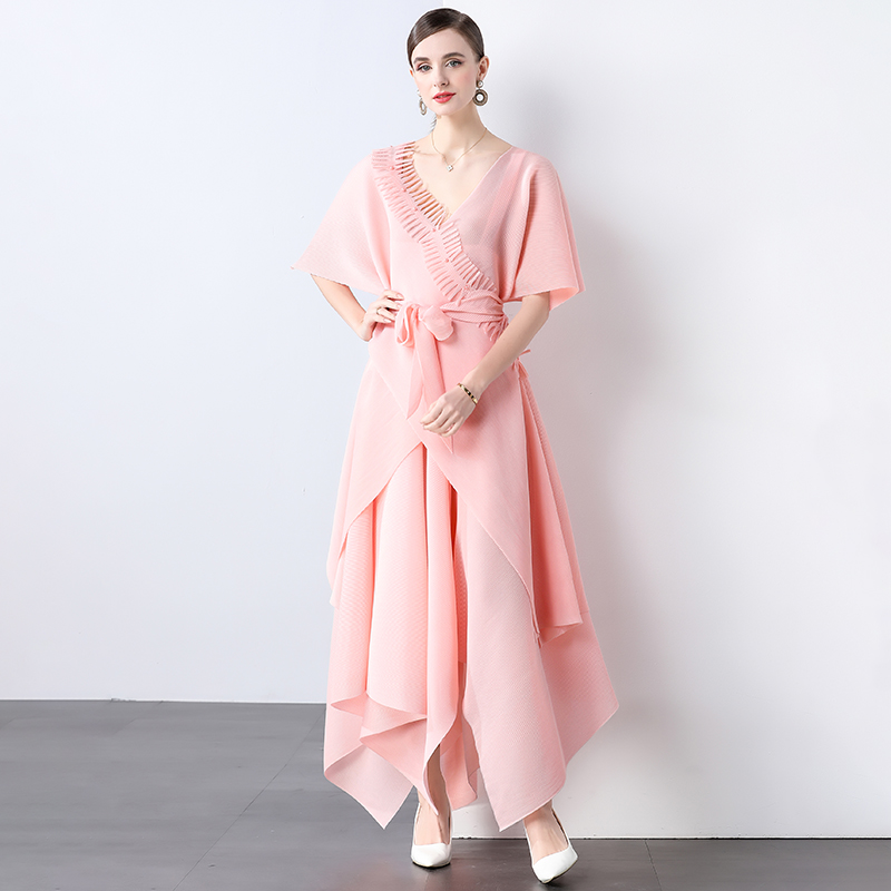 Miyake Foreign Trade Design Jacket Strap Fashion Loose Nail Bead tassel Irregular Wrinkle Solid Color V-neck Set