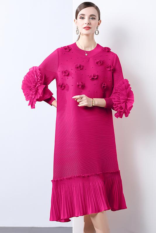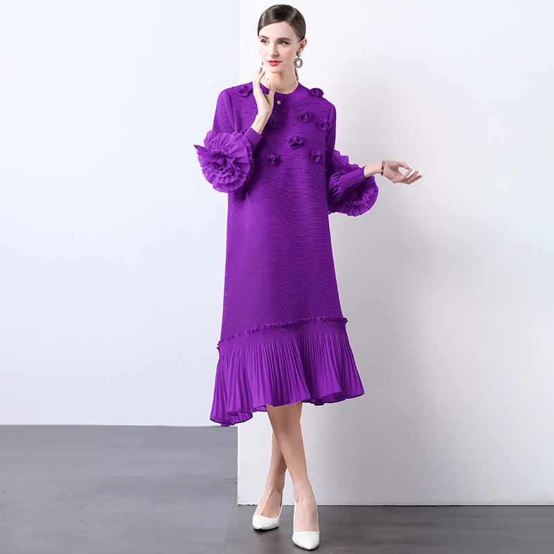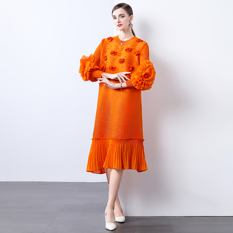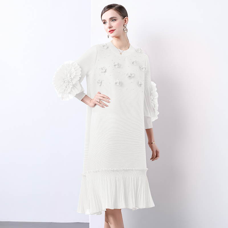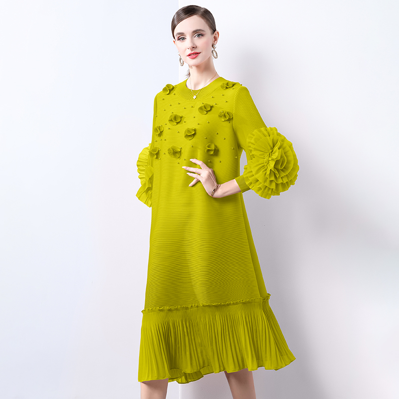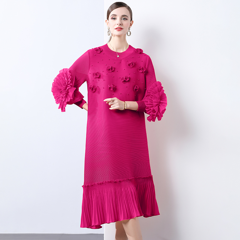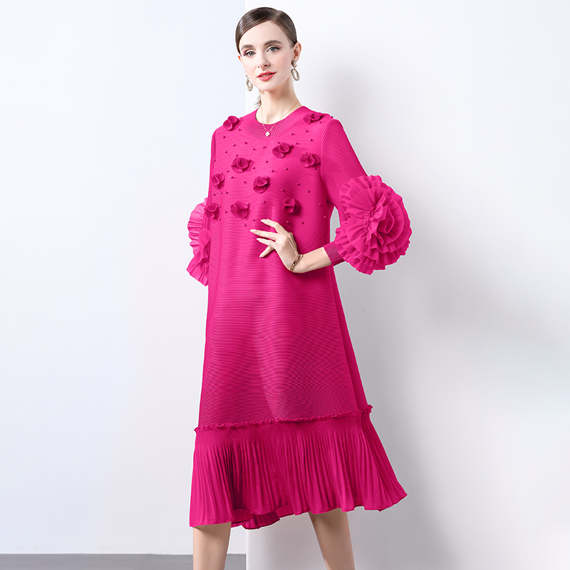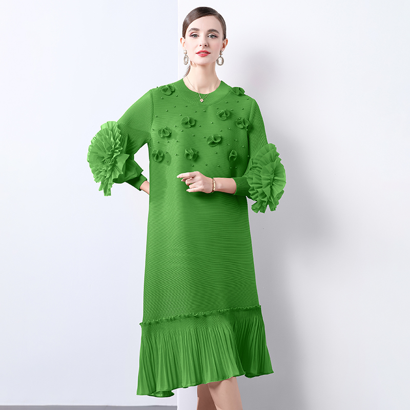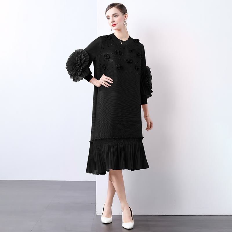 Miyake Foreign Trade Lotus Leaf Skirt Plate Flower Sleeve Three Dimensional Flower Decoration Wrinkle A-line Skirt Nail Bead Design Sense Women's Long Skirt