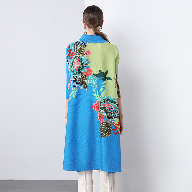 Miyake Chinese style lapel set with diamond print mm outfit with seven quarter sleeves and loose button pleats, shaking skirt, women's dress