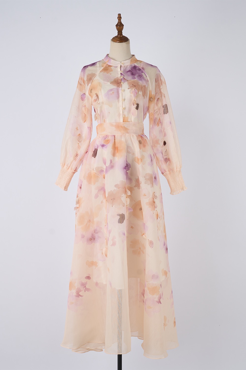 Real shooting new floral print women's shirt+waist cinching slimming A-line skirt set