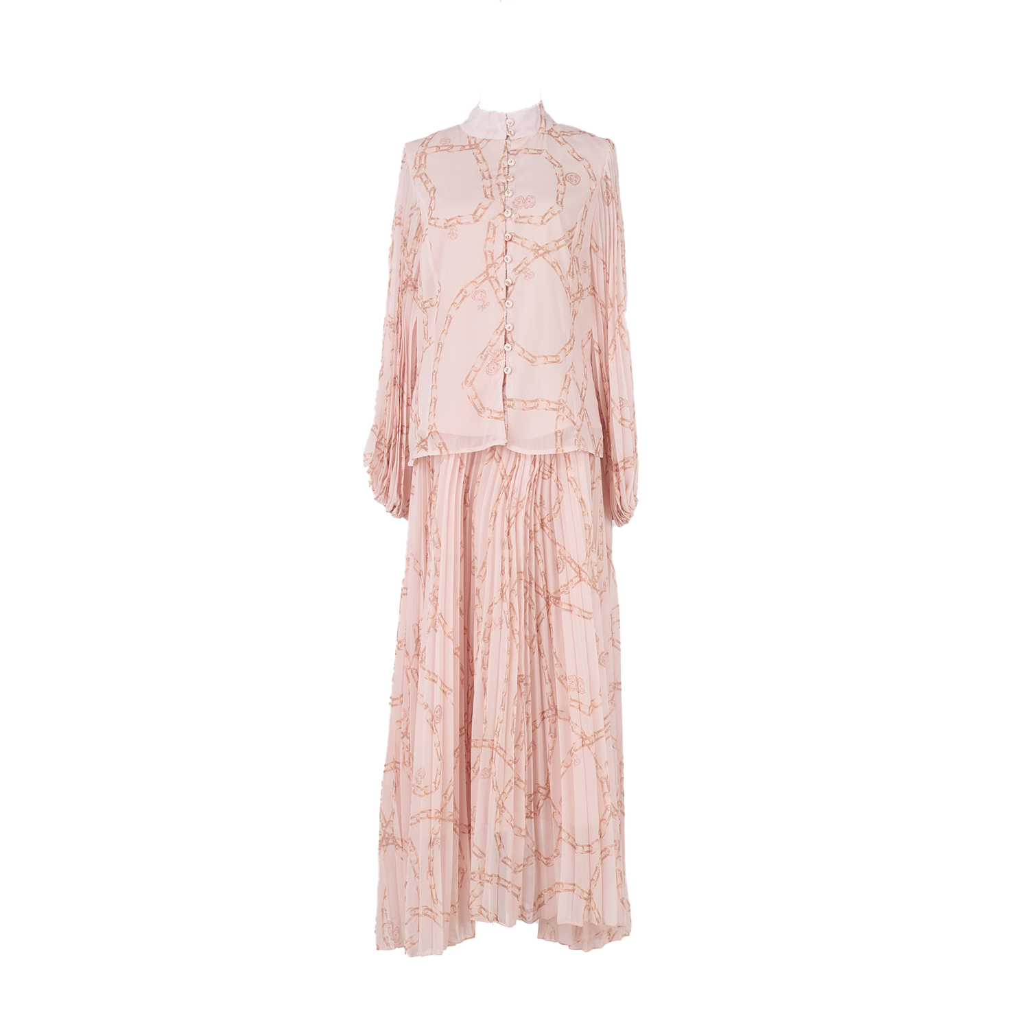 Real time photo of pleated long sleeved shirt paired with skirt set, oversized skirt and elastic waist set