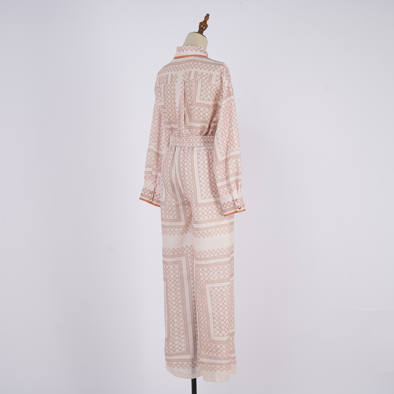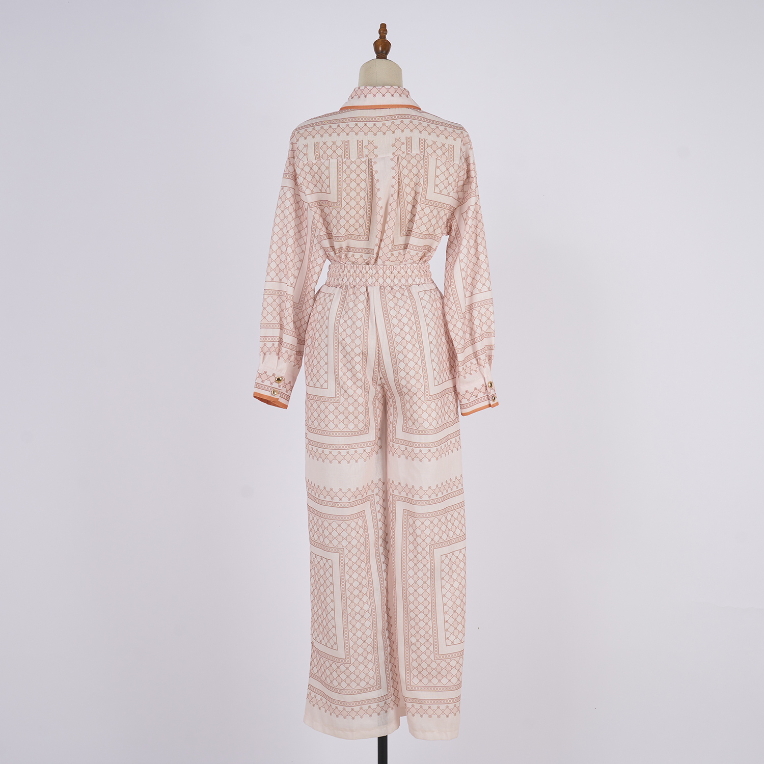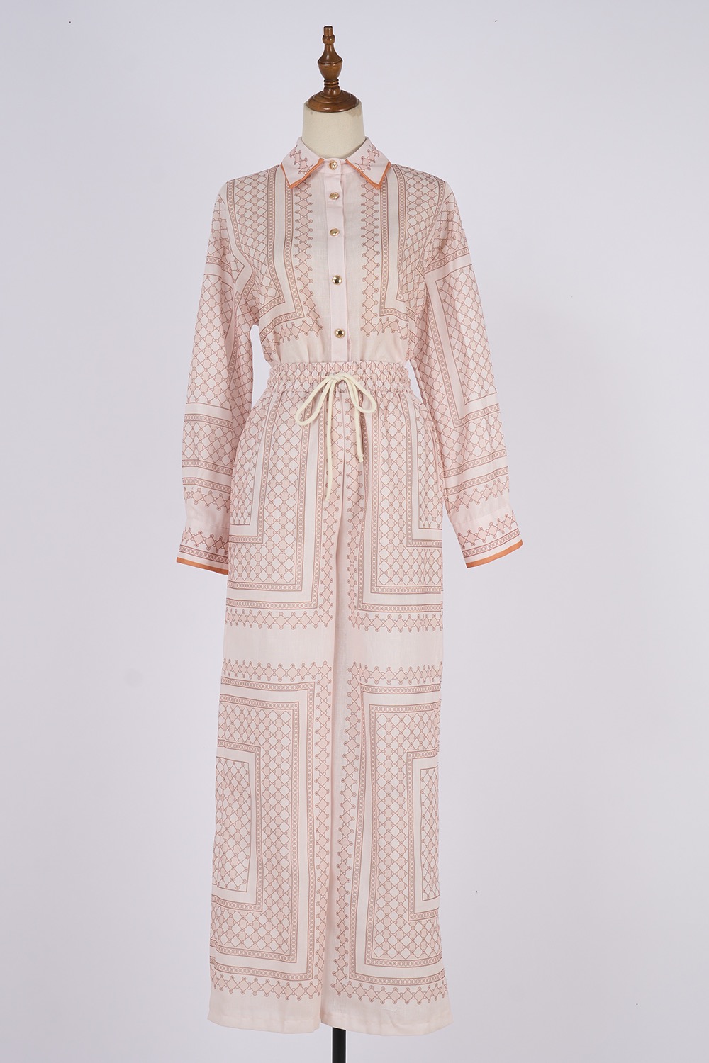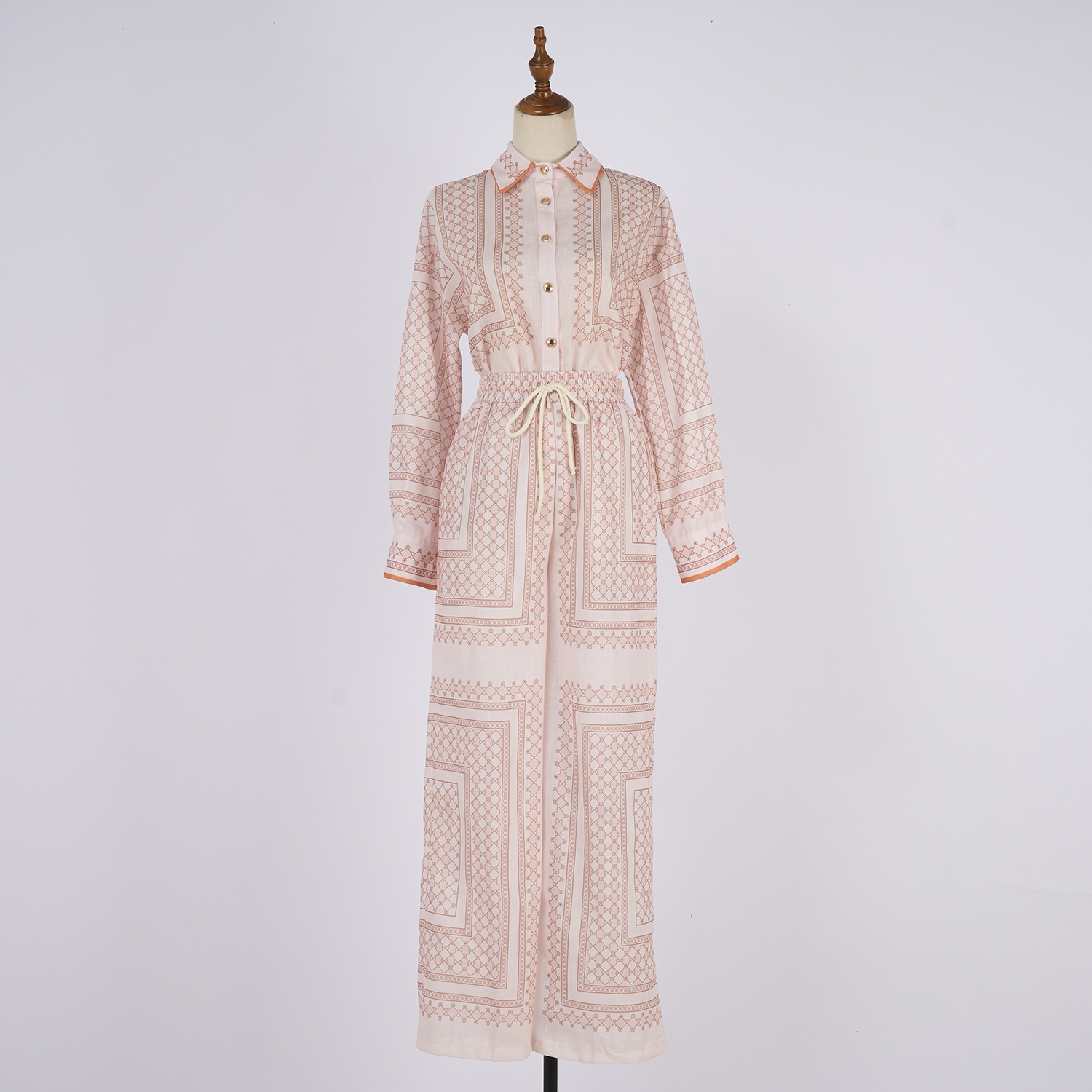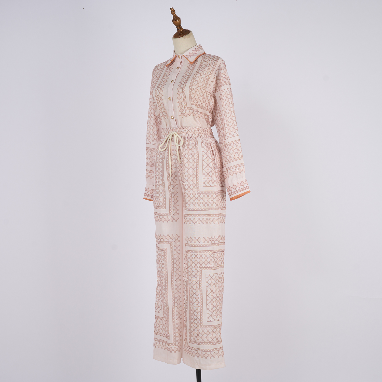 Realistic shooting of 2025 autumn new ramie cream colored geometric printed pattern slim fit shirt set