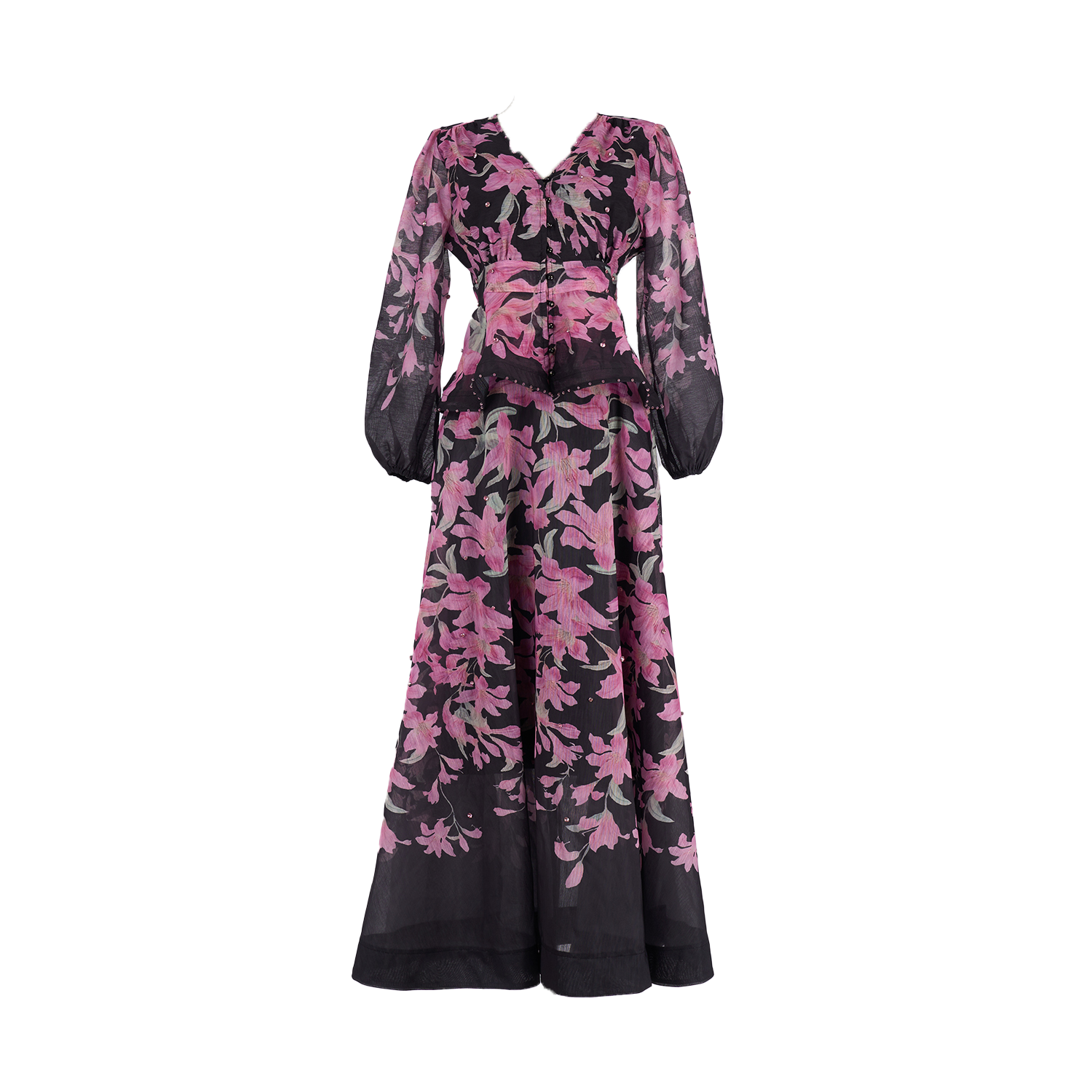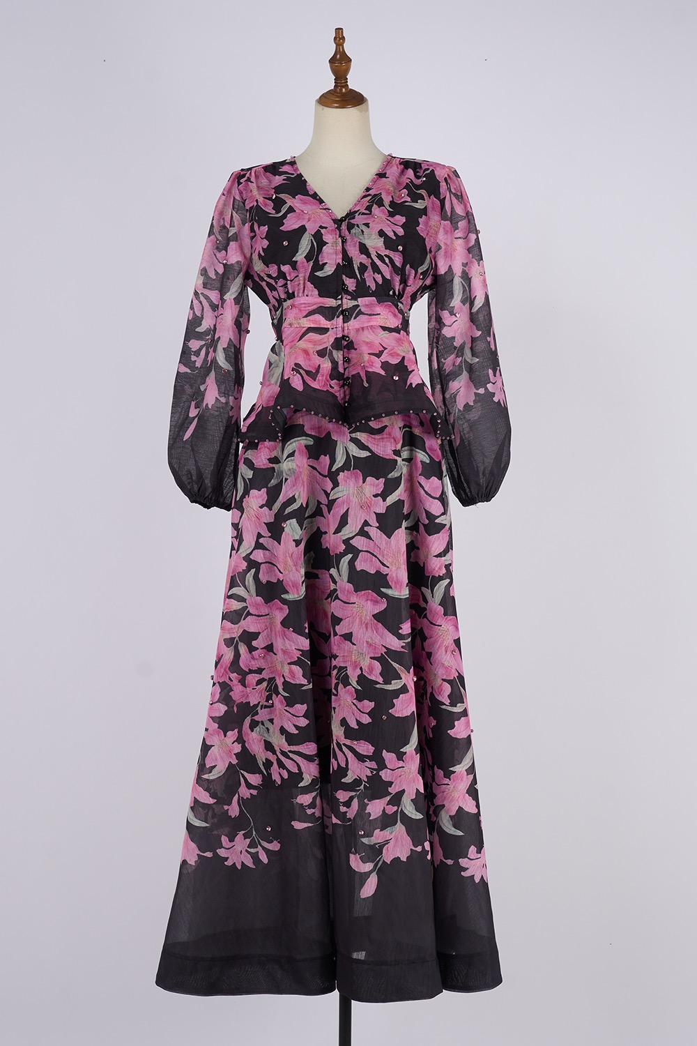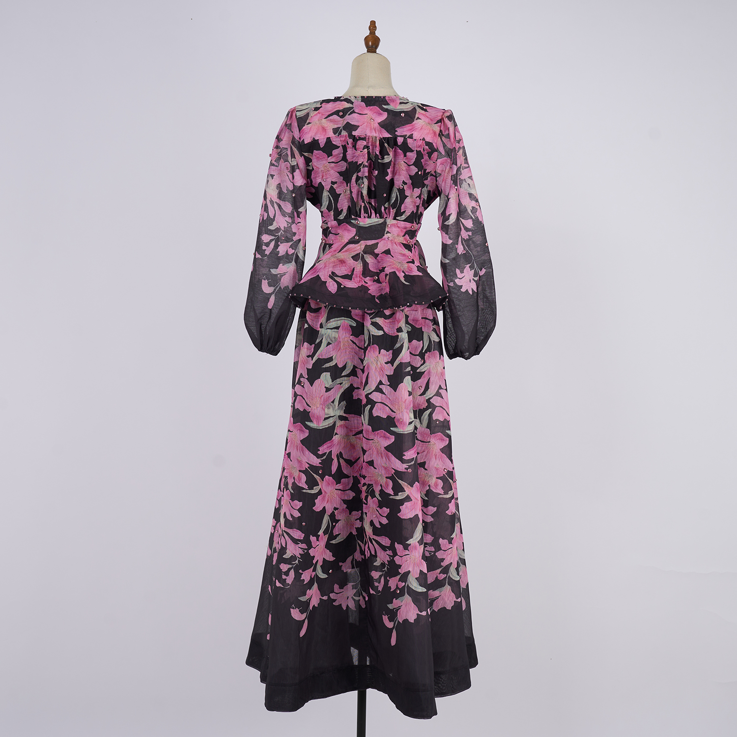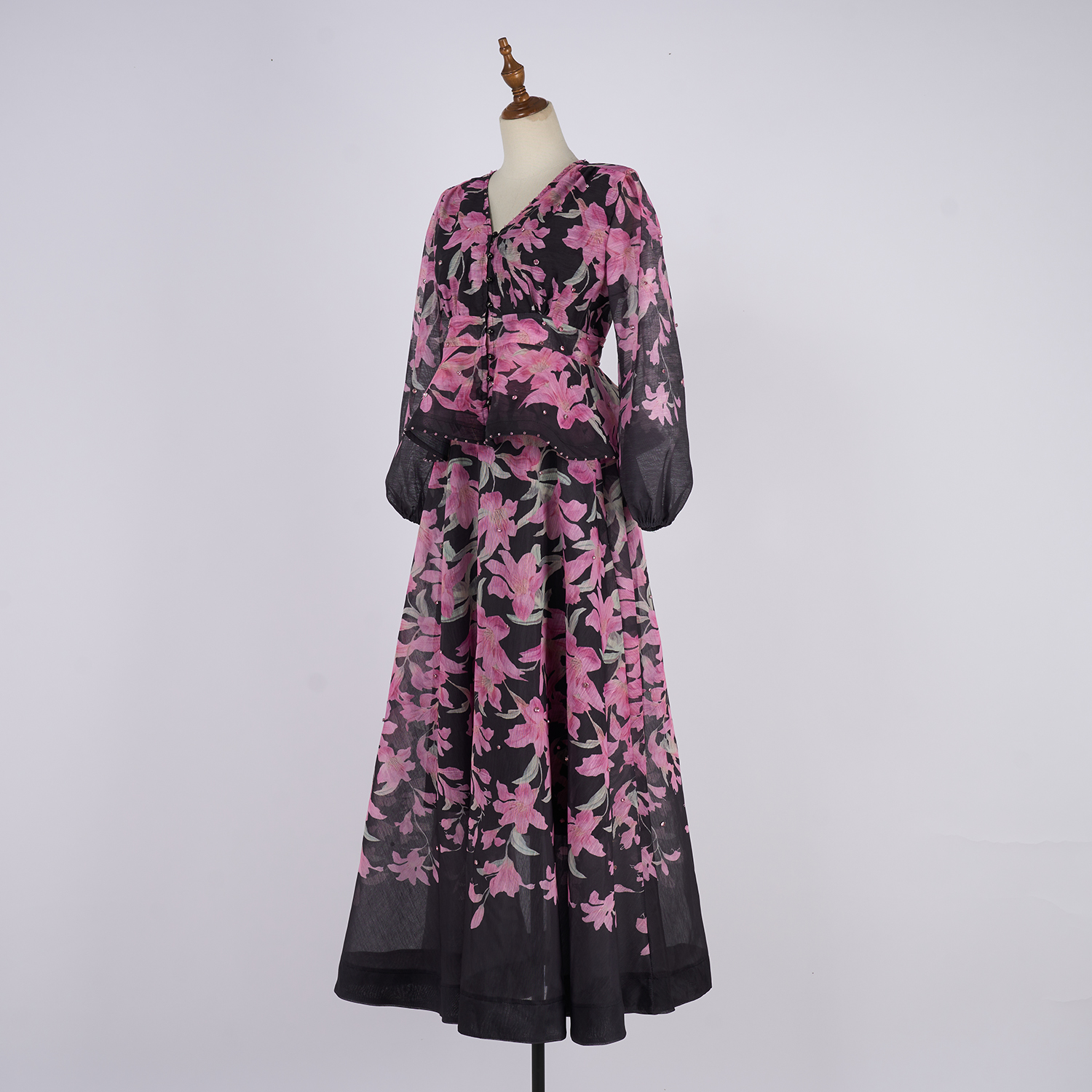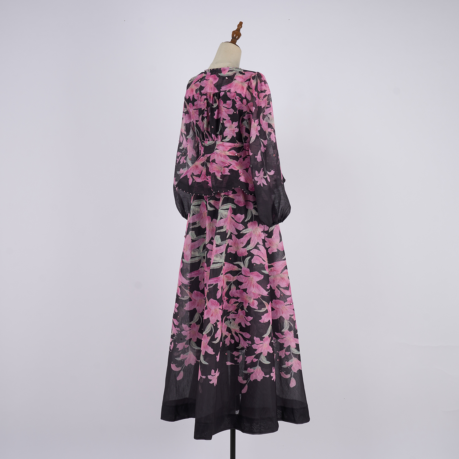 Real shooting of 2025 vacation style new Tencel hemp stand collar patterned button design long suit dress