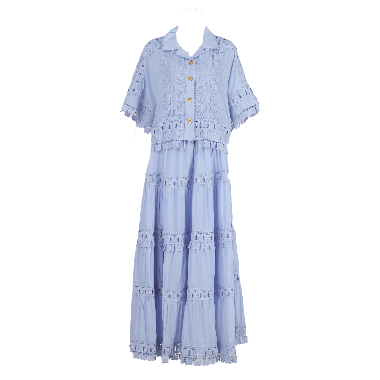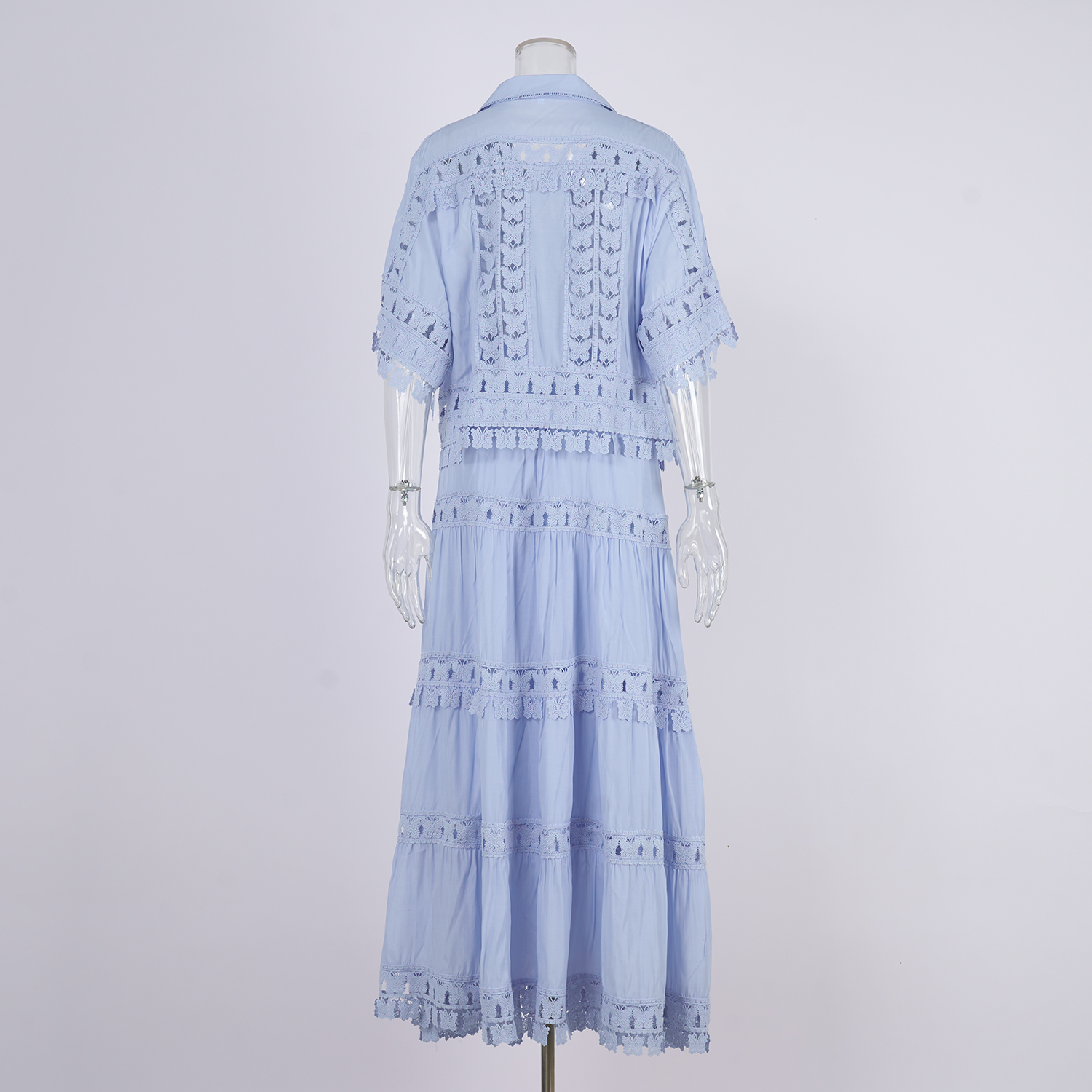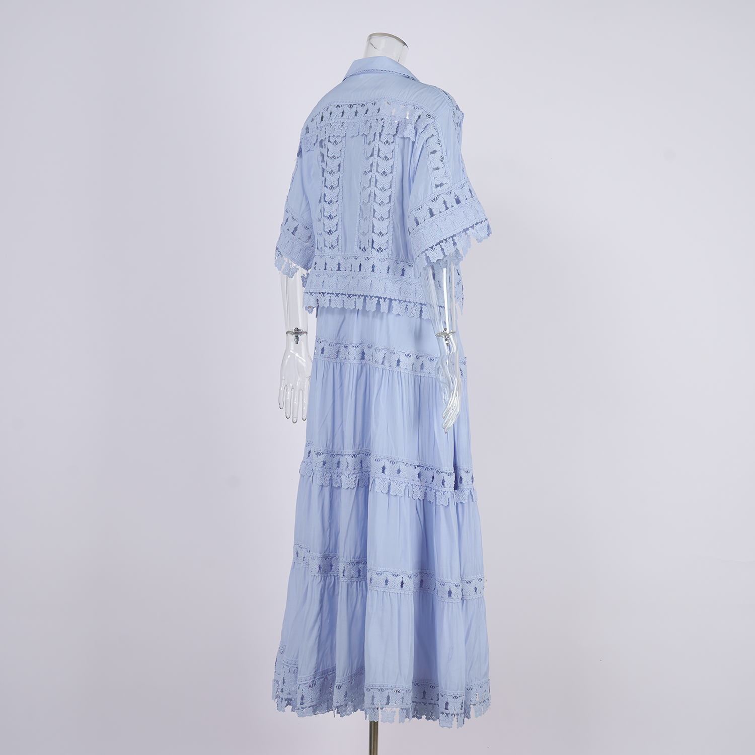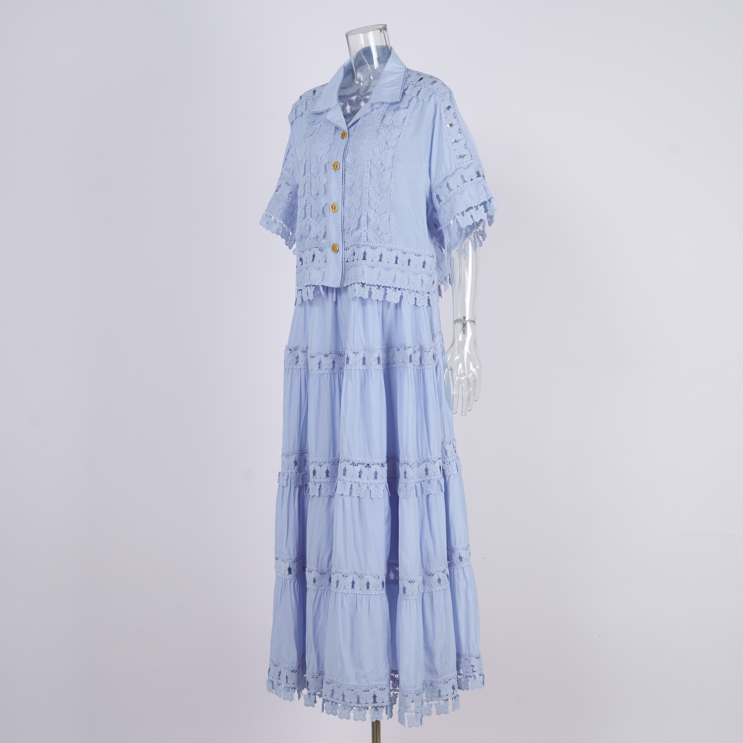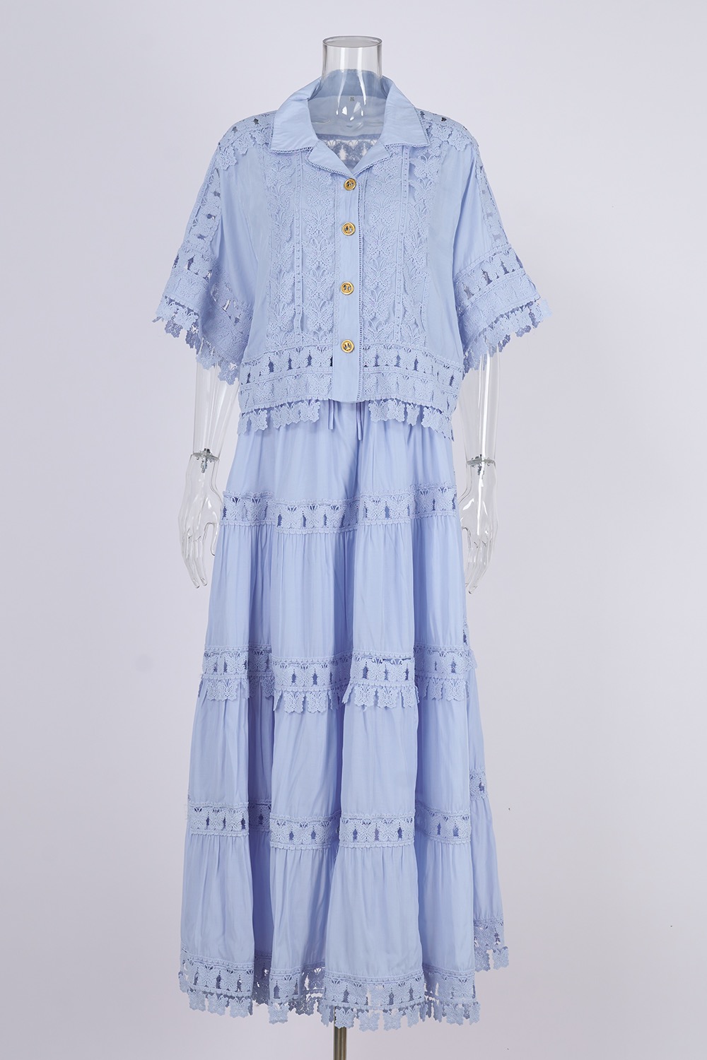 Real shot French retro summer new style lapel embroidered lace long shirt+skirt set for women