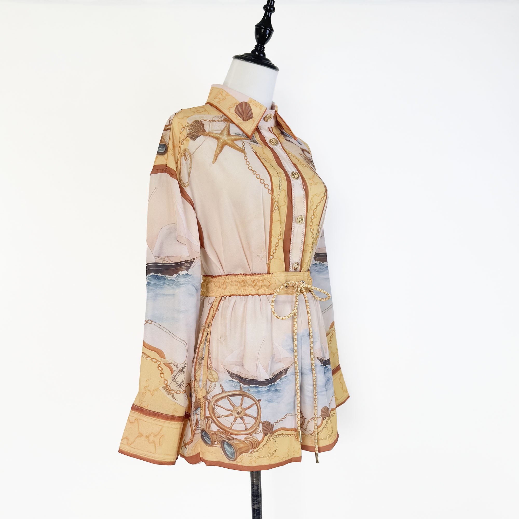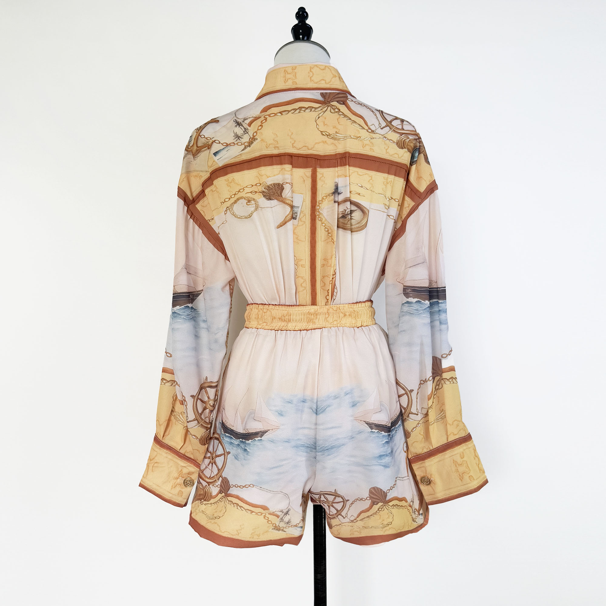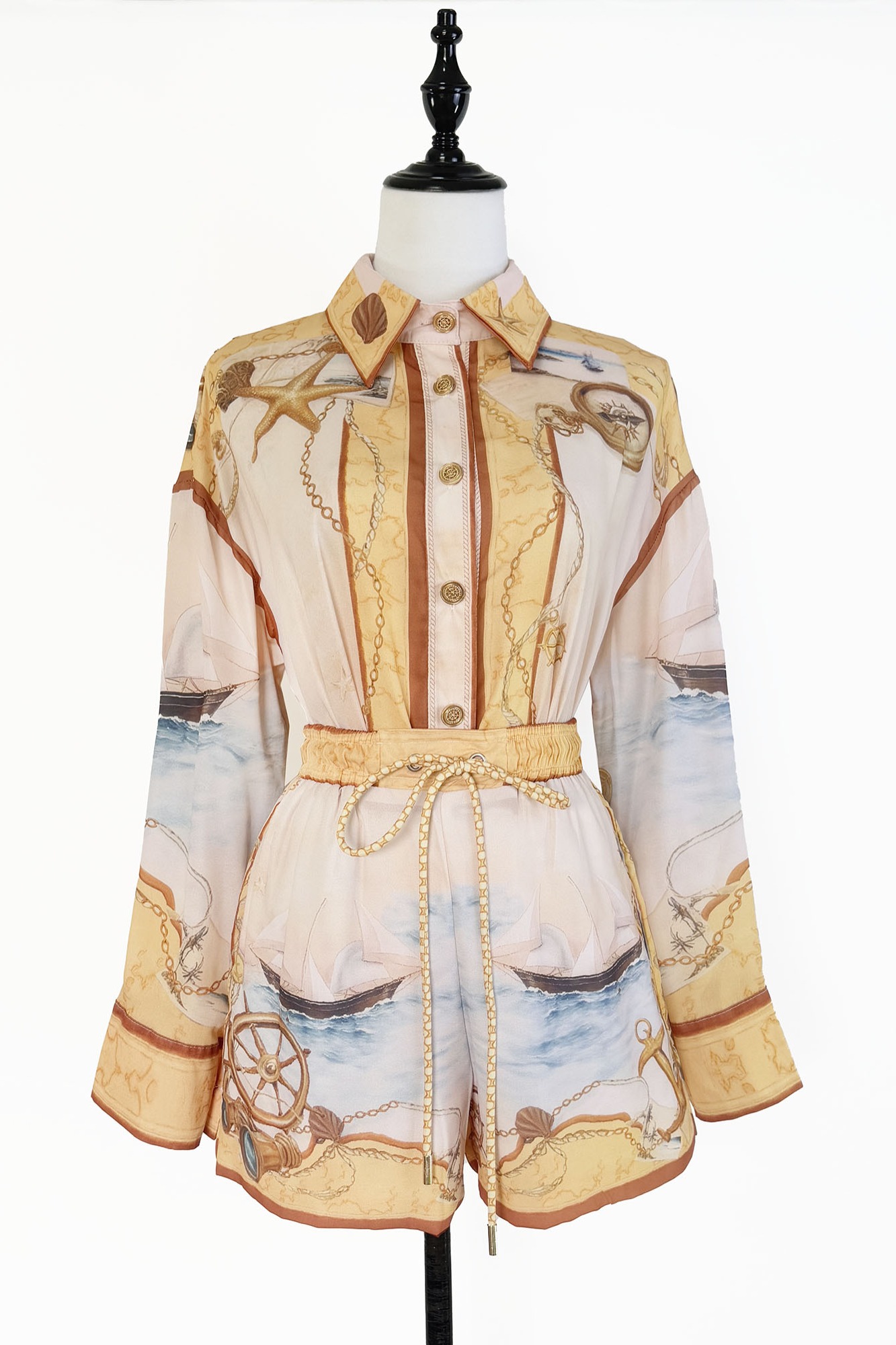 Real shot Australian light luxury niche yellow nautical print long sleeved loose shirt+drawstring shorts set for women