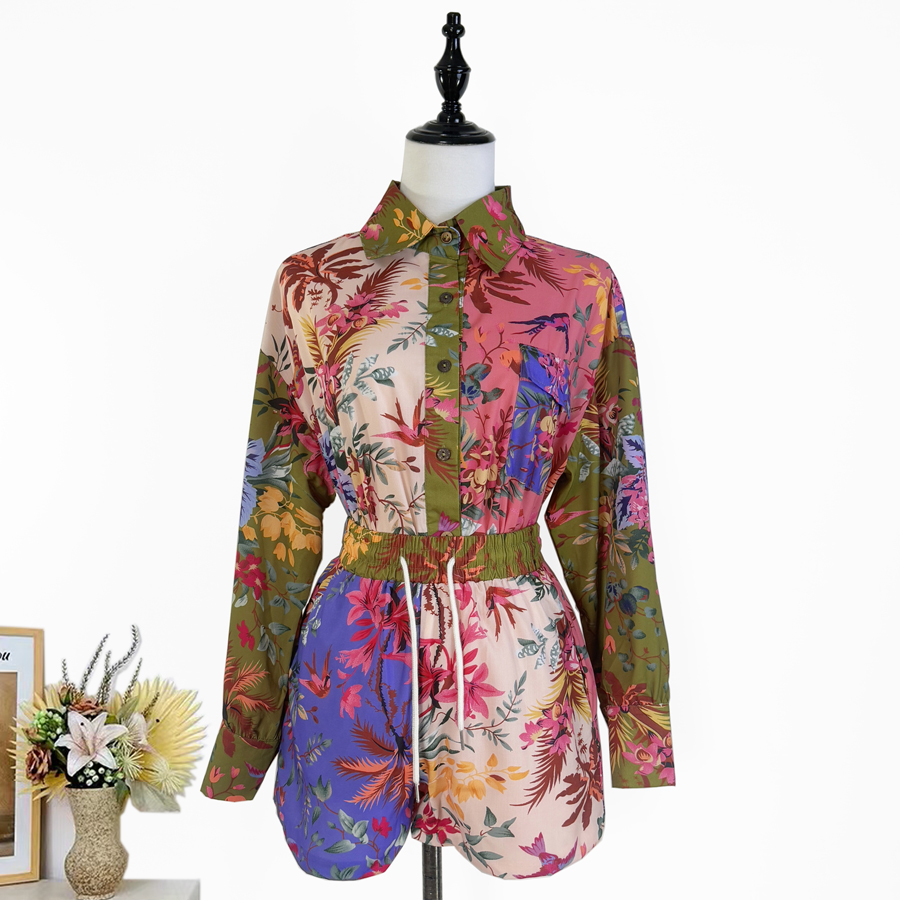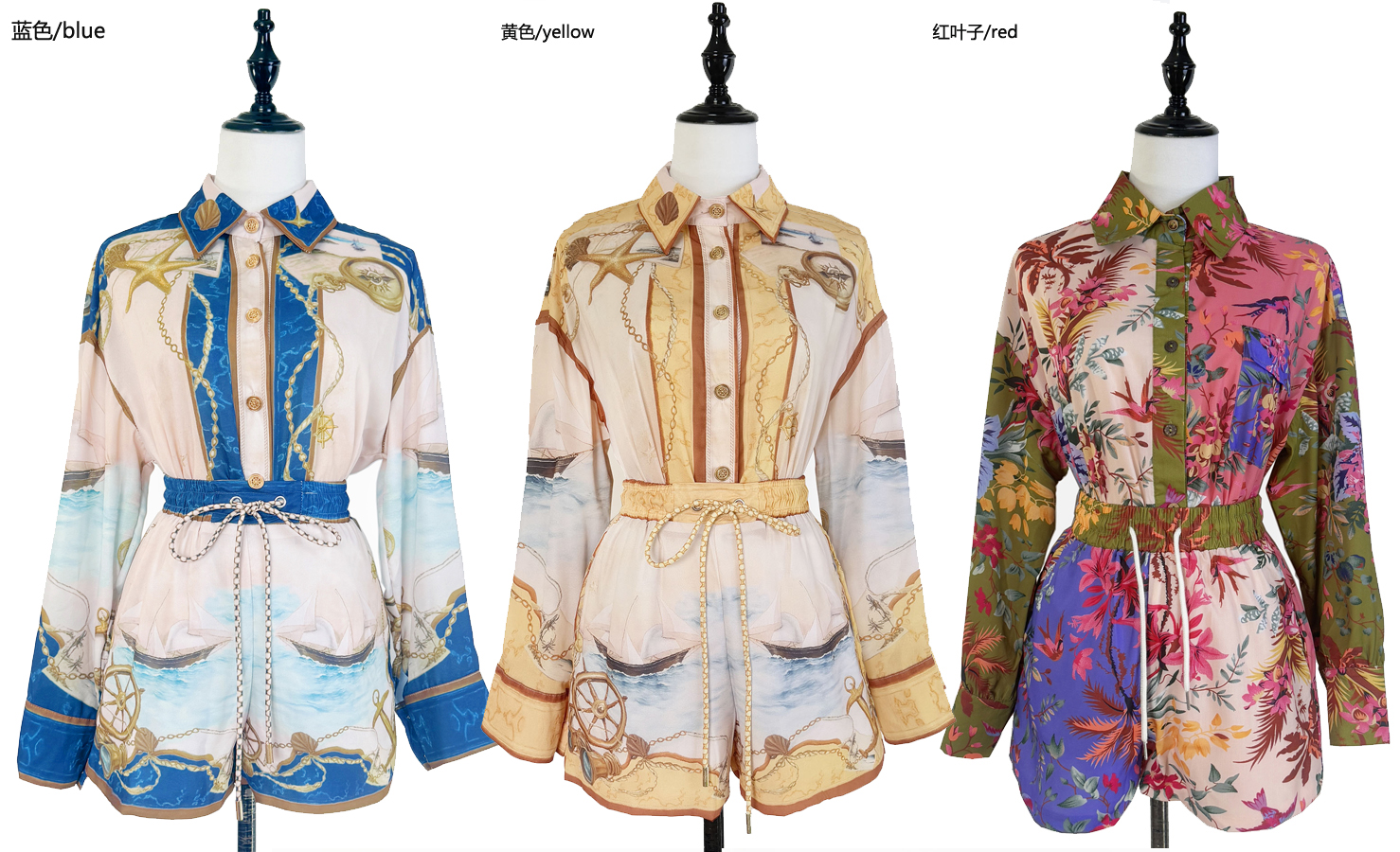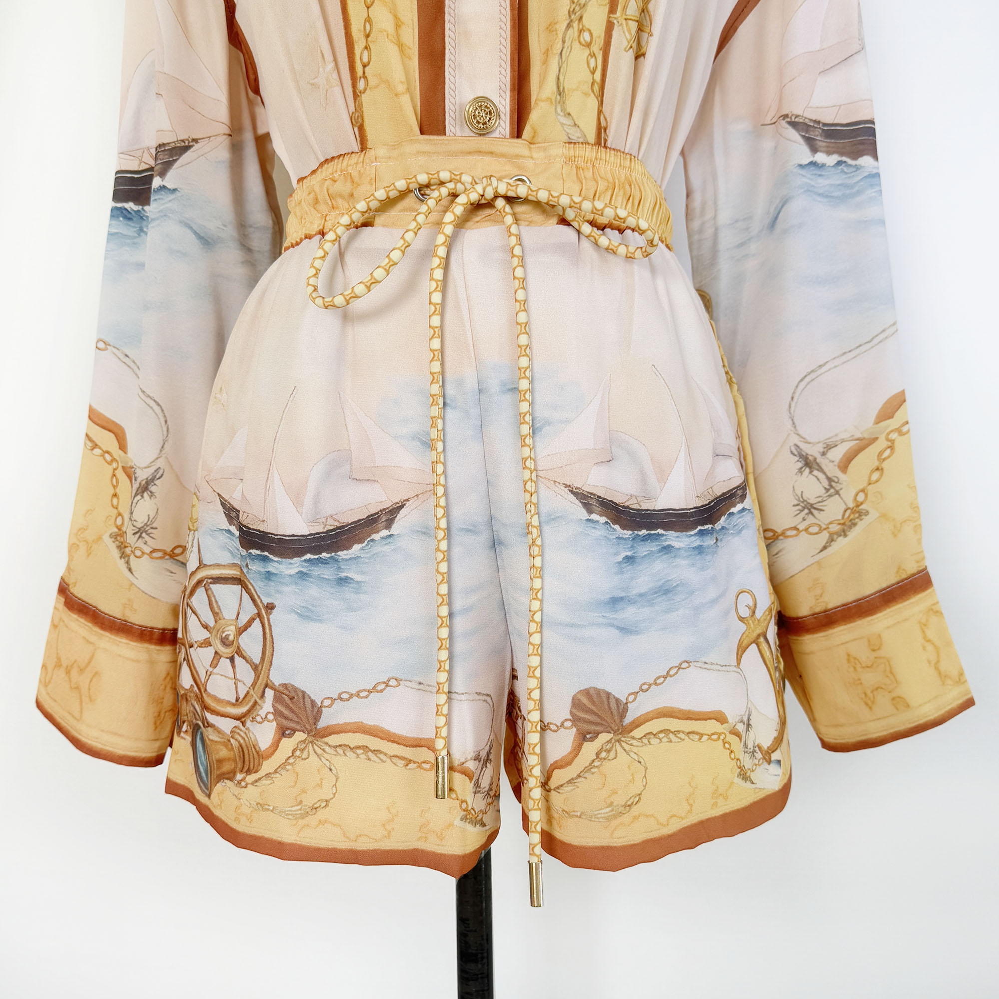 Real shot Australian light luxury niche yellow nautical print long sleeved loose shirt+drawstring shorts set for women